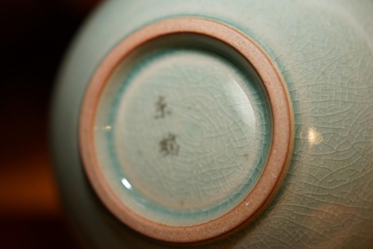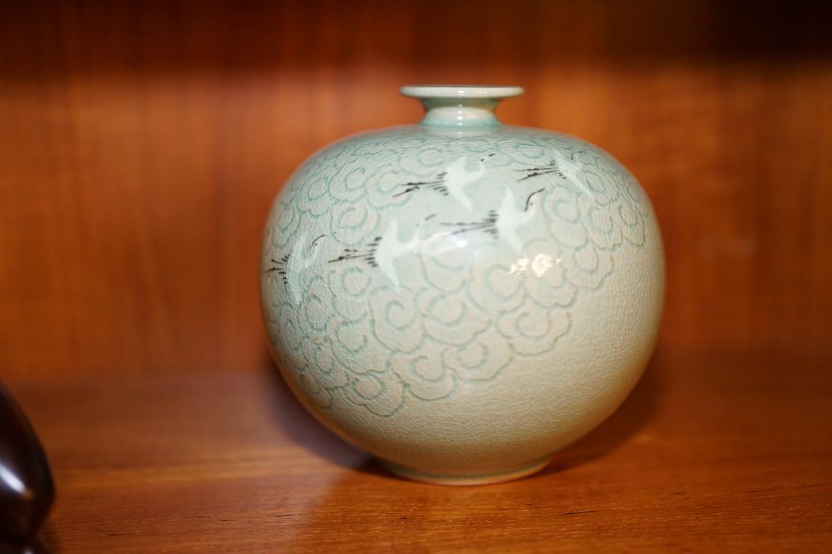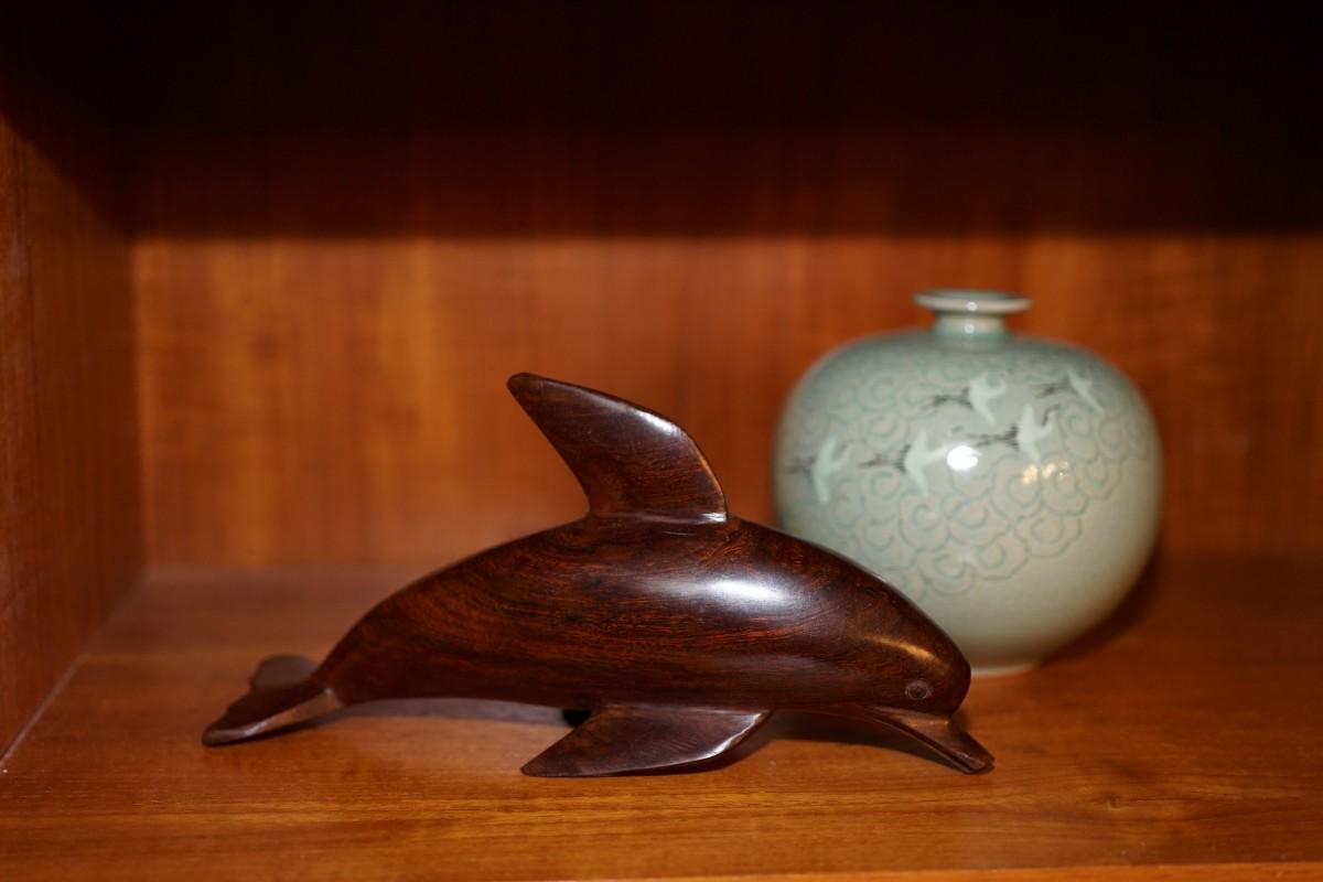 KOREAN CELADON ROUND VASE WITH CRANES/ CARVED MAHOGANY DOLPHIN