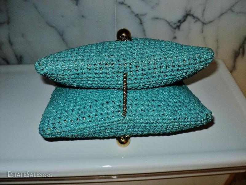 Rare and amazing bag. All crochet with leather inside and the iconic Koret name in gold The handle are gold overlay with emerald bamboo and gold hardware.some lightening of the aqua crochet but it blends in .