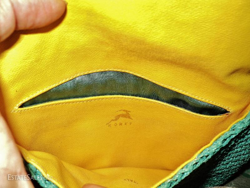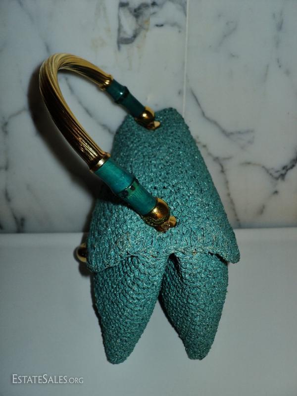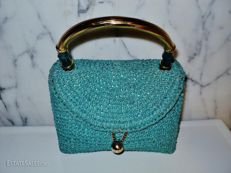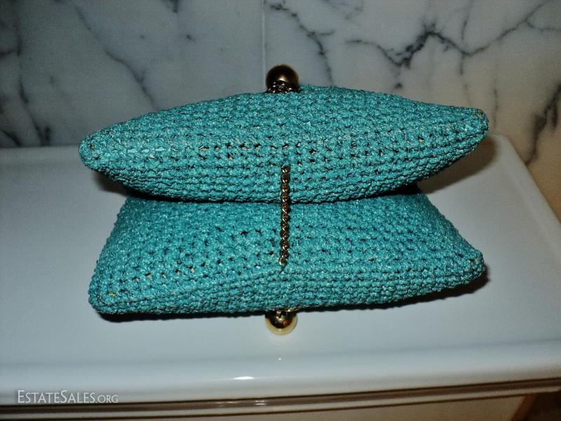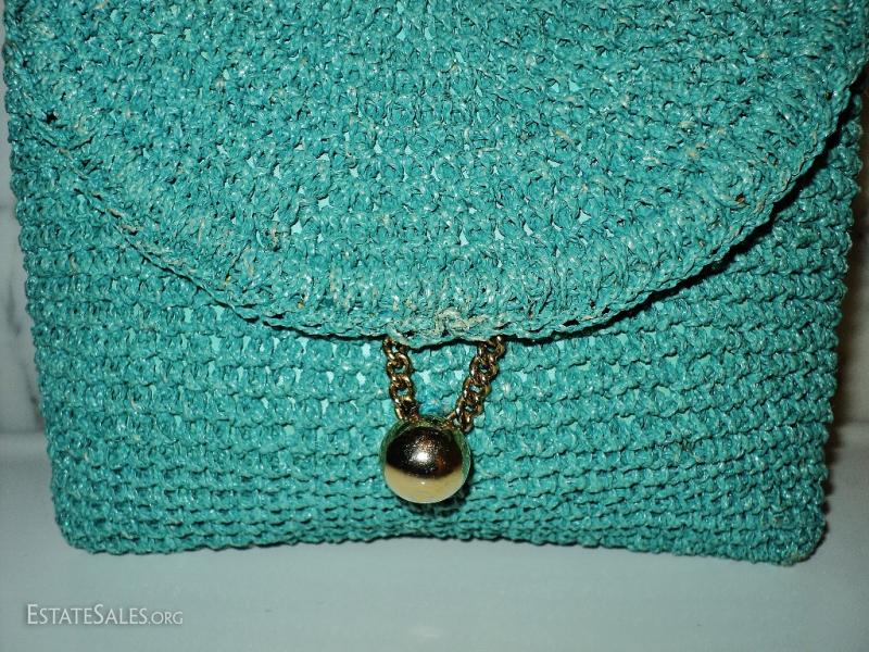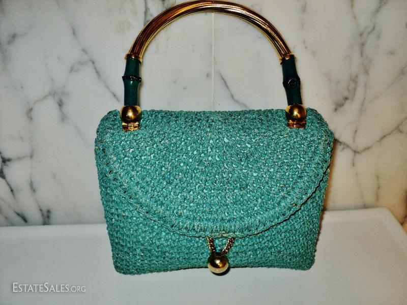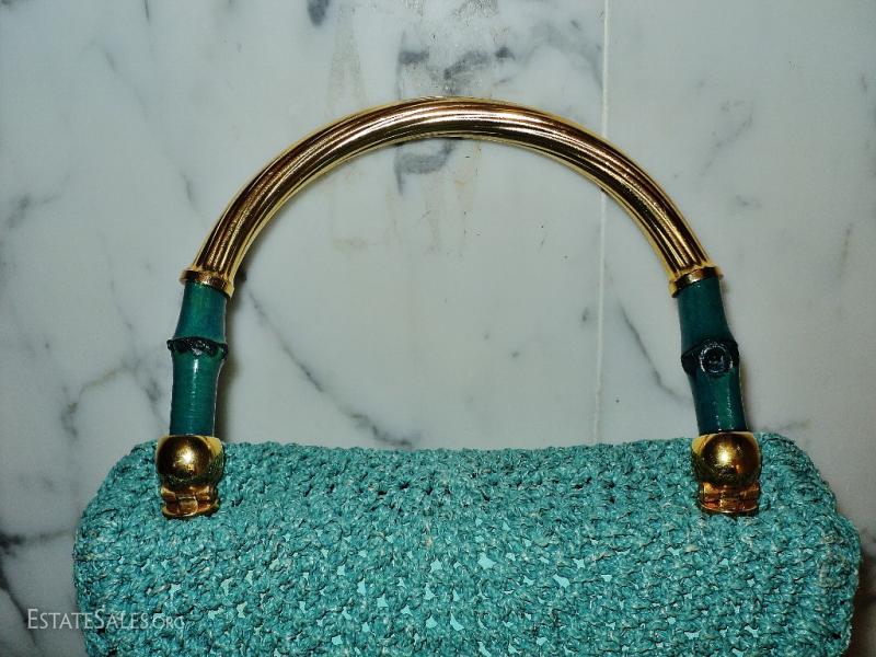 Rare and amazing bag. All crochet with leather inside and the iconic Koret name in gold The handle are gold overlay with emerald bamboo and gold hardware.some lightening of the aqua crochet but it blends in .