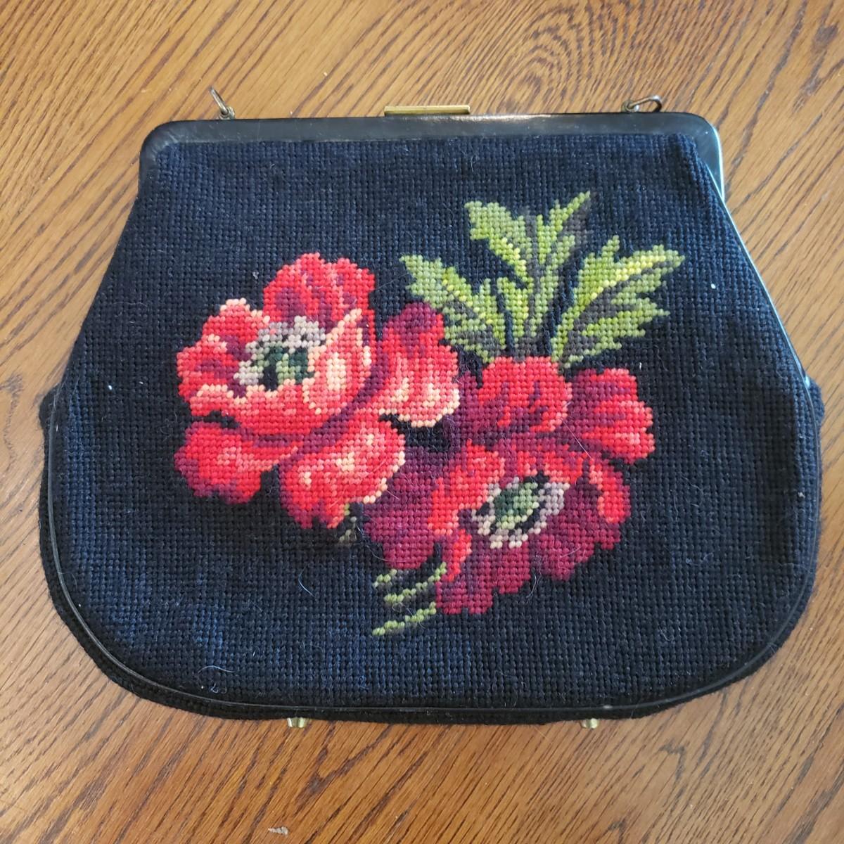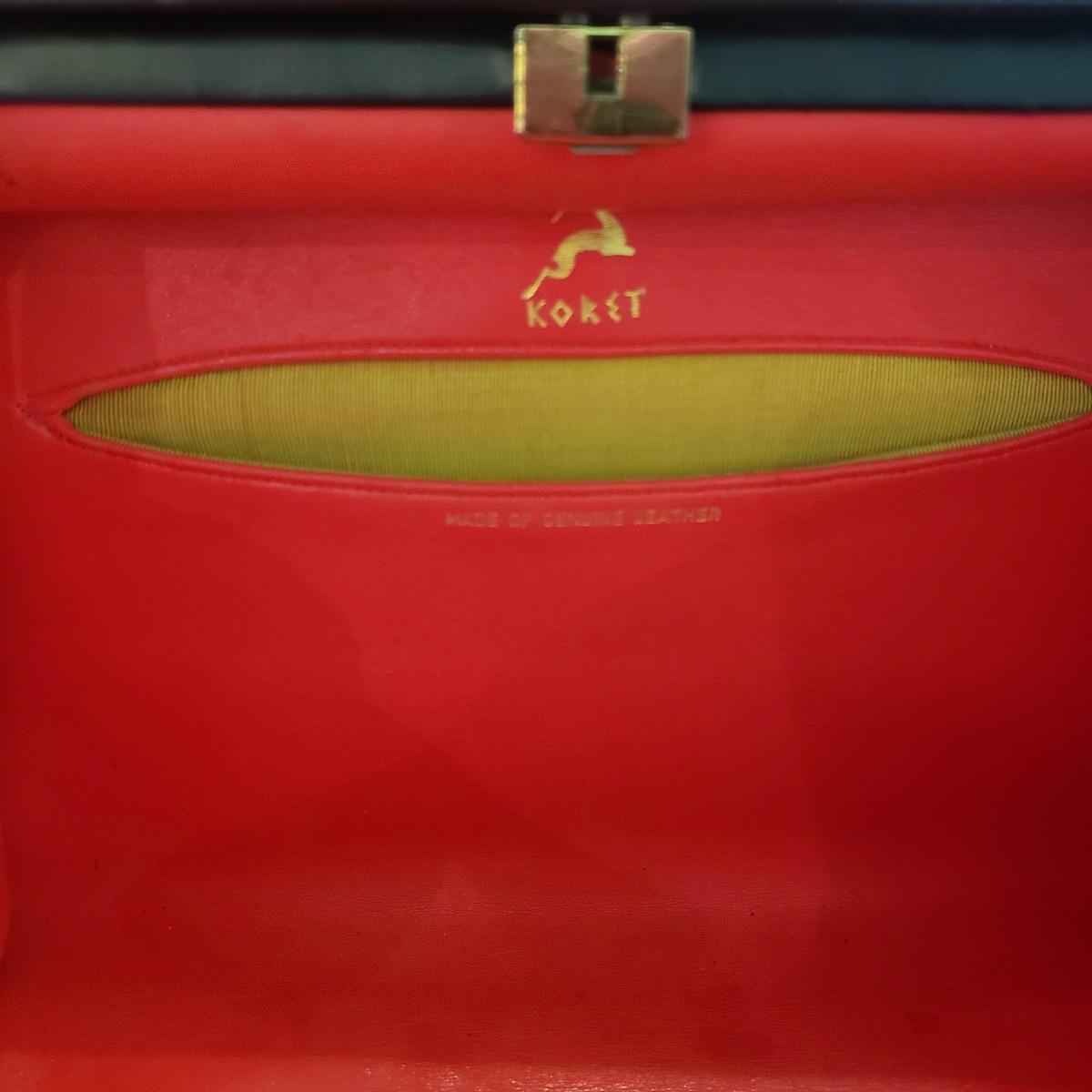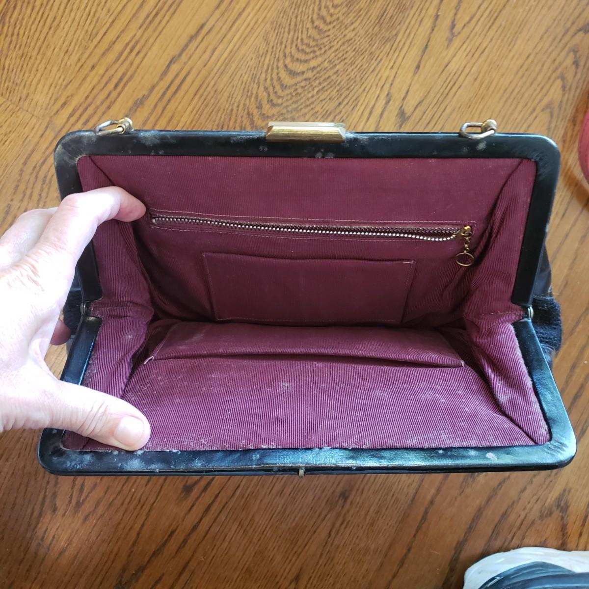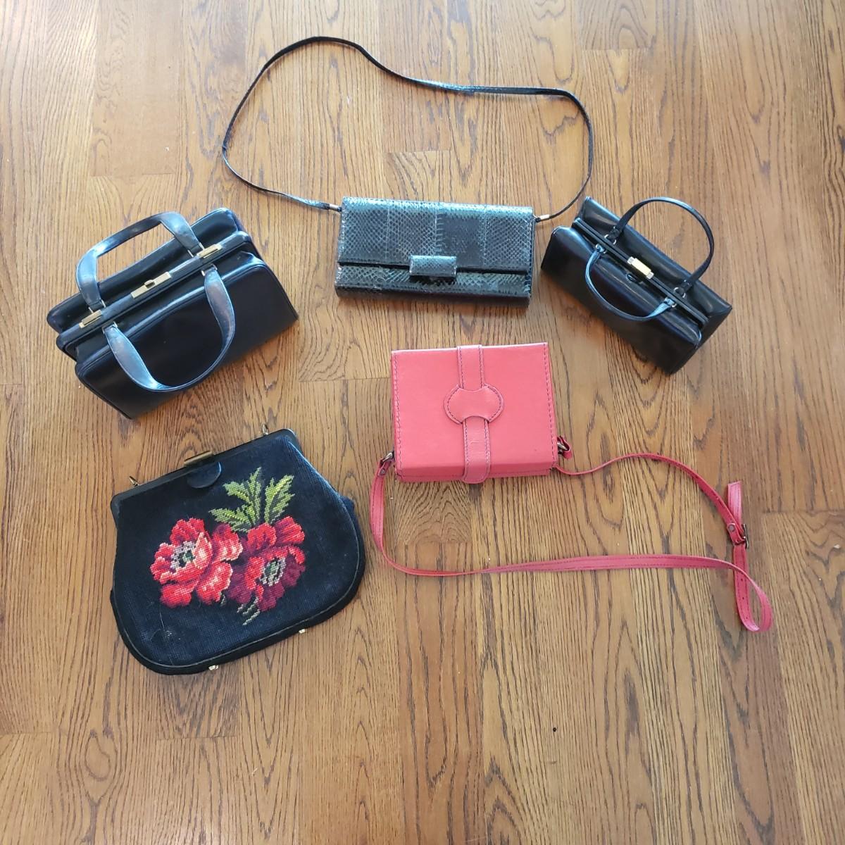 These five vintage style purses have a larger and smaller Koret purses in this lot. The larger Koret purse measures 10" x 3" x 7"H. The faux reptile shiny black purse by Whiting & Davis has its snap cover peeling off. It comes with two interchangeable snap covers. The black embroidered red flower purse is missing its strap. Overall condition issues due to age. All the purses could use a good cleaning.
