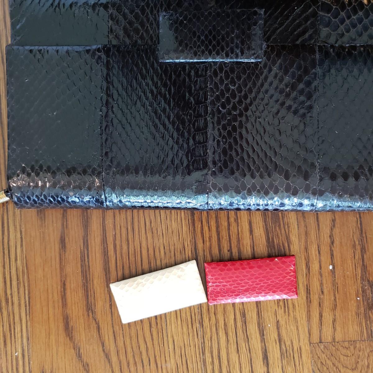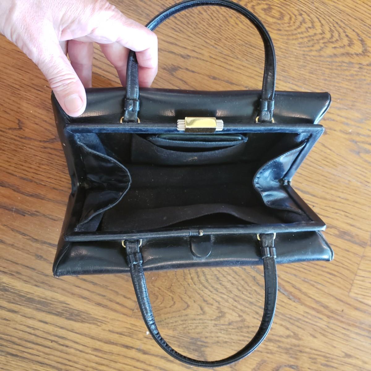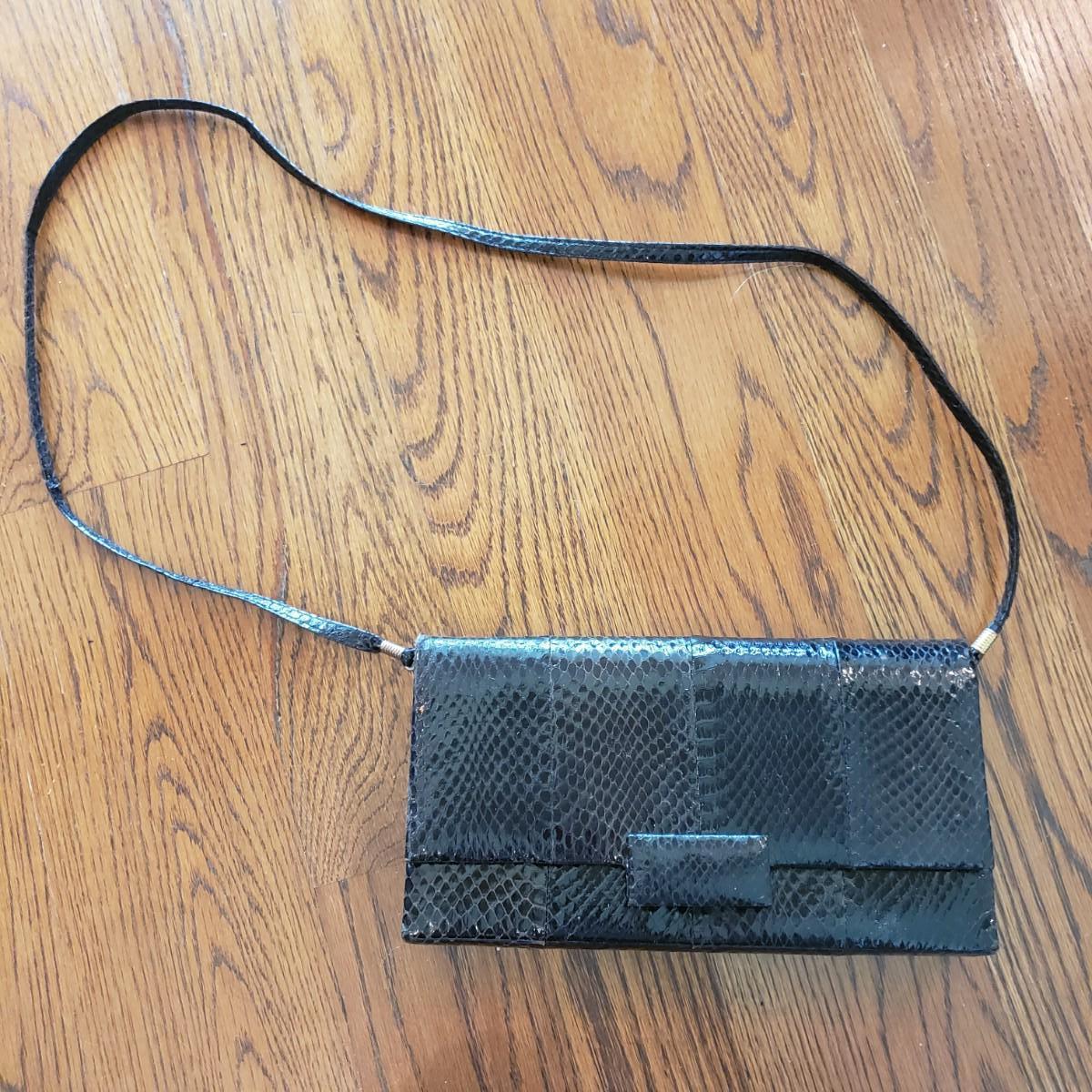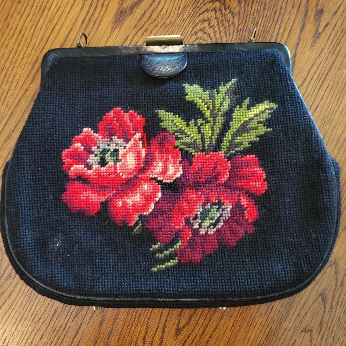 These five vintage style purses have a larger and smaller Koret purses in this lot. The larger Koret purse measures 10" x 3" x 7"H. The faux reptile shiny black purse by Whiting & Davis has its snap cover peeling off. It comes with two interchangeable snap covers. The black embroidered red flower purse is missing its strap. Overall condition issues due to age. All the purses could use a good cleaning.
