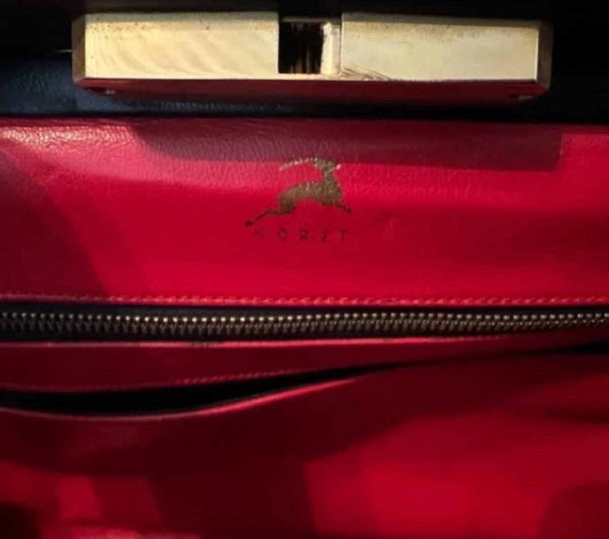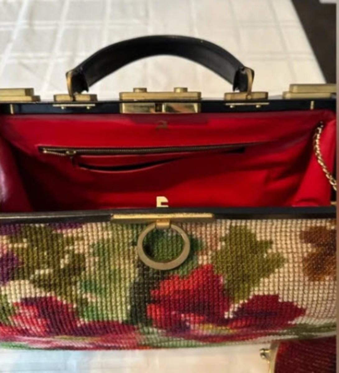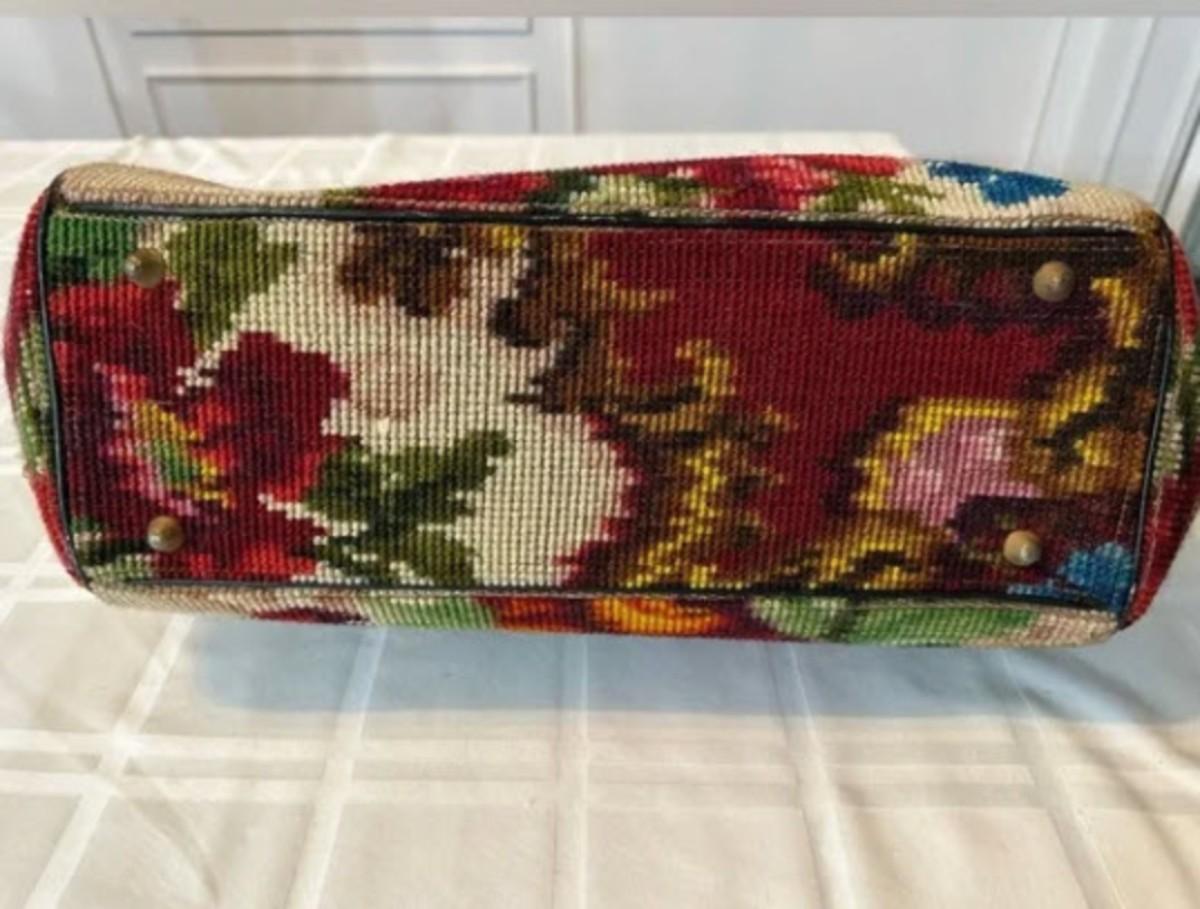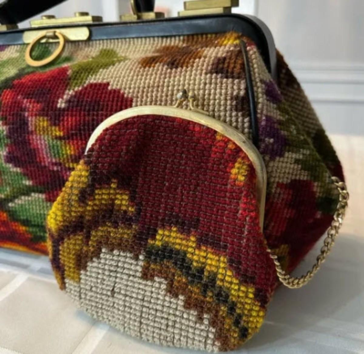 This luggage was made in Italy from actual needle point wool carpet. This Victorian style handbag is large and could be used as a carry on bag or a handbag. Single wide handle in red leather, the bag frame is covered in leather. Brass clasp closure. The interior is lined in soft untreated leather, it marks easily. There is a side open compartment with a large brass frame kiss lock top leather purse that is attached with a gold chain. Perfect for valuables, there are marks on the interior from coins. The bag has brass feet on the bottom. In very good pre-owned condition.