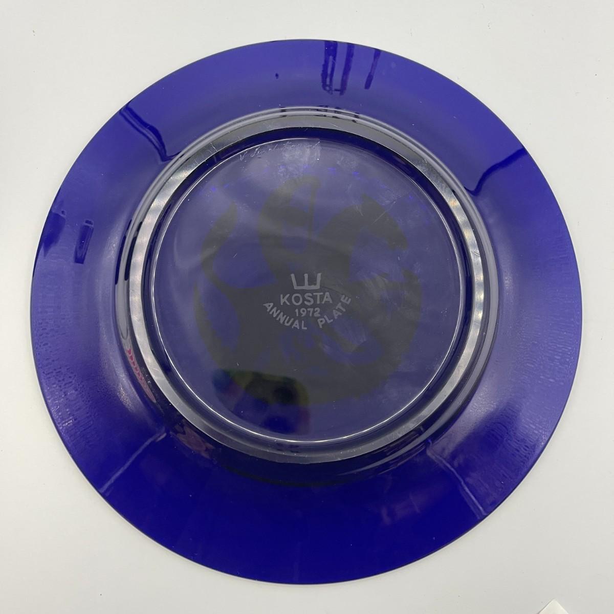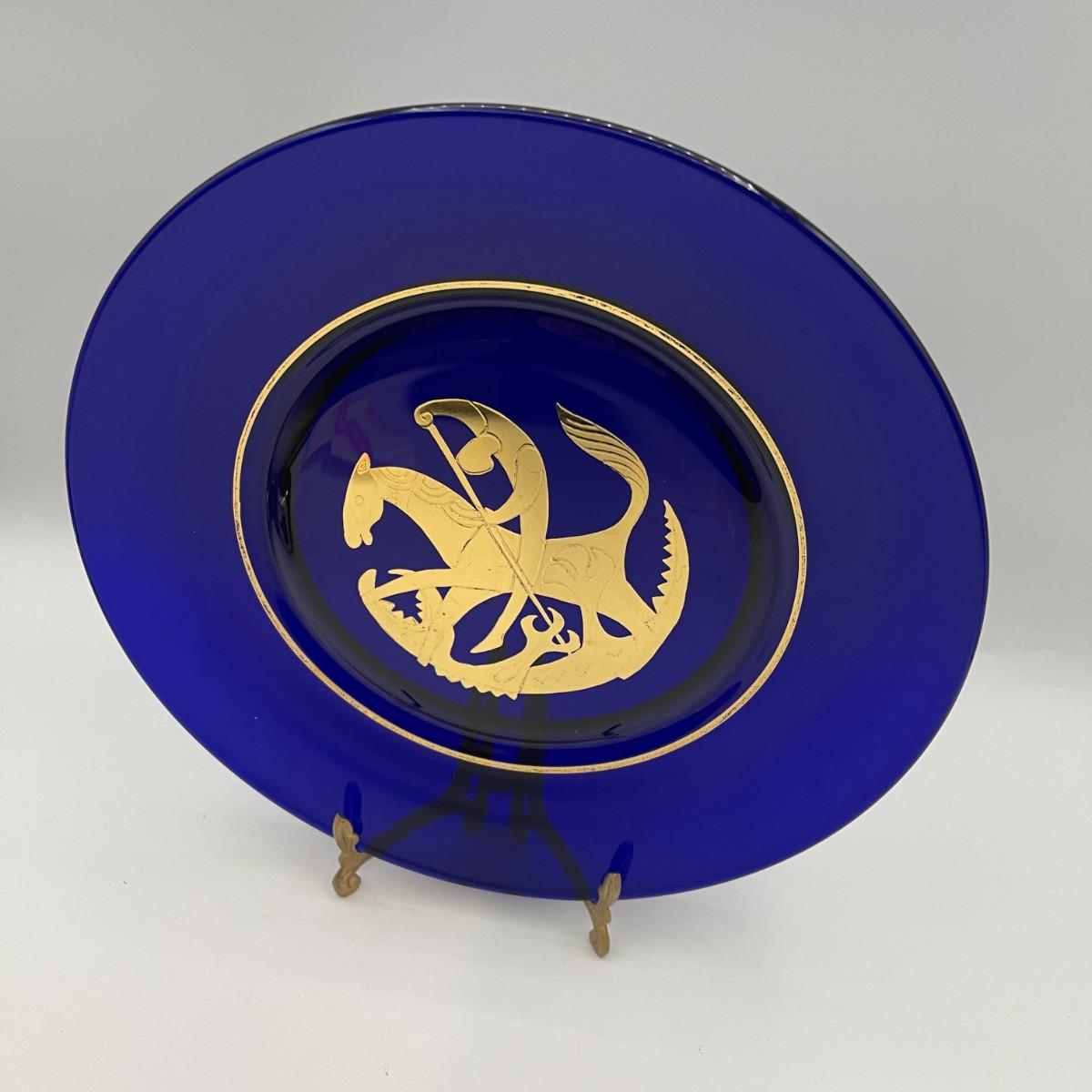Are you a George, or a Georgina? This commemorative, annual plate, from Swedish glassmaker Kosta Boda debuted in 1972. Stunning blue crystal with a modern visual of the traditional story of St. George killing the dragon in gold. 9" Diameter # 698