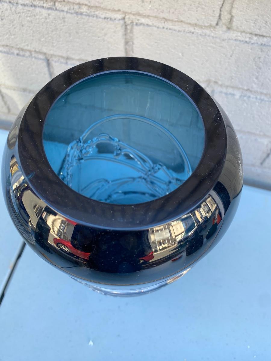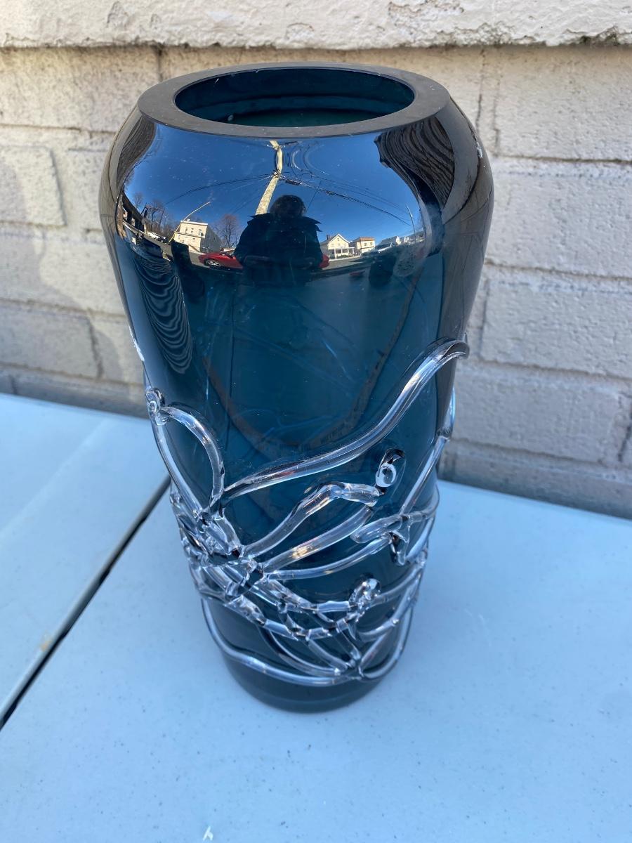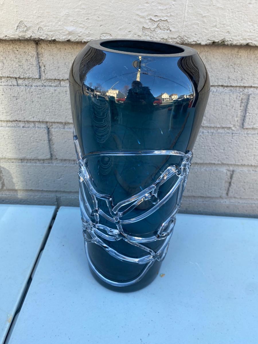12". high glas vase with outer glass decorative swirl pattern. Excellent condition.