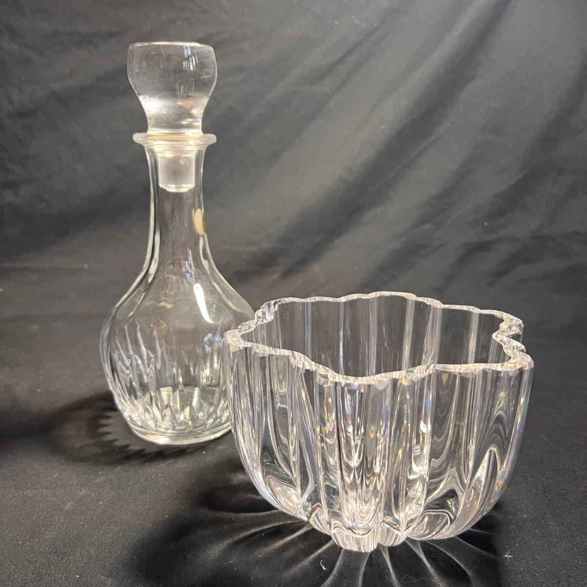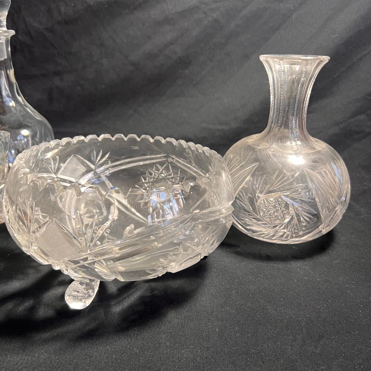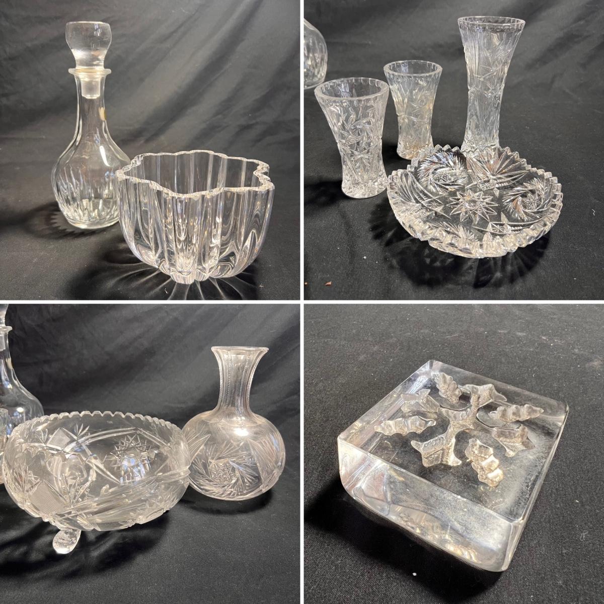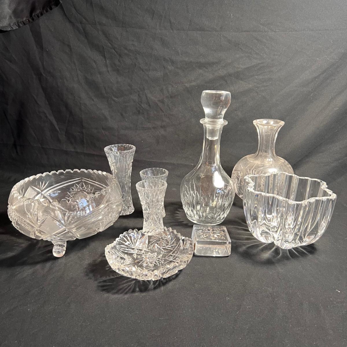 Nine glass items includes a Kost Boda bowl that measures 7”D x 4”H. The Cristal Taille decanter has a sticker that states its genuine lead crystal. No other markings found.