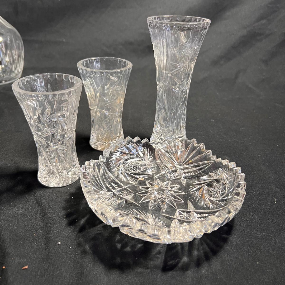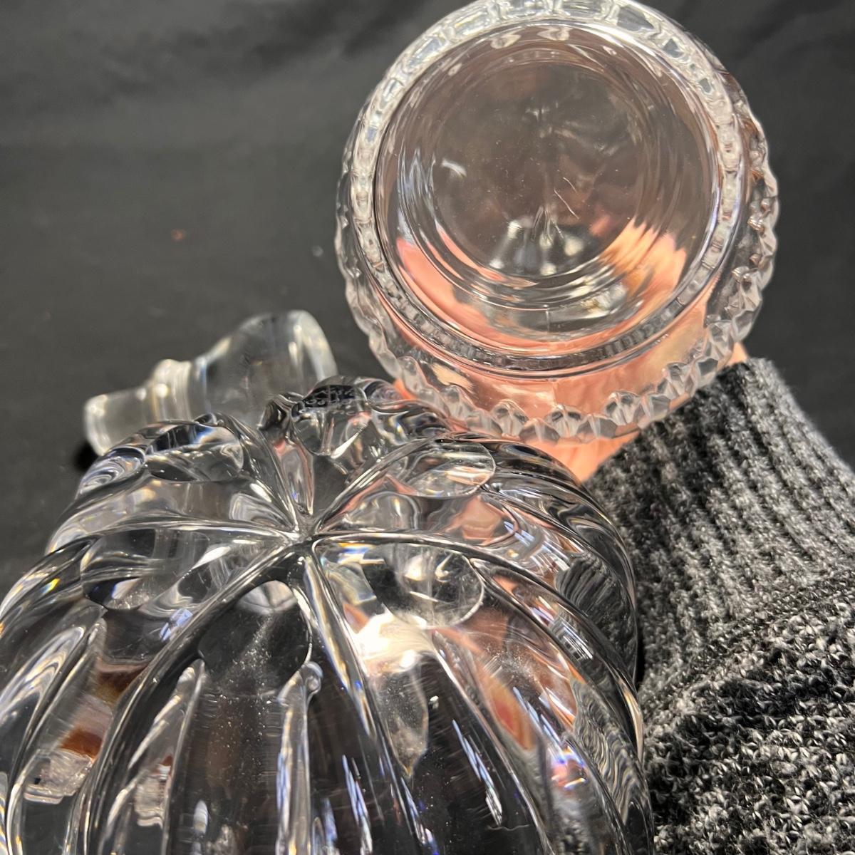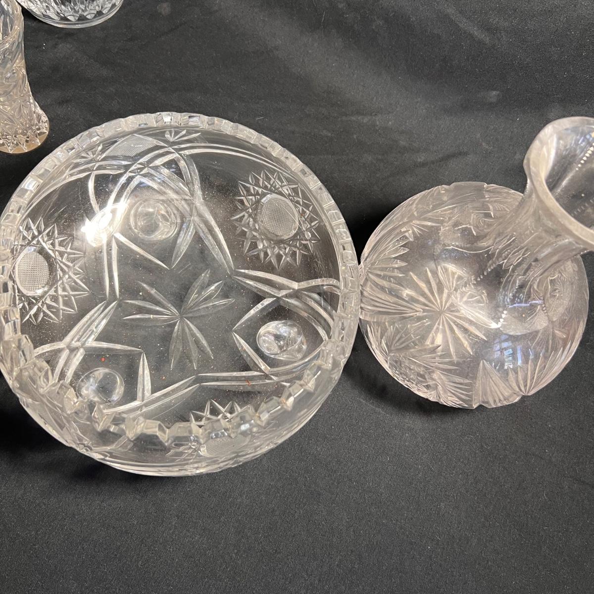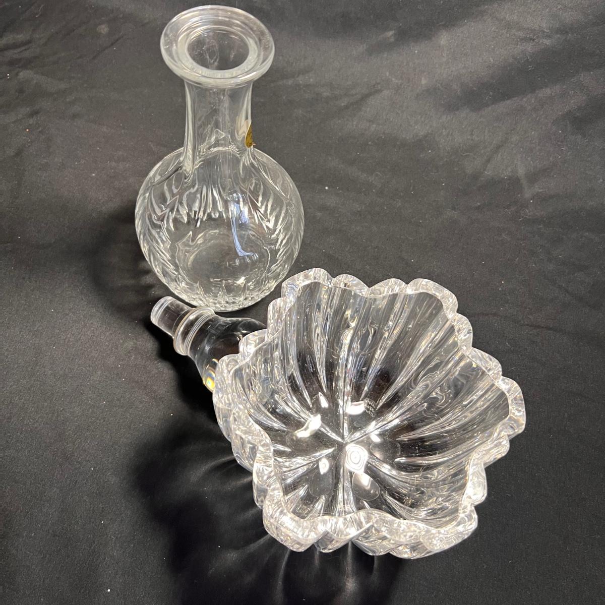 Nine glass items includes a Kost Boda bowl that measures 7”D x 4”H. The Cristal Taille decanter has a sticker that states its genuine lead crystal. No other markings found.