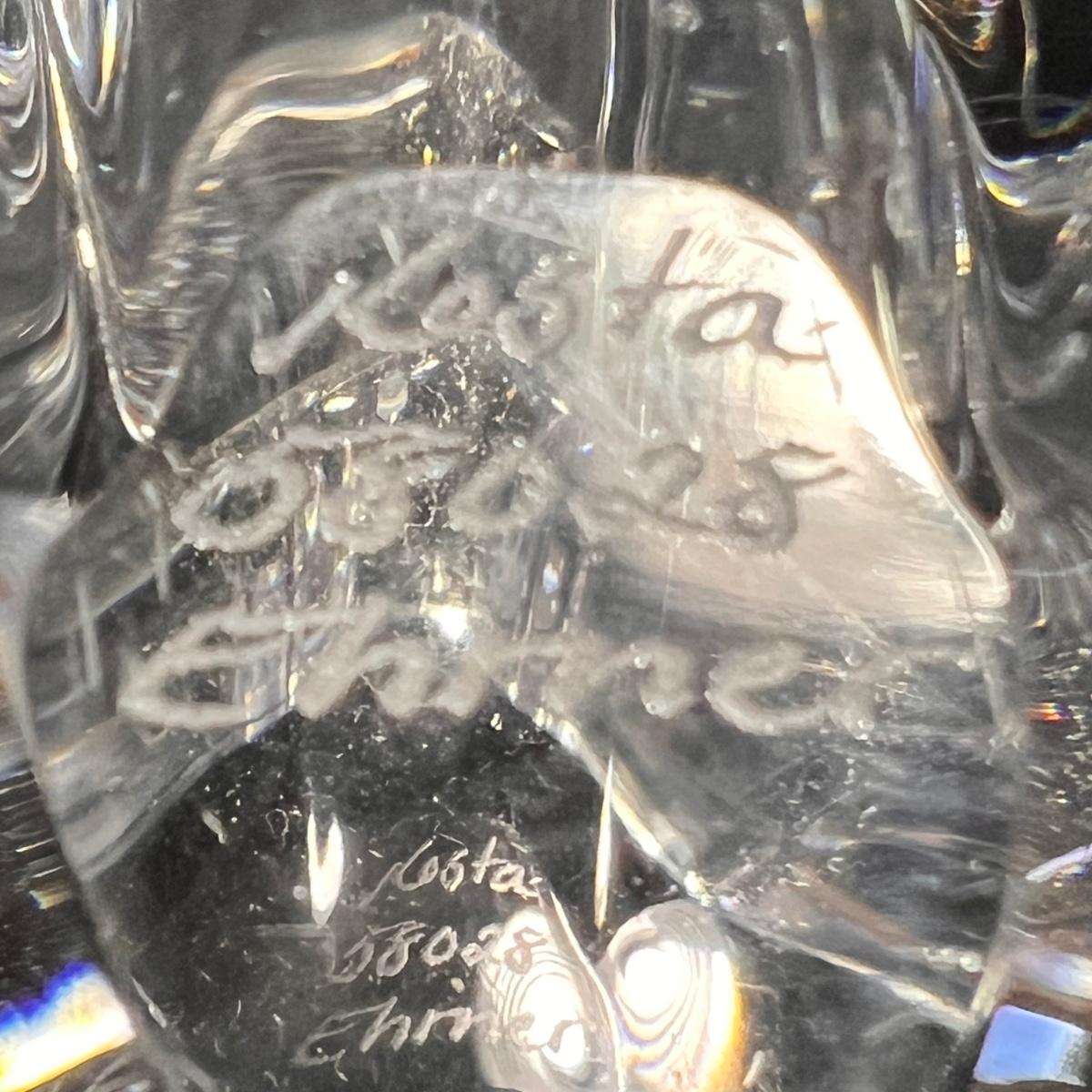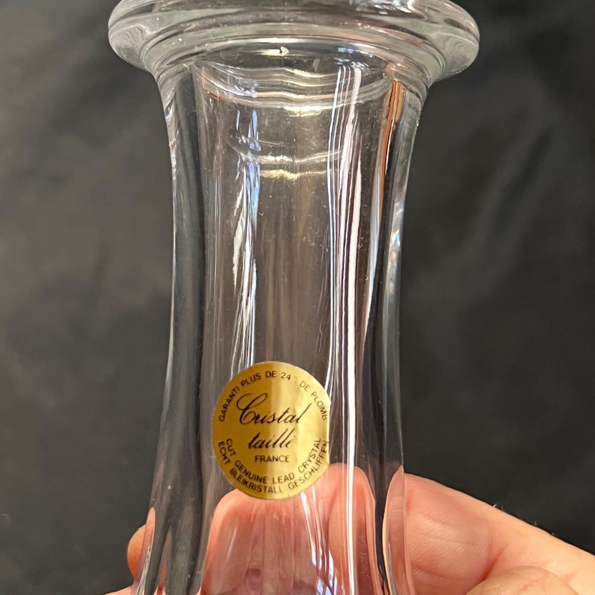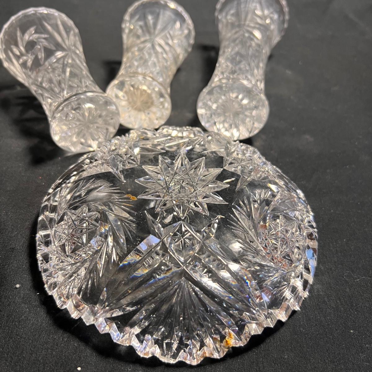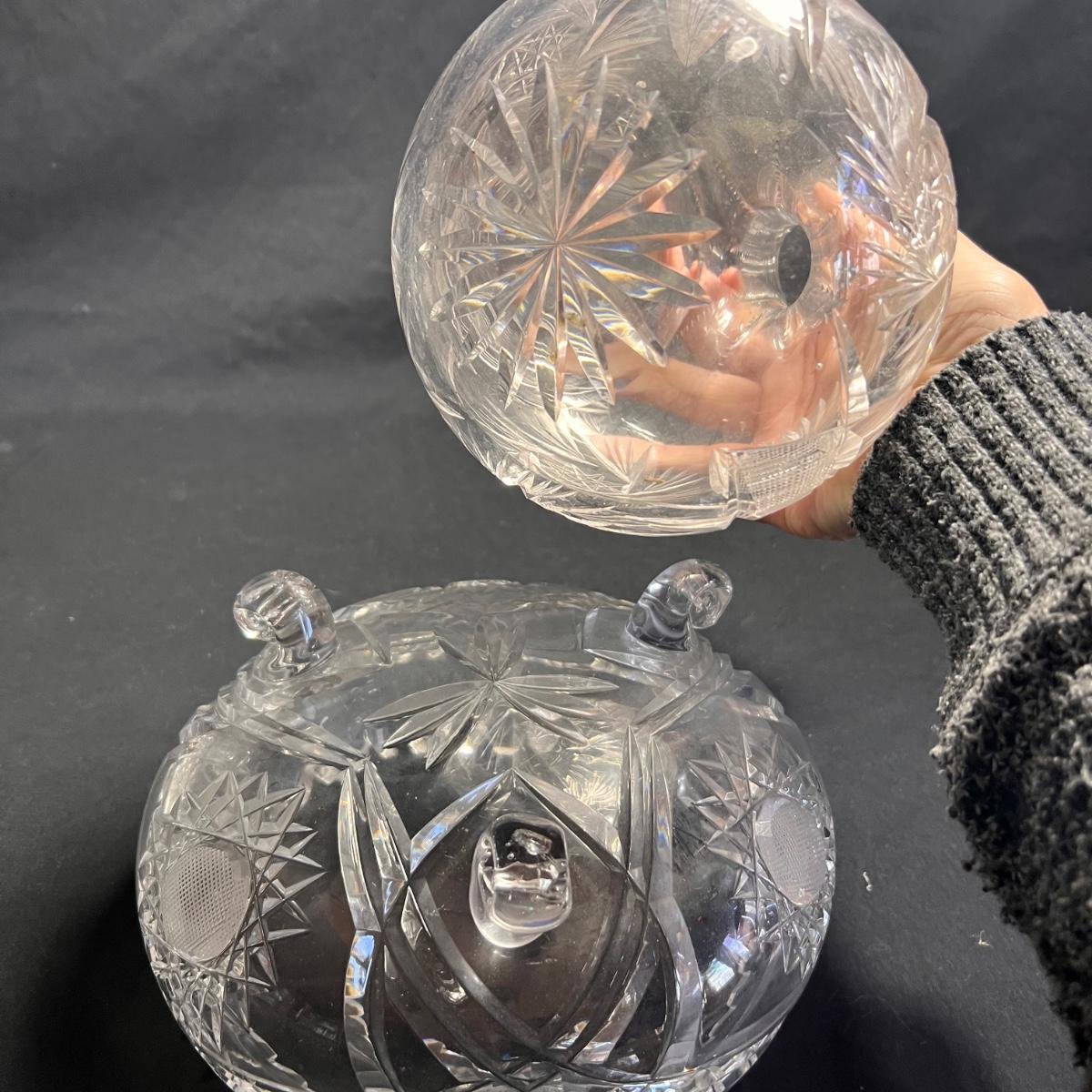 Nine glass items includes a Kost Boda bowl that measures 7”D x 4”H. The Cristal Taille decanter has a sticker that states its genuine lead crystal. No other markings found.