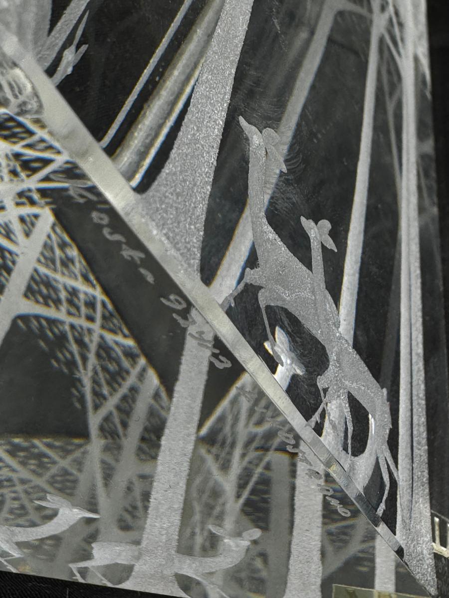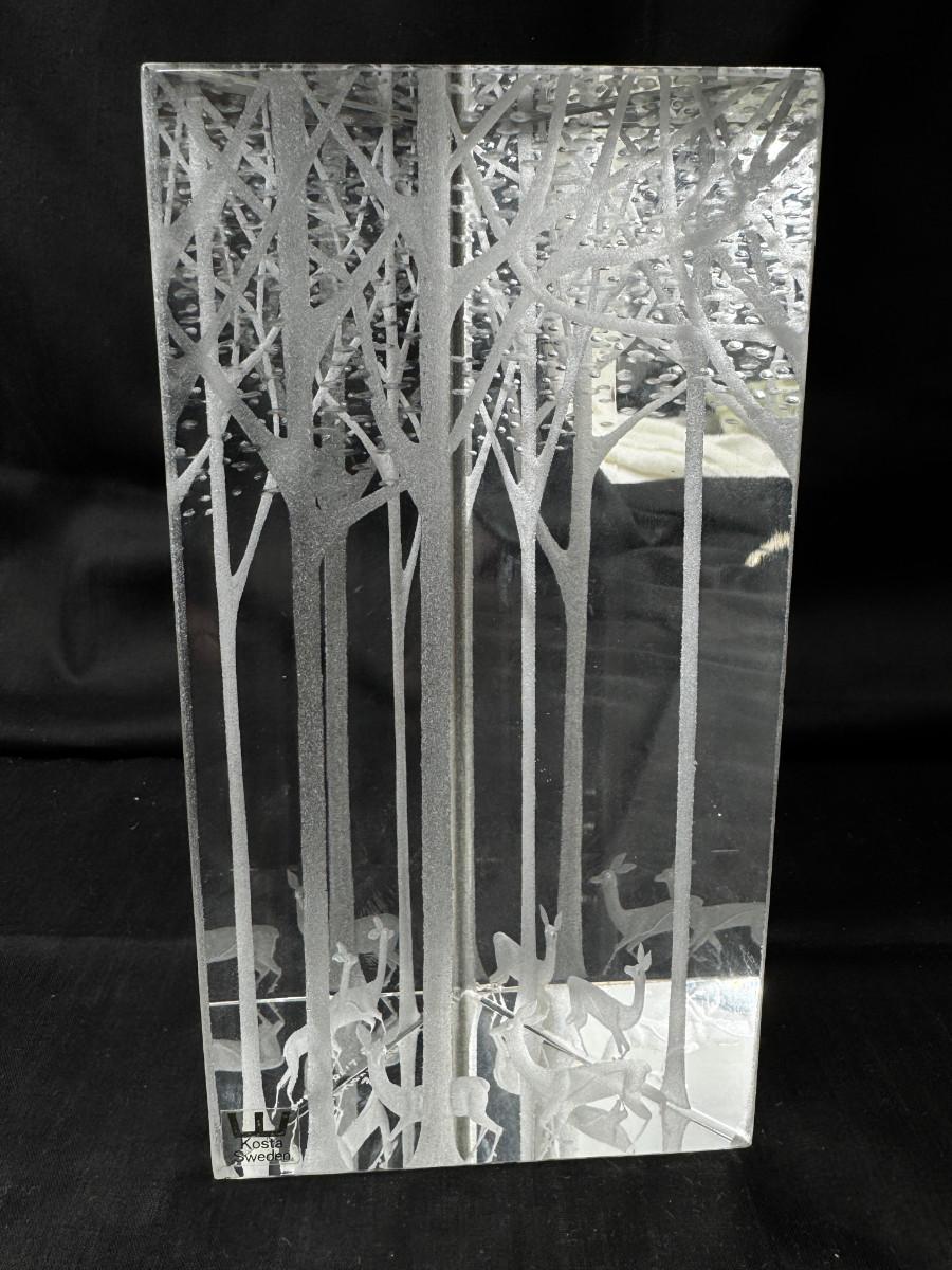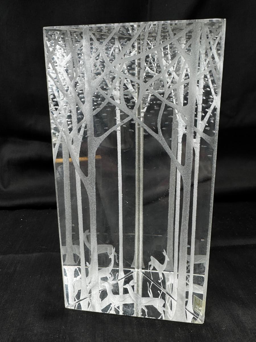 - Vicke Lindstrand- Kosta Boda colorless crystal "Deer in the Forest" triangular prism sculpture, one bottom edge with a "Kosta Sweden" label, the underside acid-etched "Kosta 92412 Lindstrand." 6.75" H. Tiny fleabite chips to edges top and bottom. Heavy with a beautiful winter theme.