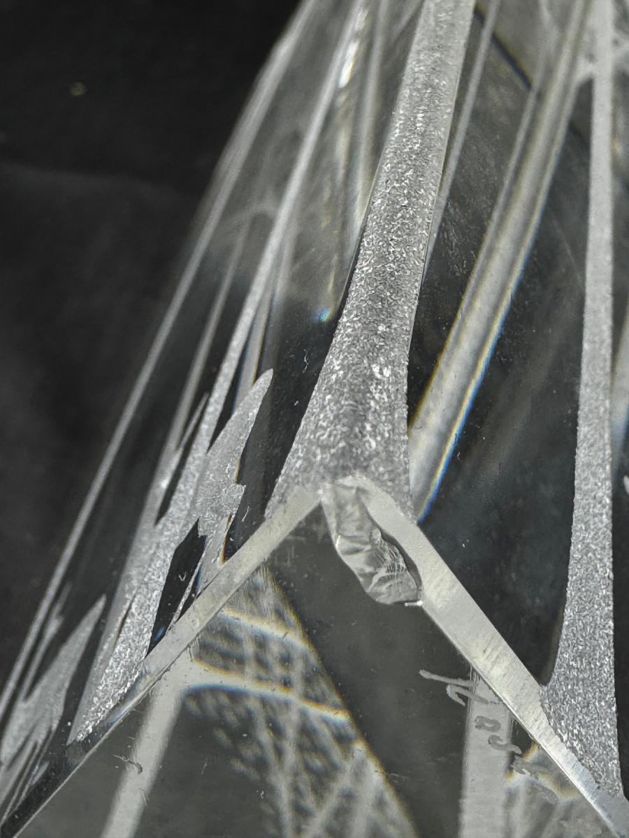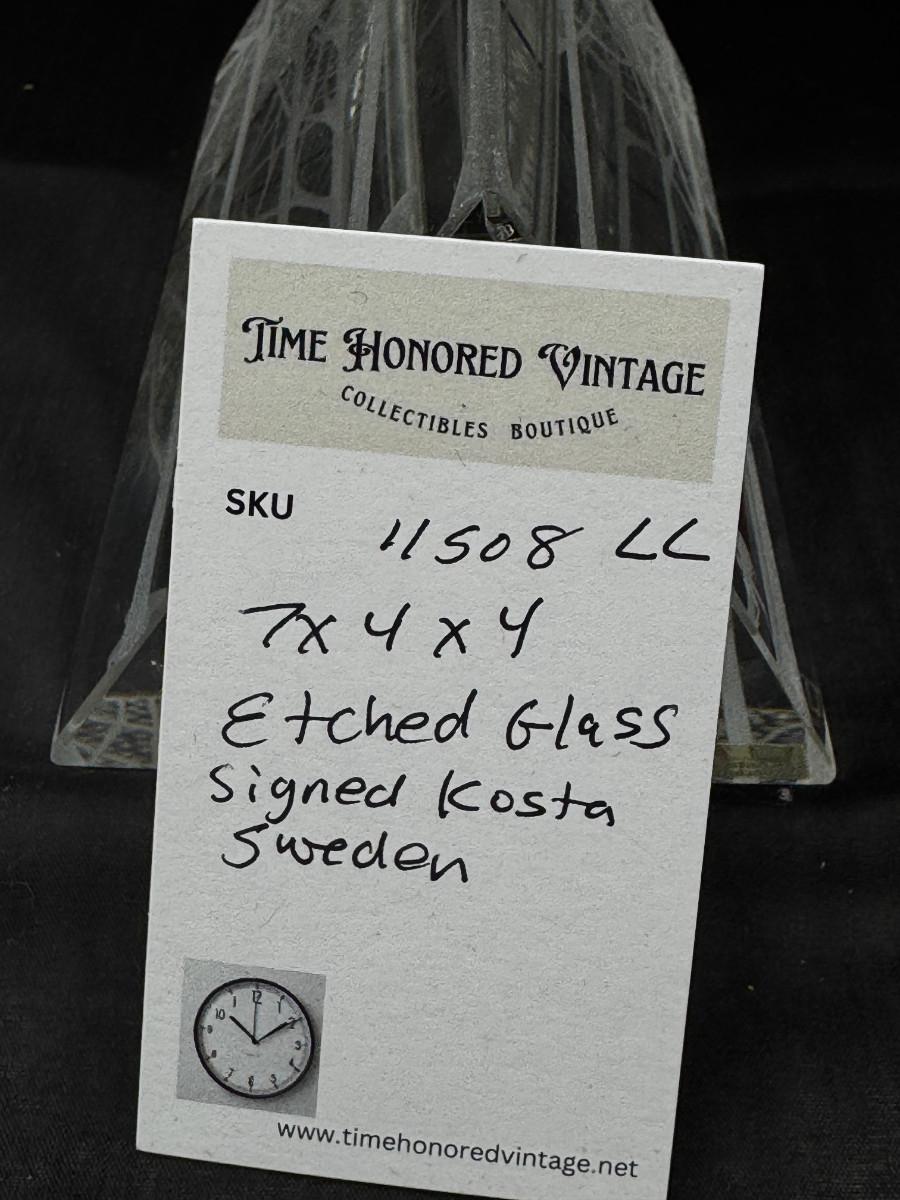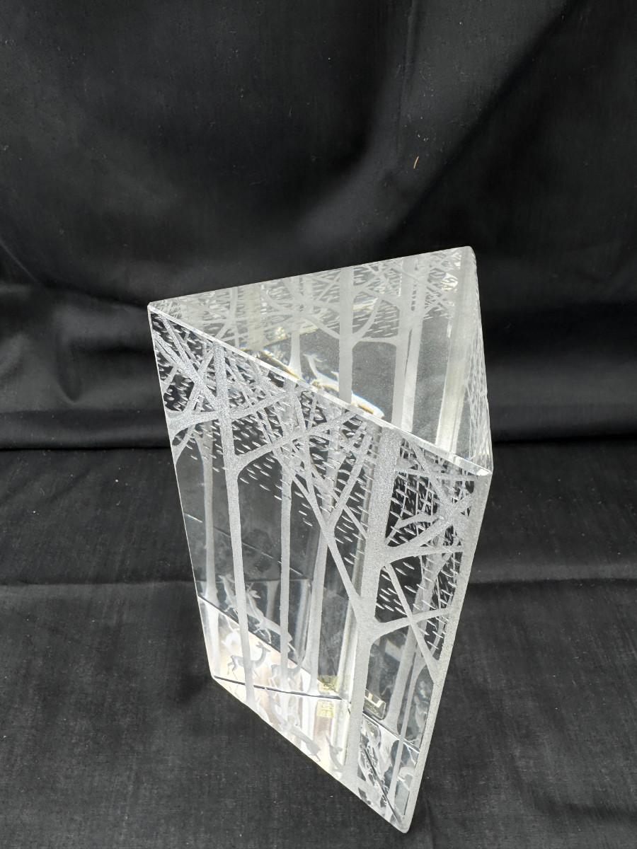 - Vicke Lindstrand- Kosta Boda colorless crystal "Deer in the Forest" triangular prism sculpture, one bottom edge with a "Kosta Sweden" label, the underside acid-etched "Kosta 92412 Lindstrand." 6.75" H. Tiny fleabite chips to edges top and bottom. Heavy with a beautiful winter theme.