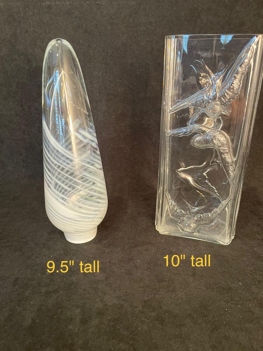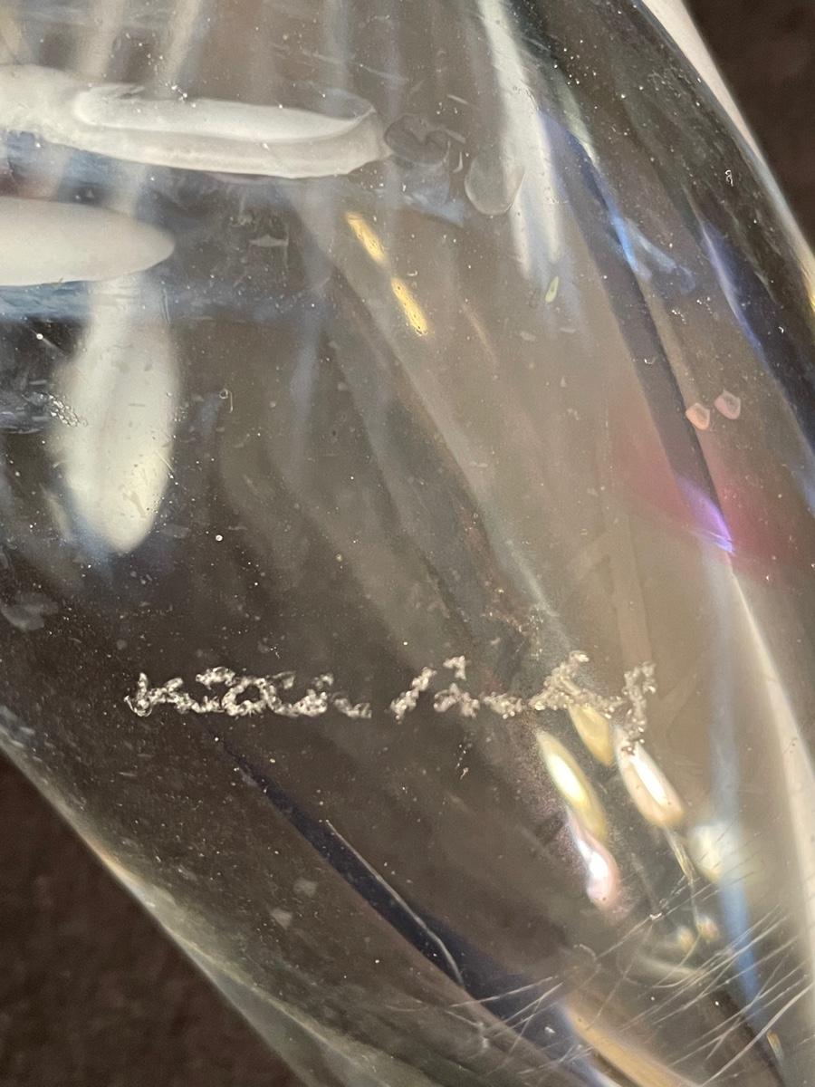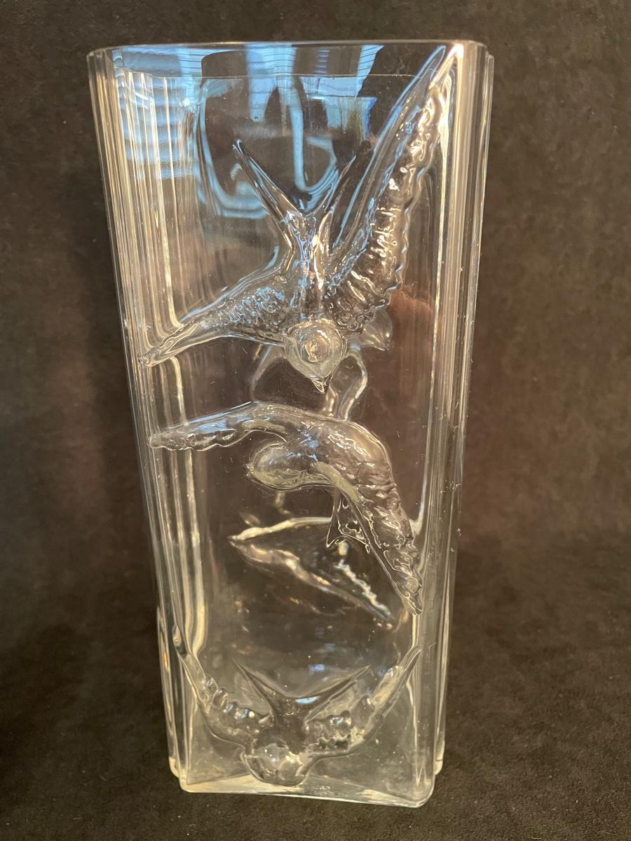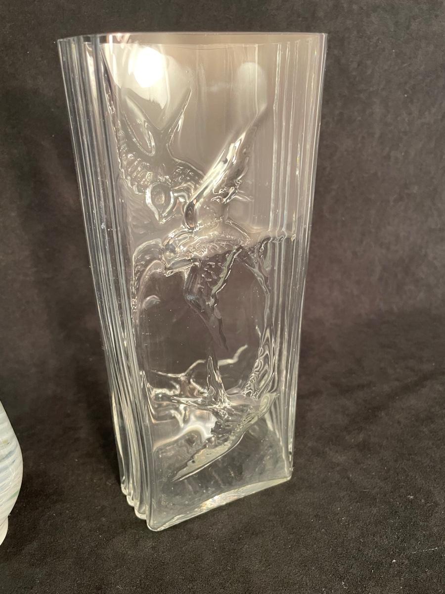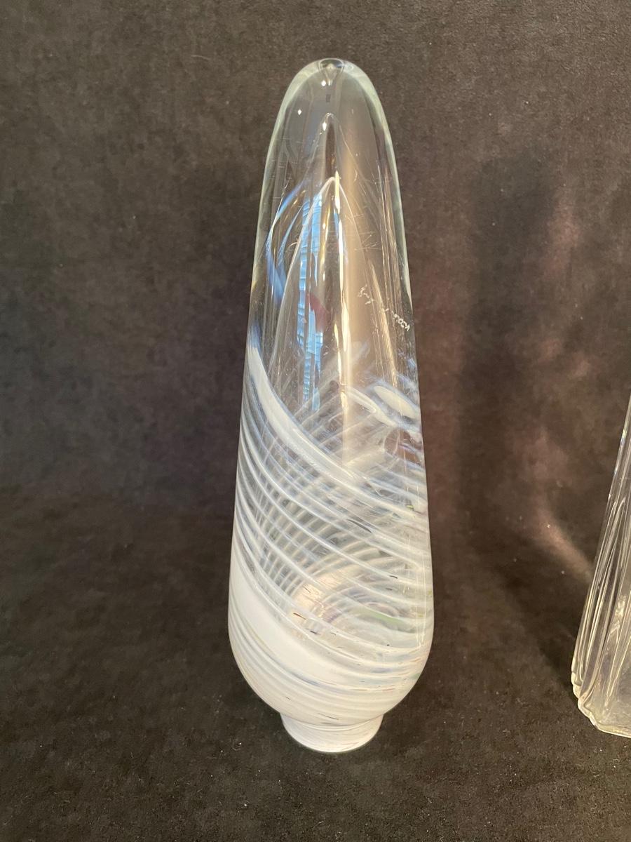 Kosta Boda glass cone and a tall glass vase with a bird motif