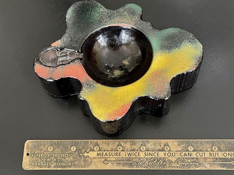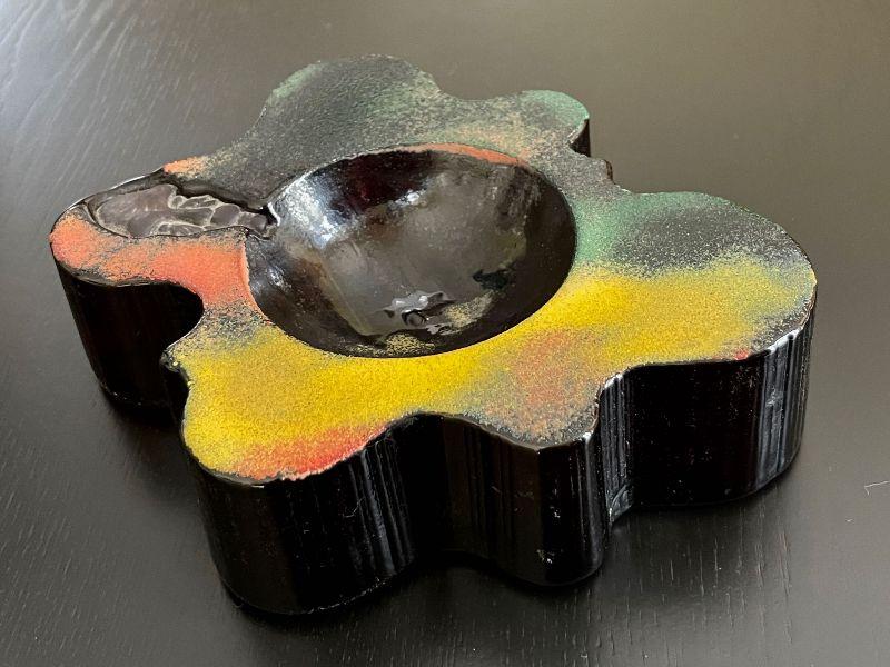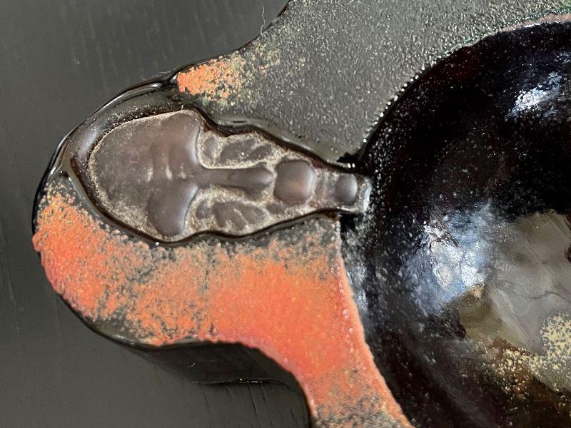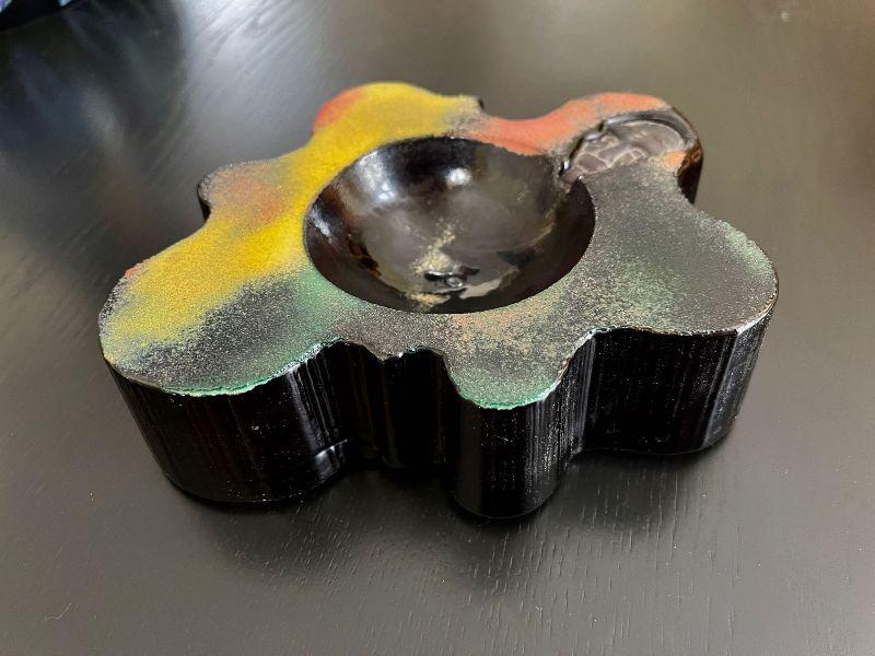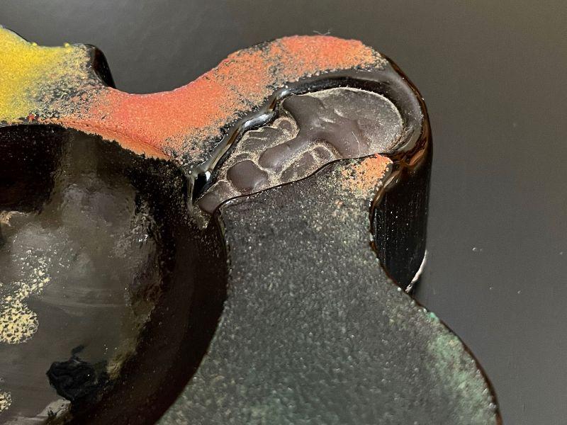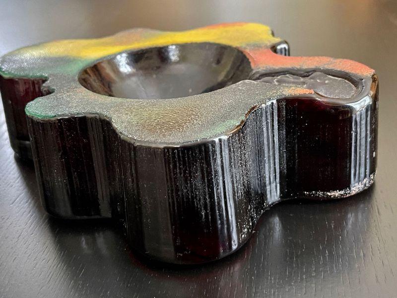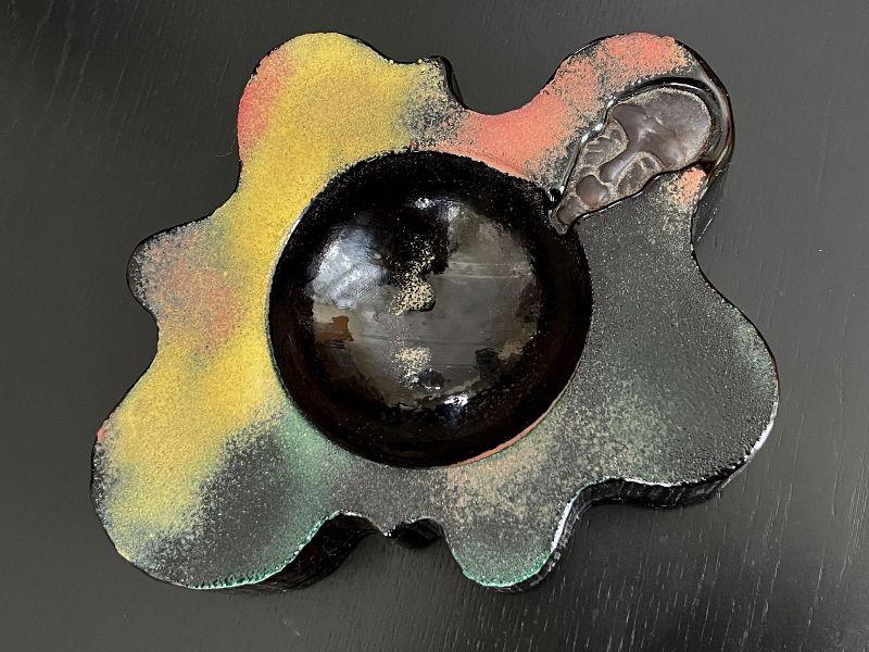 The subject item for auction sale is a vintage studio art glass sculpture that can be used as a small bowl or just as a decorative object standing flat or raised on the side. Made of a very dark red glass top brim covered with multi colored glass dust, forming a frame that on one side is squeezing a human head in mattered glass.