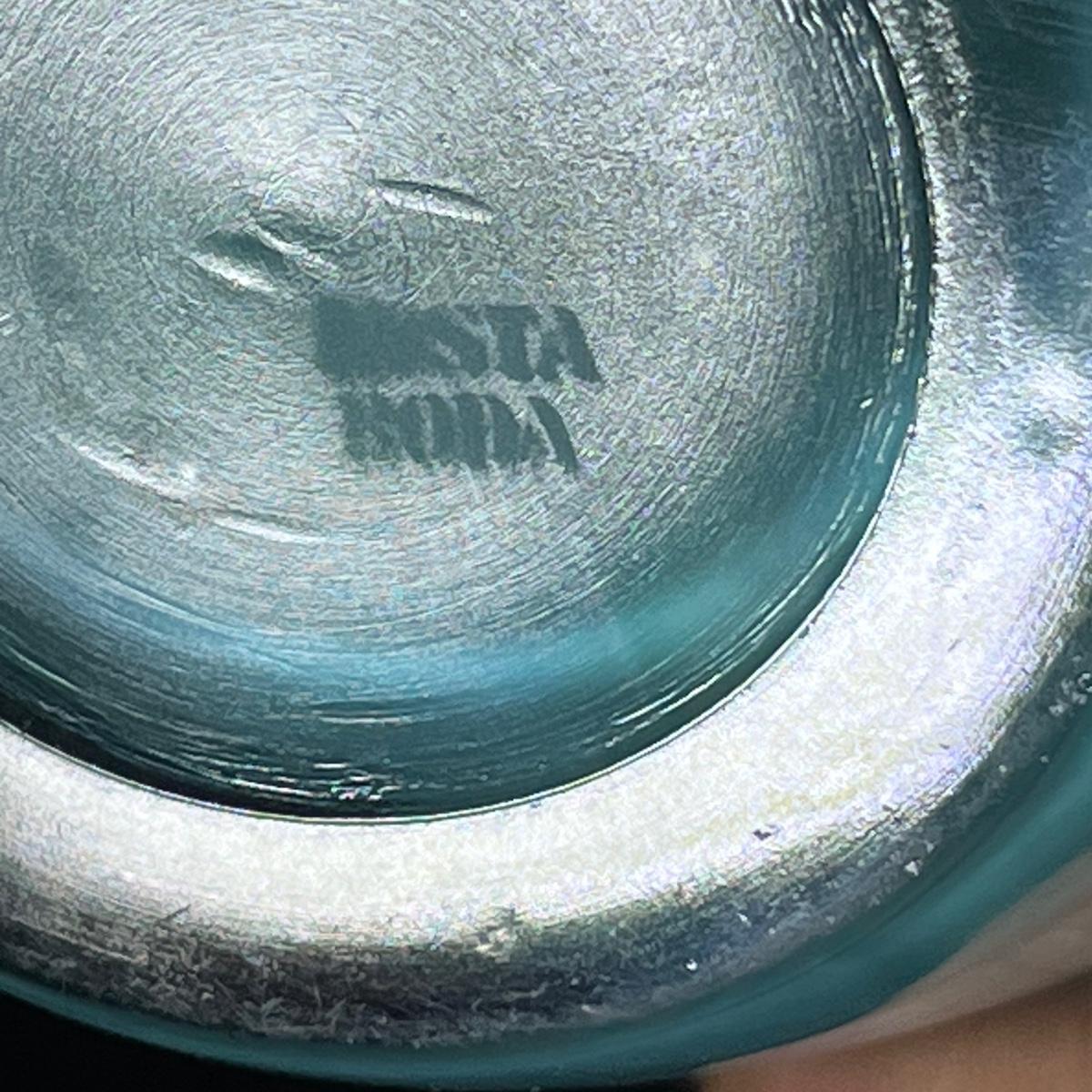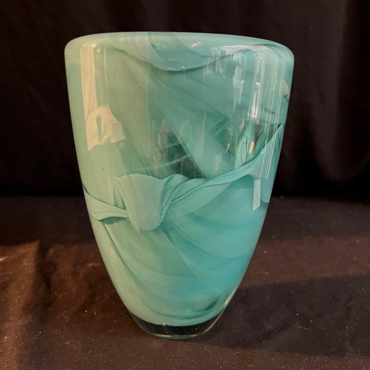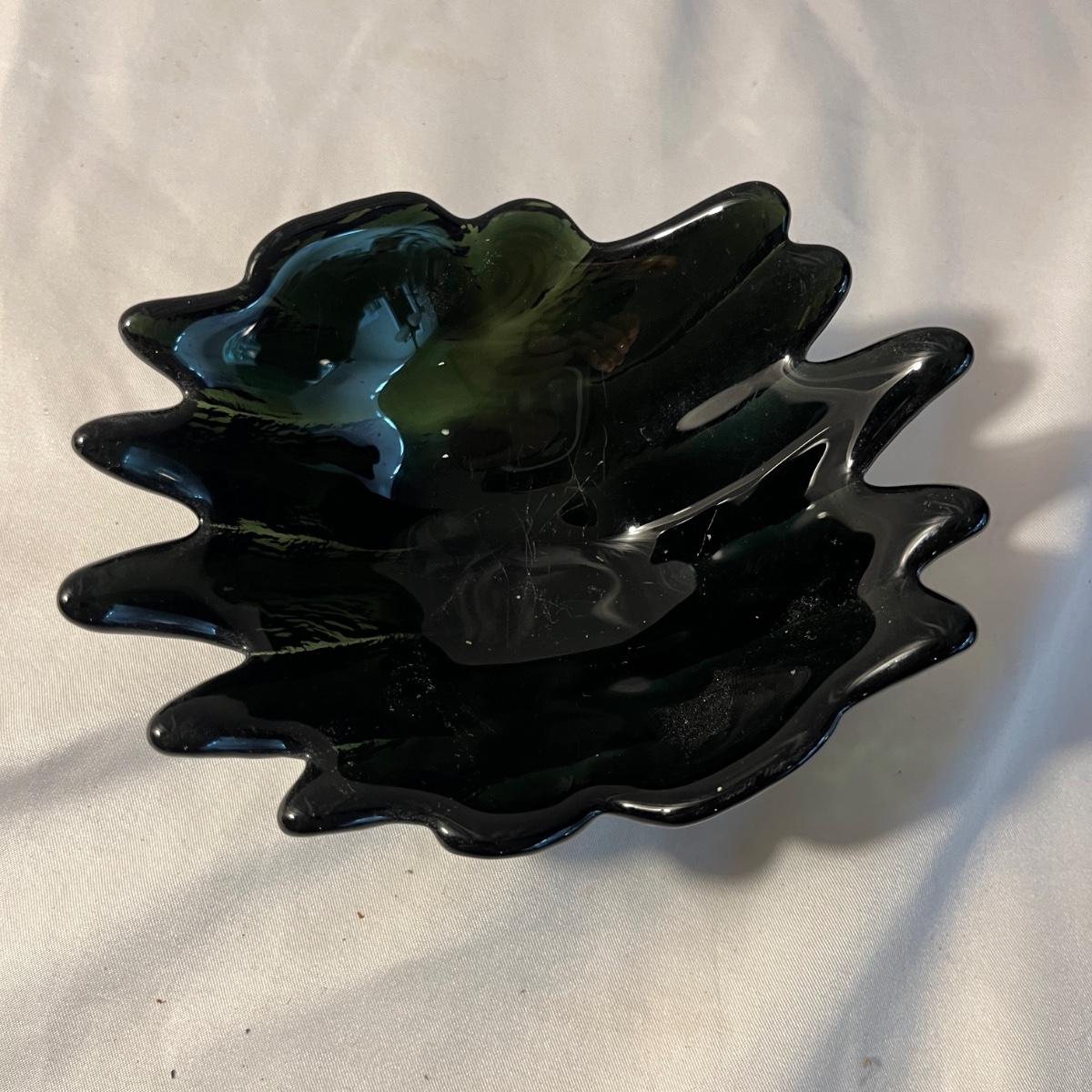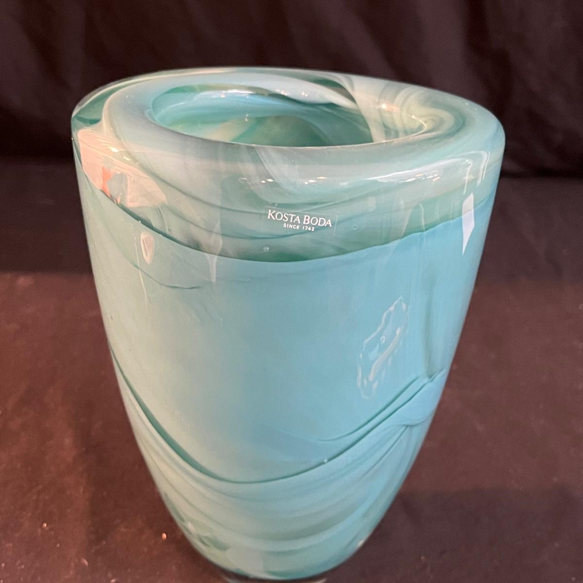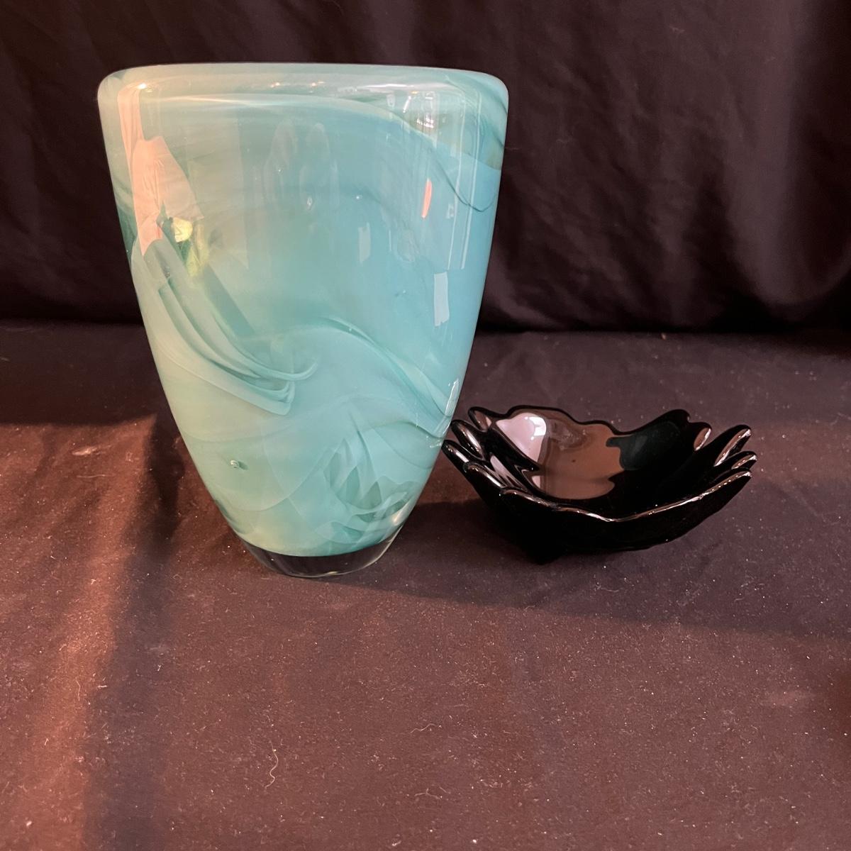 Lot includes a glass Kosta Boda vase that is stamped on the bottom and a black glass dish. Vase measures 6”D x 8”H.