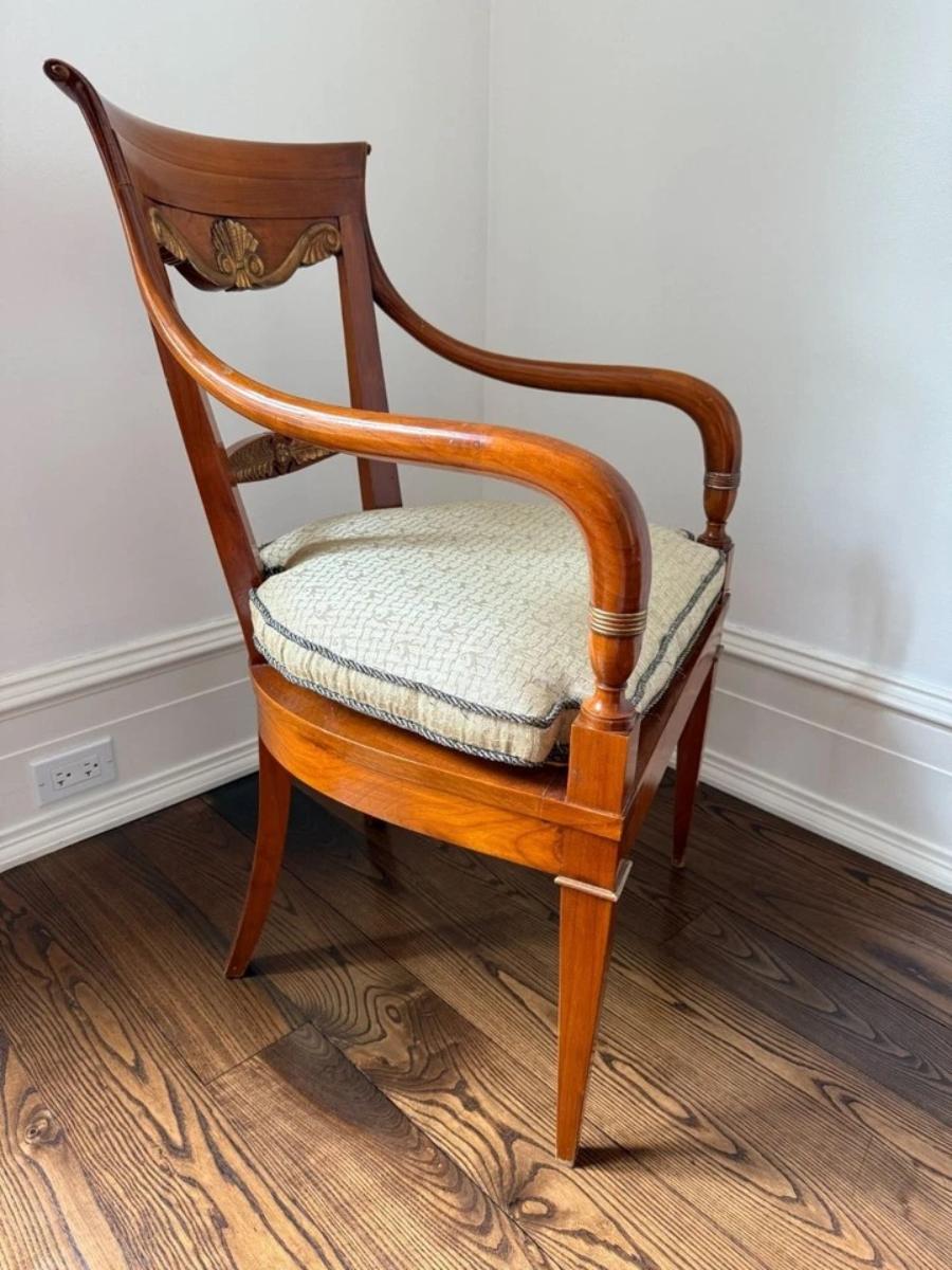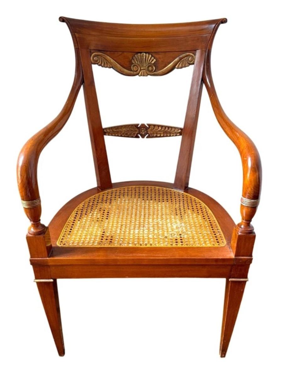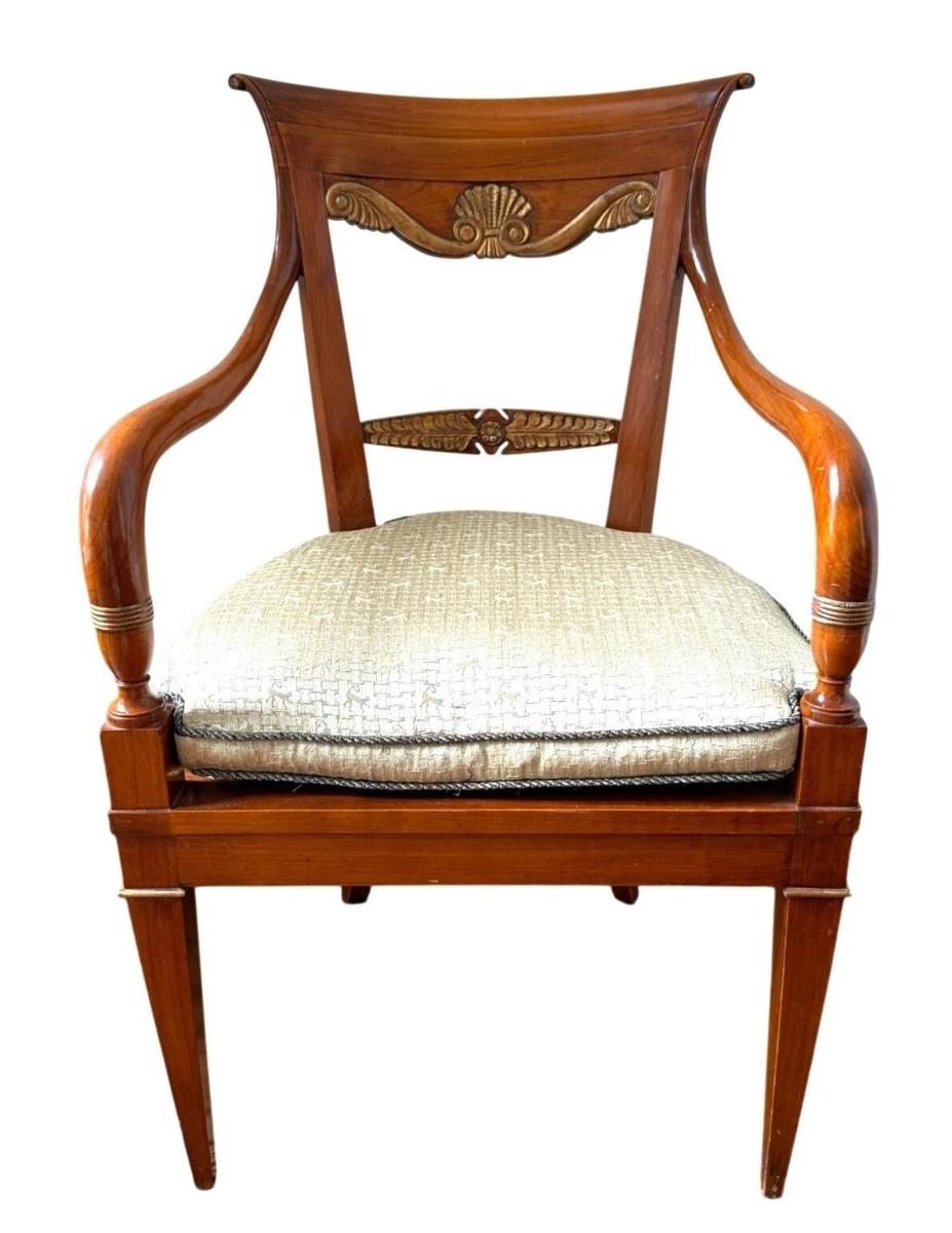 Vintage, Late 20th Century, Attributed to KPS Group Italy, Directoire Wood Arm Chair with Hand Carved Wood Accents, Cane Seat and Custom Monkey Image Print Upholstery.