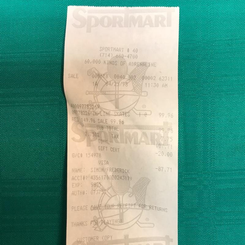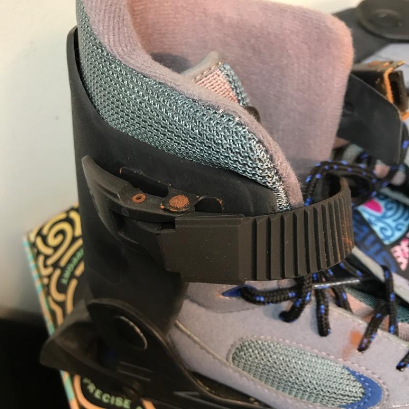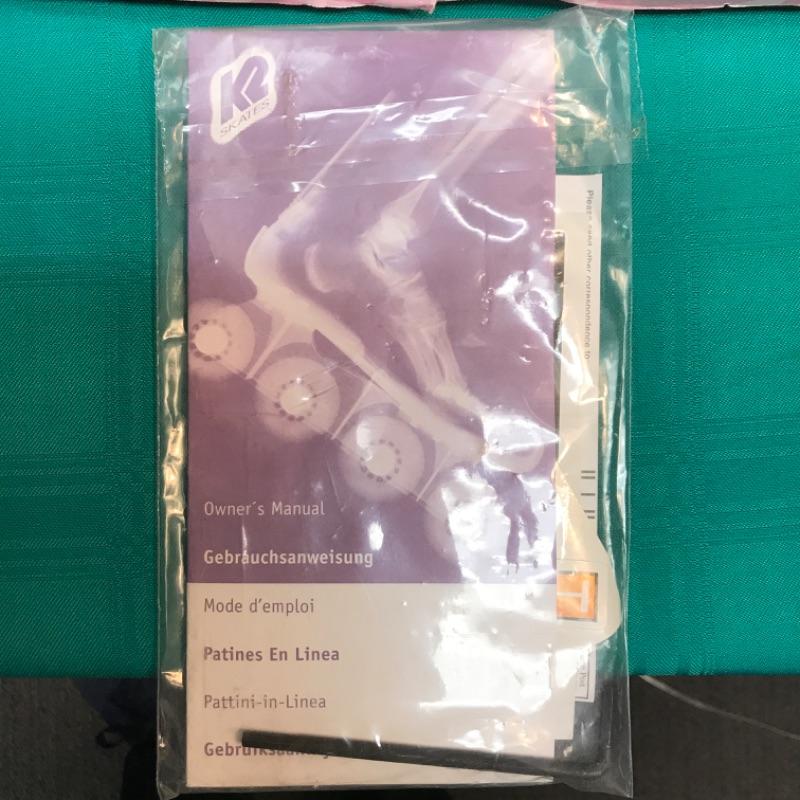 Offered us a pair of used women’s size 7, four-wheel, in-line skates. They are used but in good condition with the original box, receipt from 1998, and instructions. There is some slight surface rust on the metal hardware around the top strap; see pictures.
