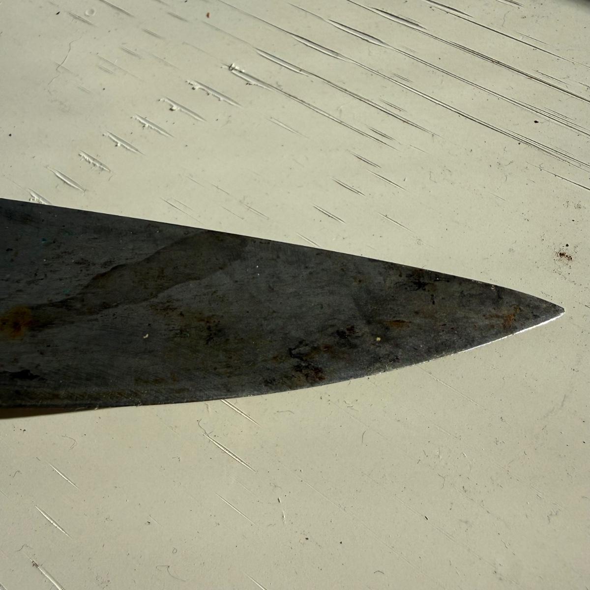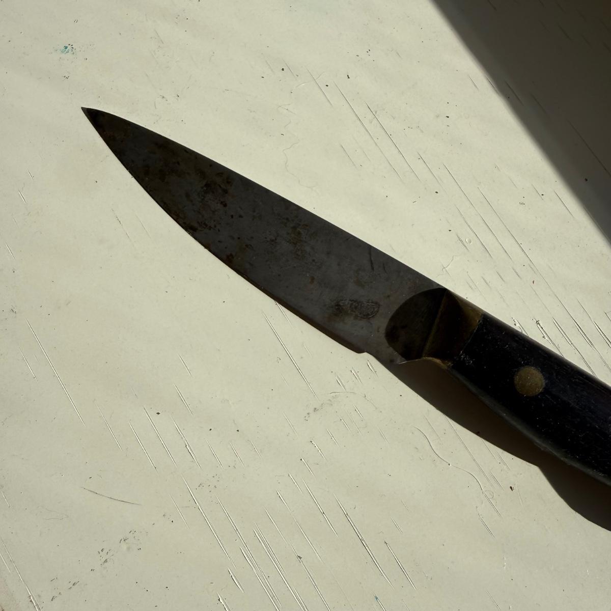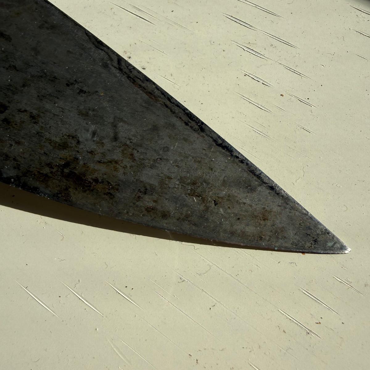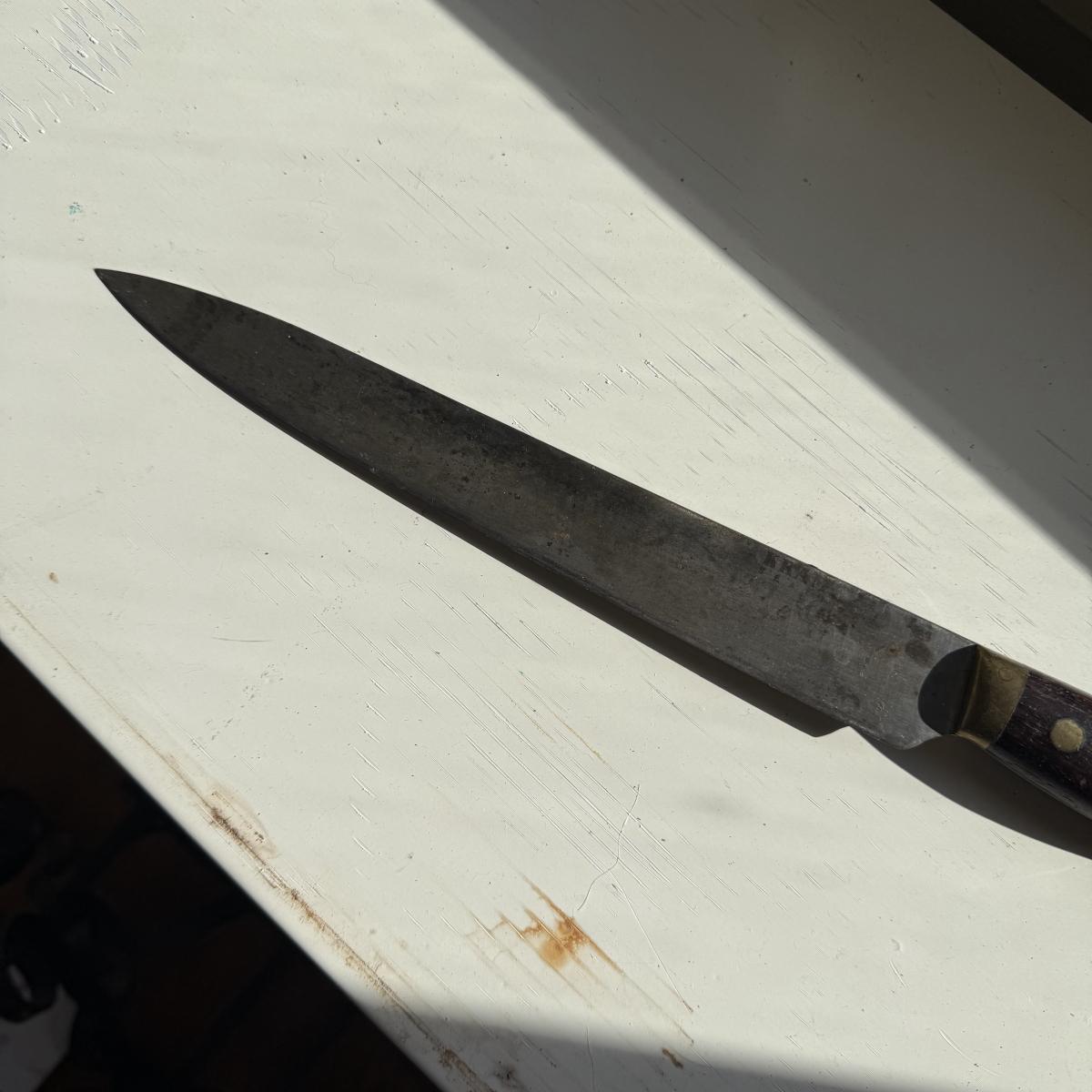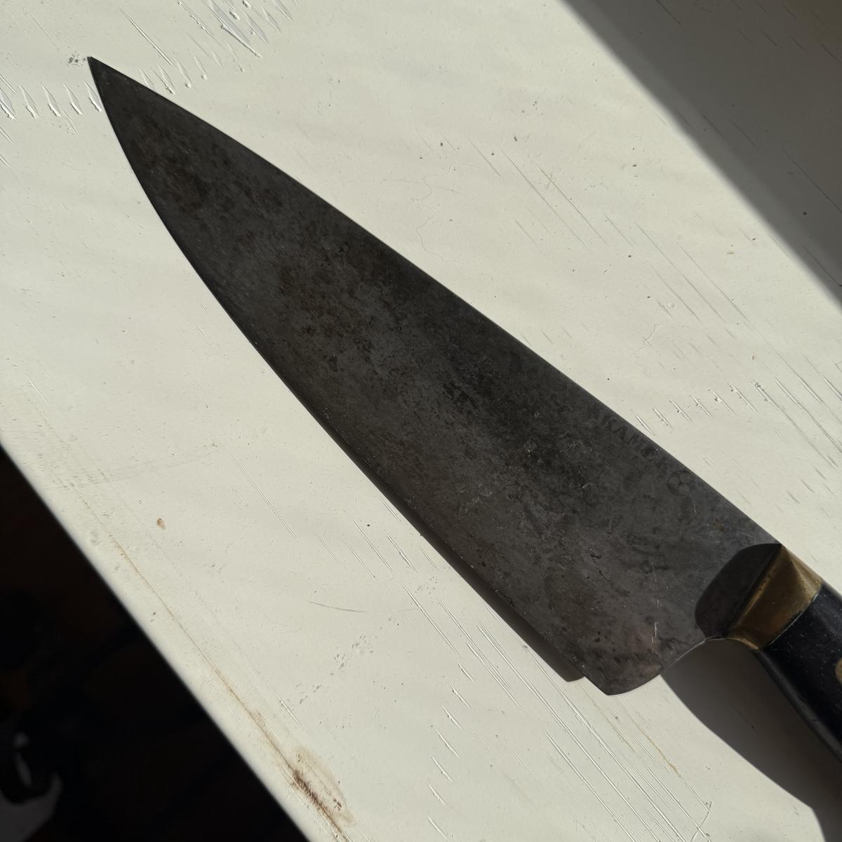 Lot includes a five piece set of Kramer knives and a J.A. Henckels sharpener. Longest knife measures 15”long.