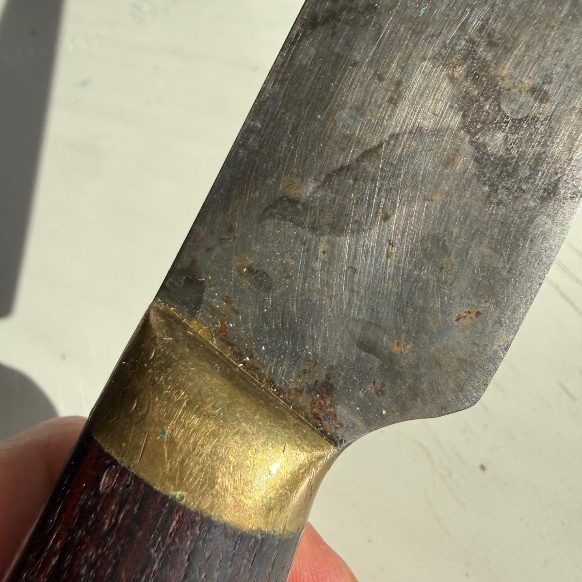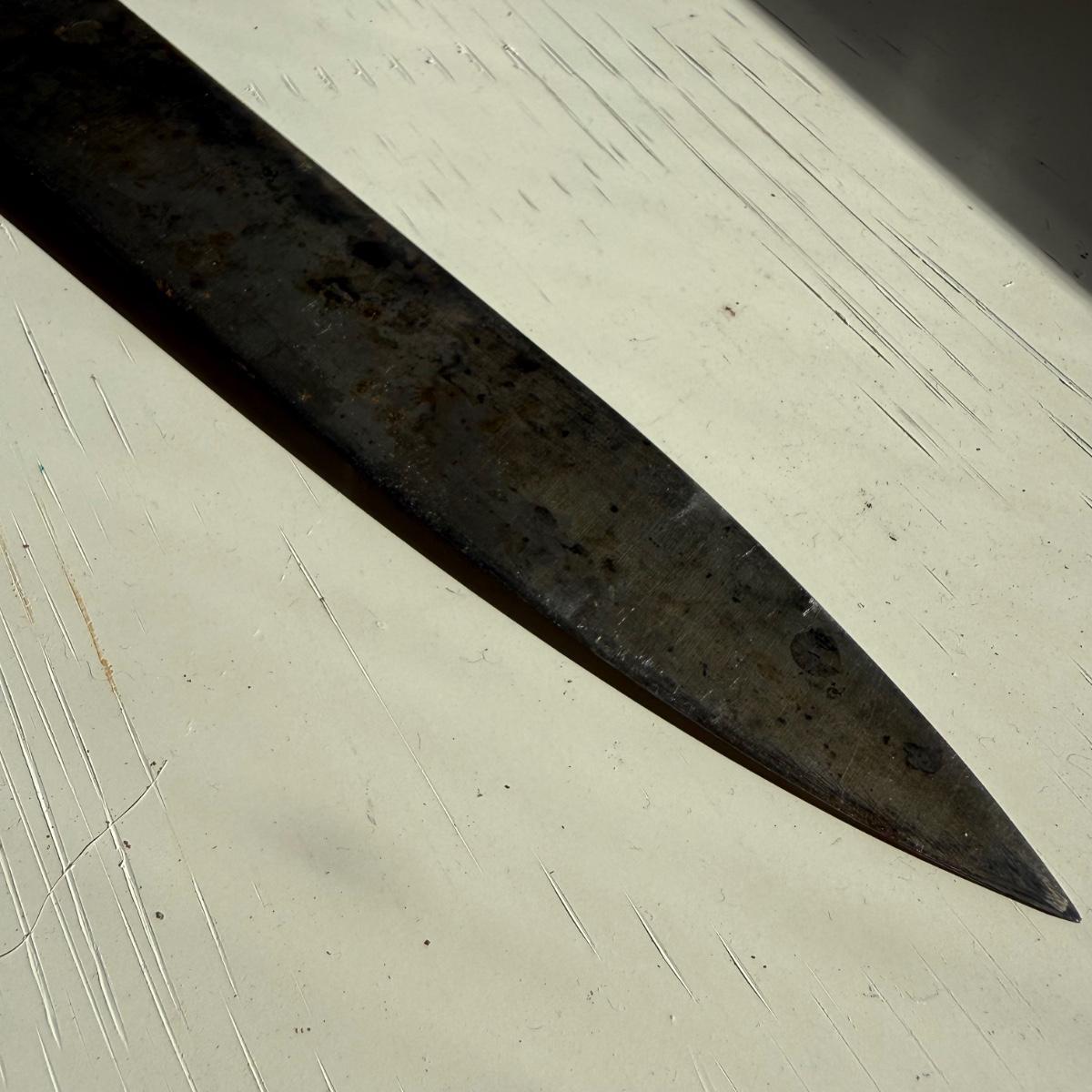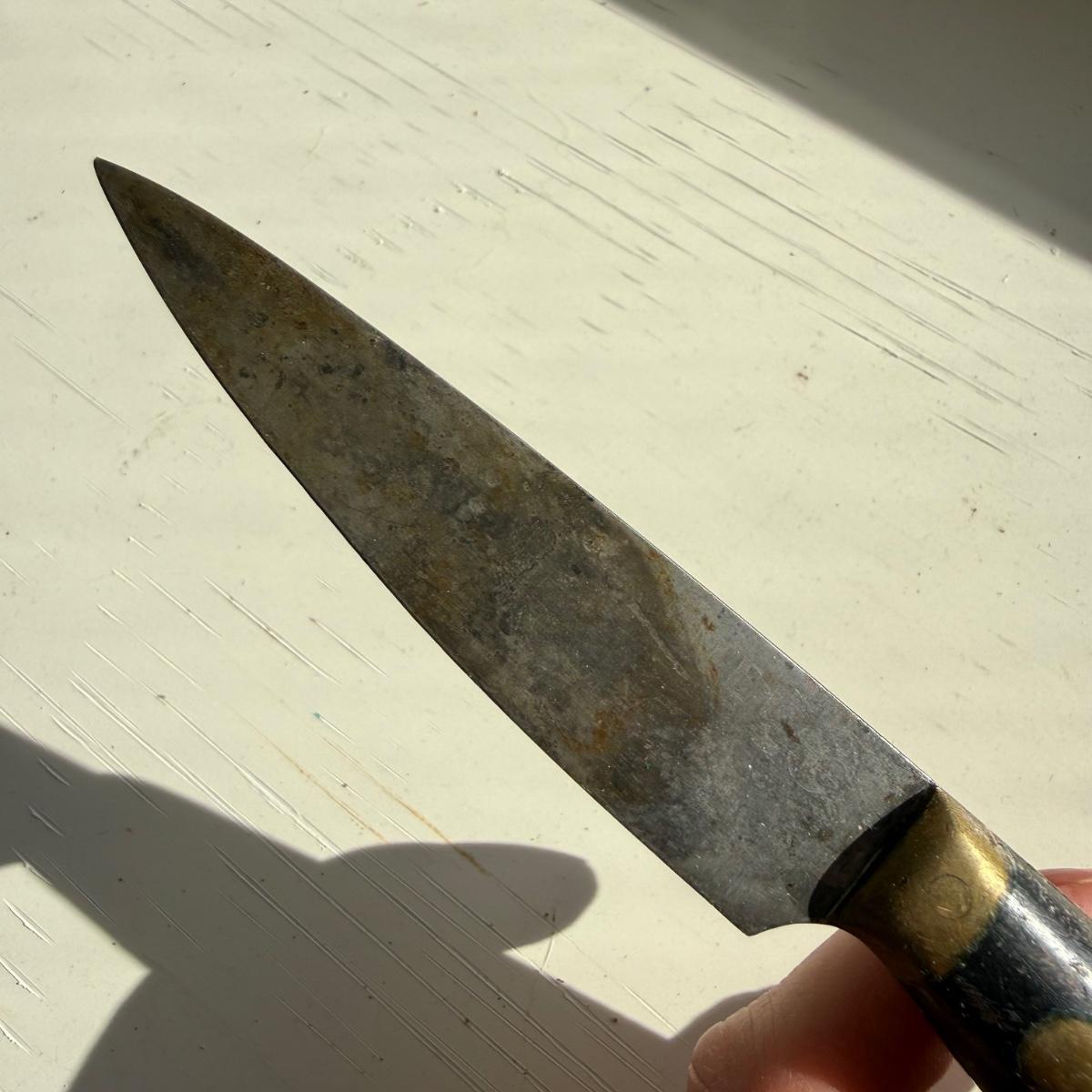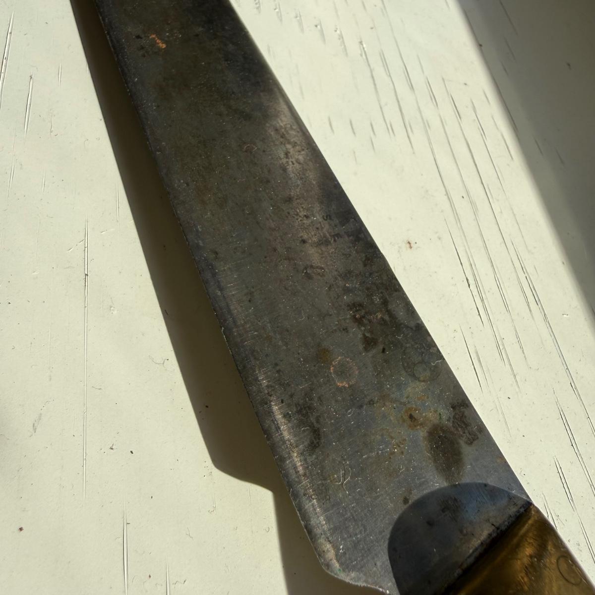 Lot includes a five piece set of Kramer knives and a J.A. Henckels sharpener. Longest knife measures 15”long.