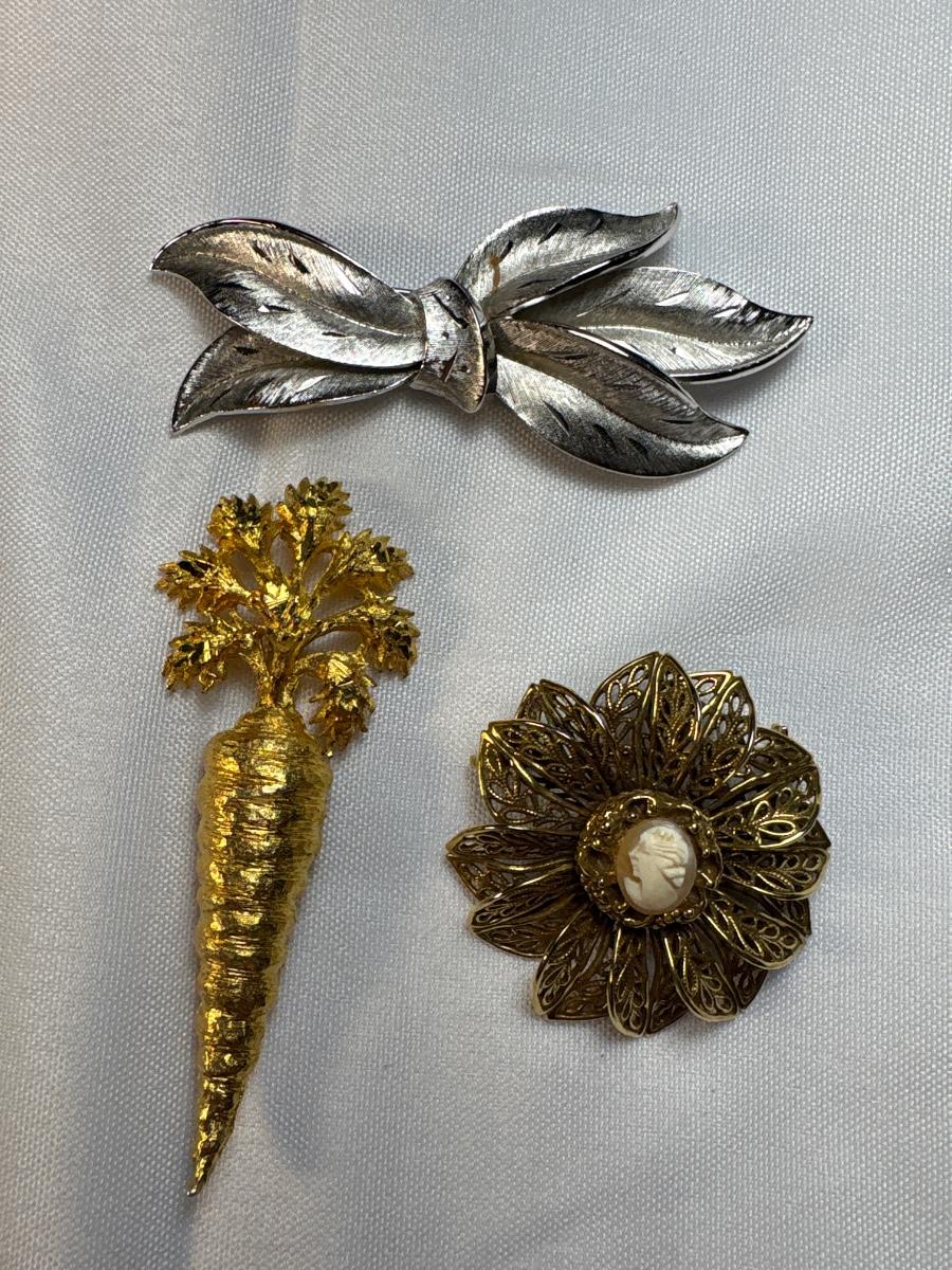 Kramer silver pin, Mandela carrot pin & cameo pin