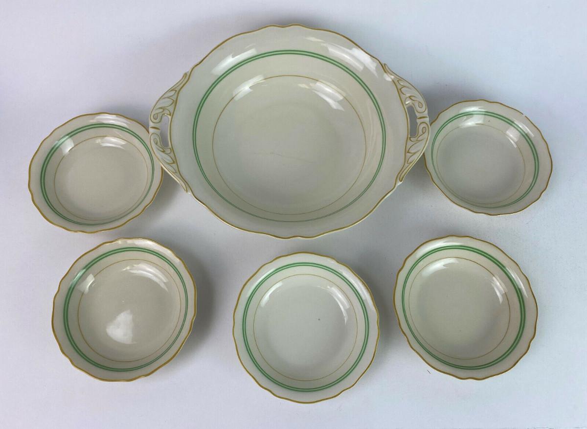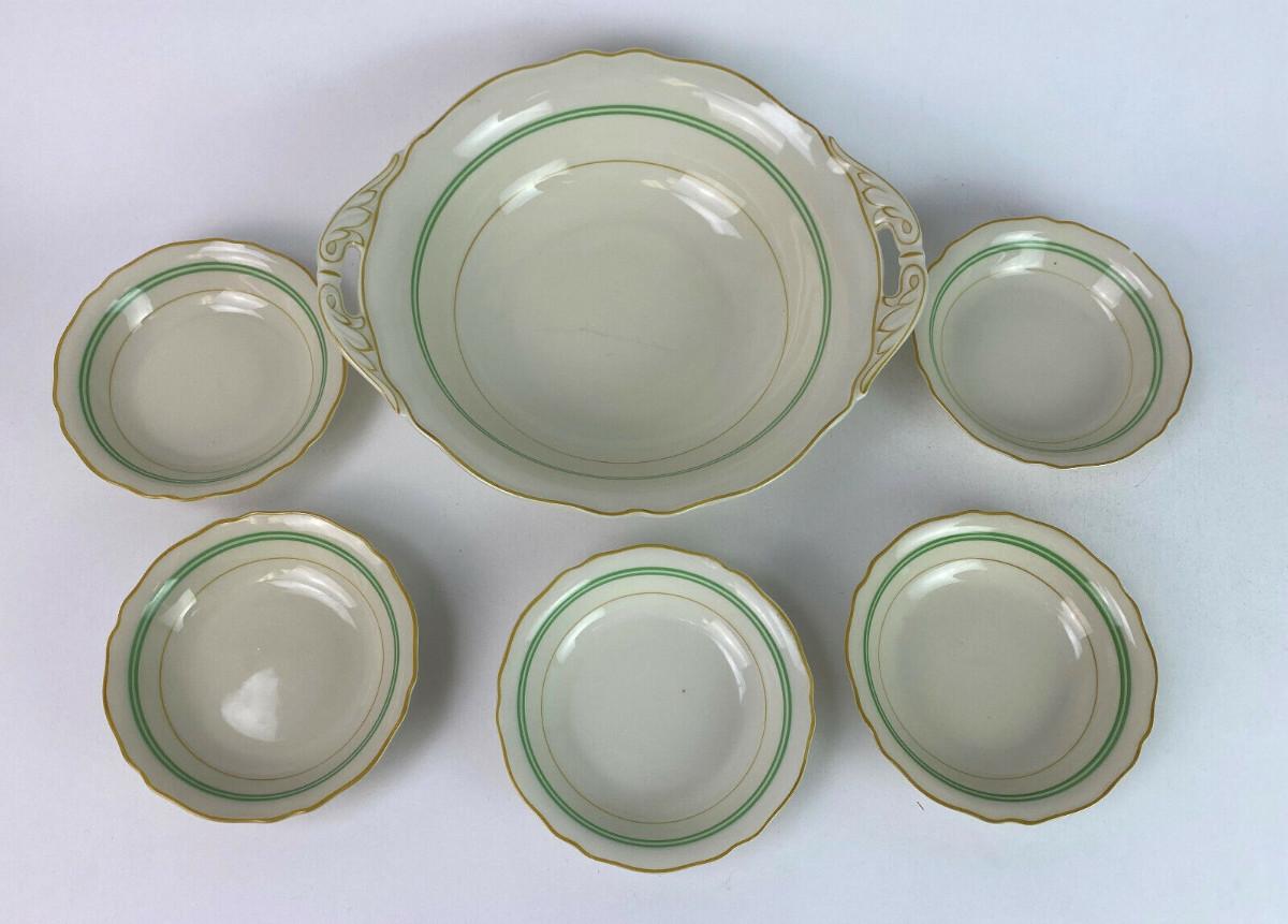 Berry Bowl Set made in Germany by Krautheim just after the war...Made in Bavaria which was in the U.S. Zone of Occupation...Large handled bowl 9"..faint tight line in bottom..still solid...ringed small bowls are 5.25"...Five..one with minor edge chip..pictured