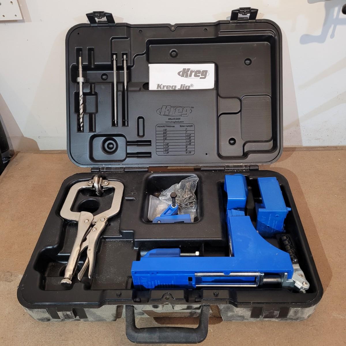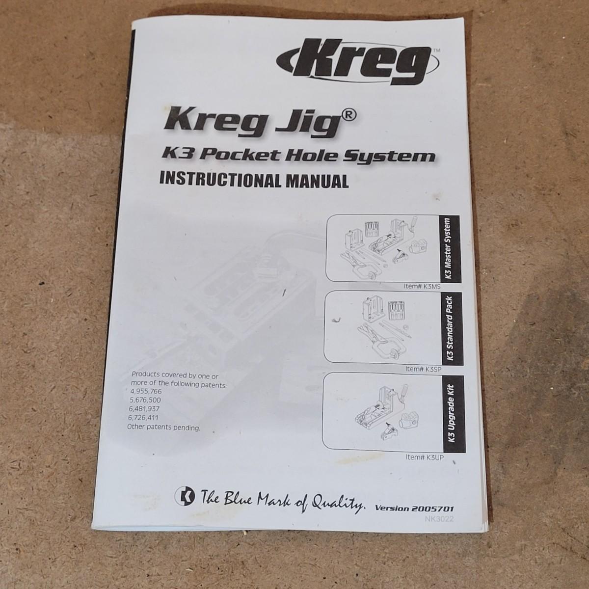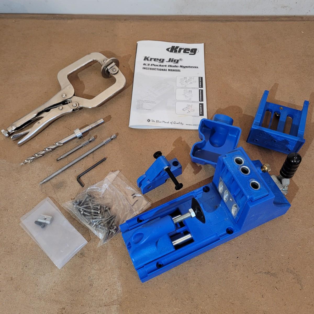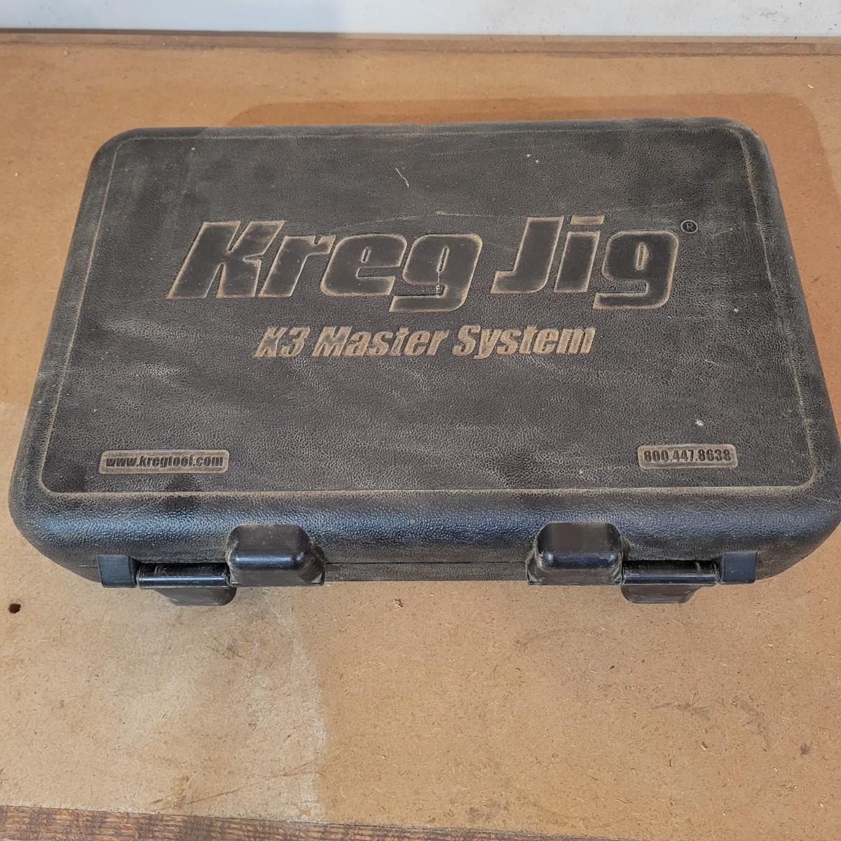 Kreg brand jig. K3 pocket hole system. Includes locking c-clamp and attachments. Also includes durable plastic carrying case. May be missing some components, see photos for what is included. Case measures 18" x 13" x 4.5"H.