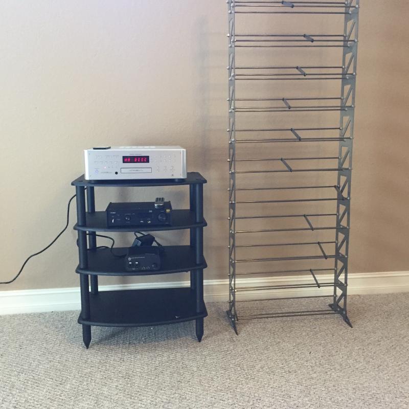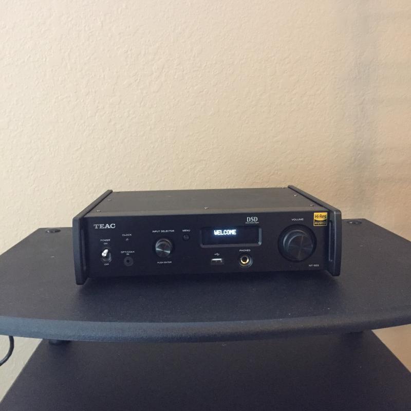 TEAC NT-503 DSD both with remotes. Headroom balanced ultra desktop amp. All three power on but we have no way to test. CD Rack and stereo shelf also included. Shelf measures 18” x 24” x 31”. Rack measures 6.25” x 23.5” x 67”. These components will make your ears happy. Local Pickup Only