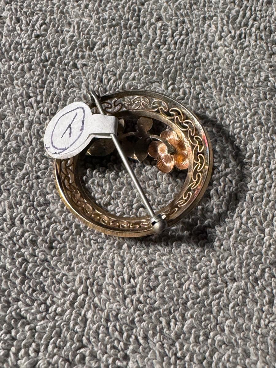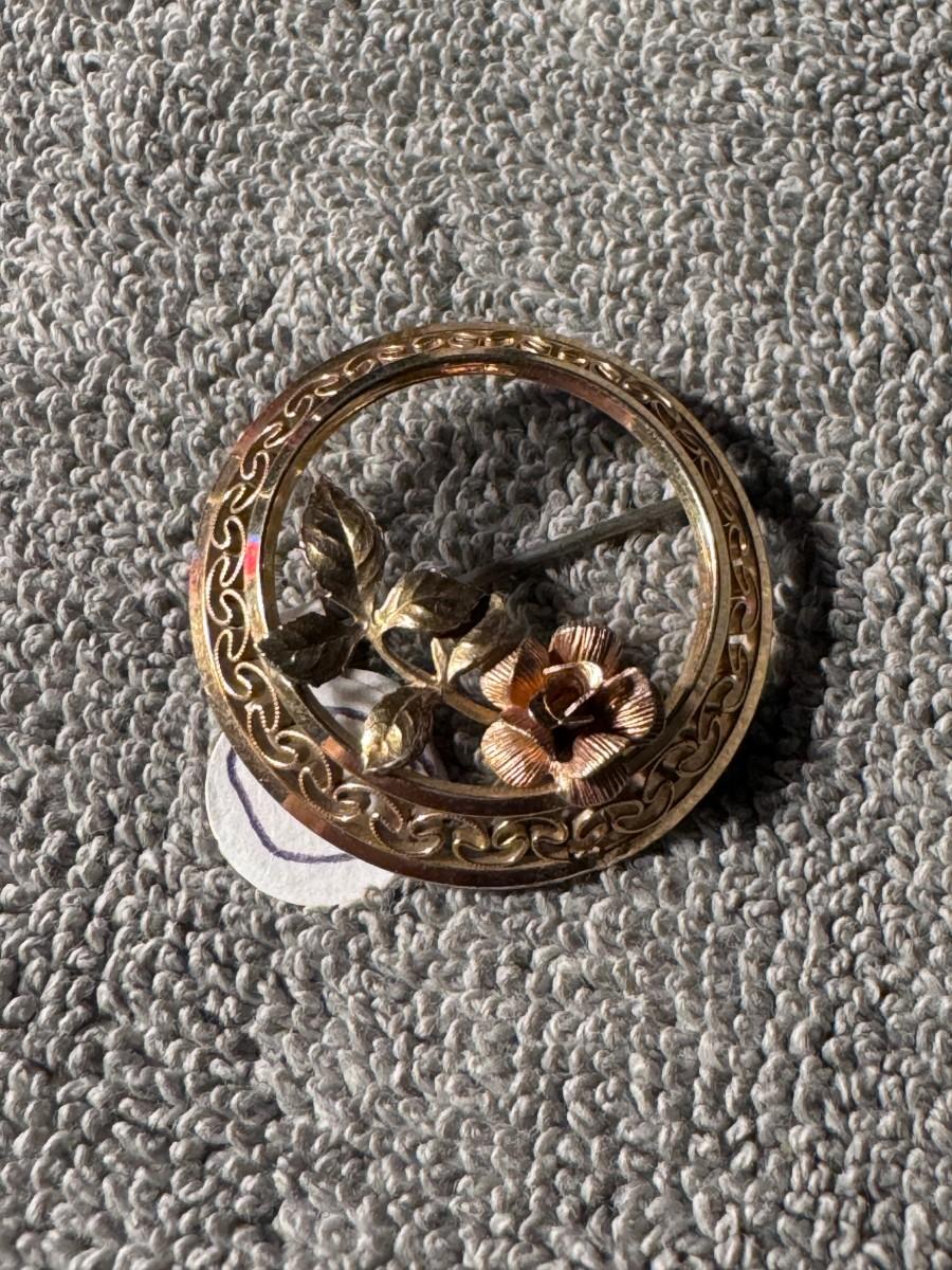 Vintage Krementz 12K Gold Filled Rose Circle Brooch Pin, likely dating from the mid-20th century.