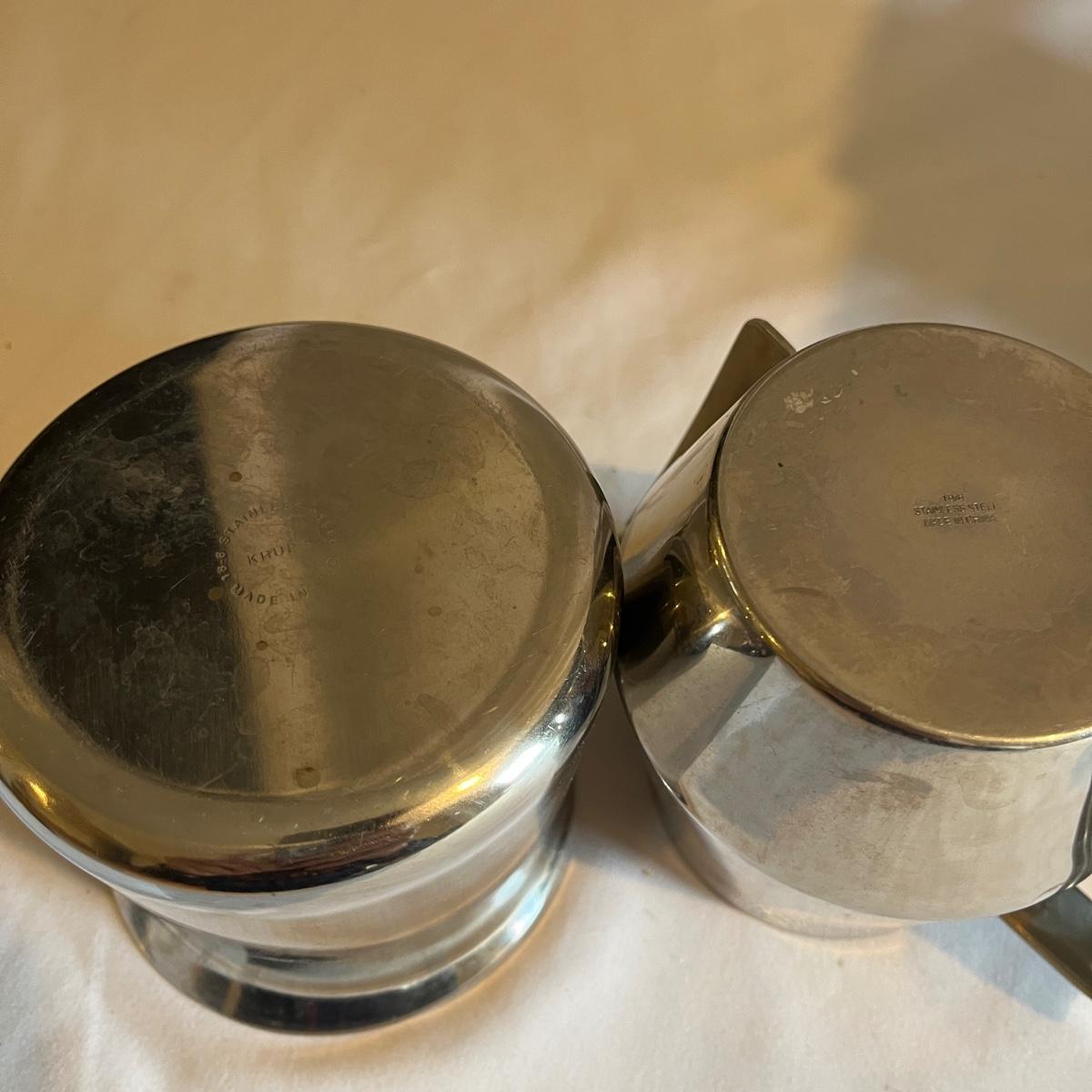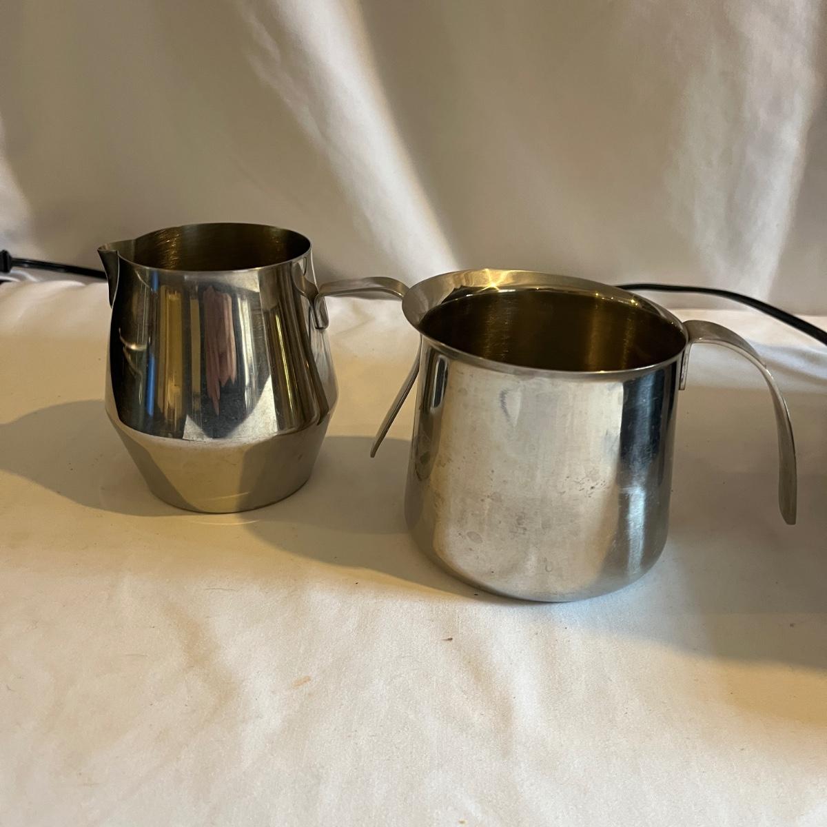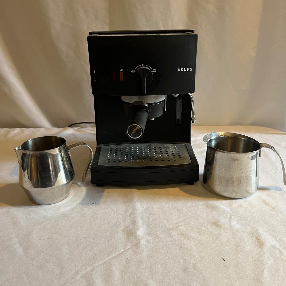 Lot includes a Krups espresso machine that powered on when plugged in. Machine measures 8” x 10” x 11”H. Also includes two stainless steel creamer pitchers.