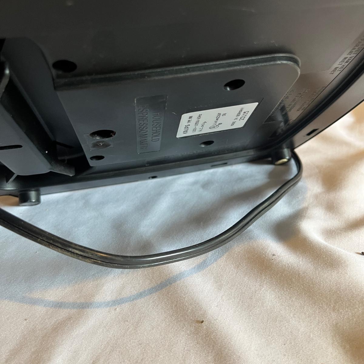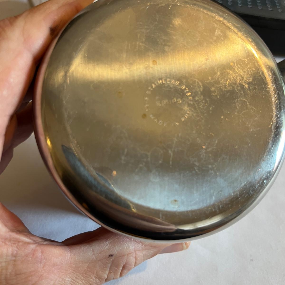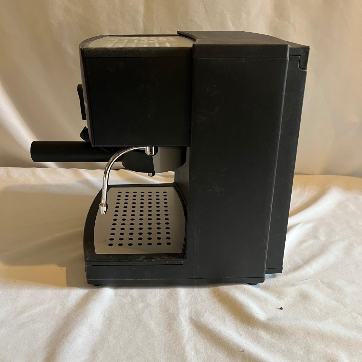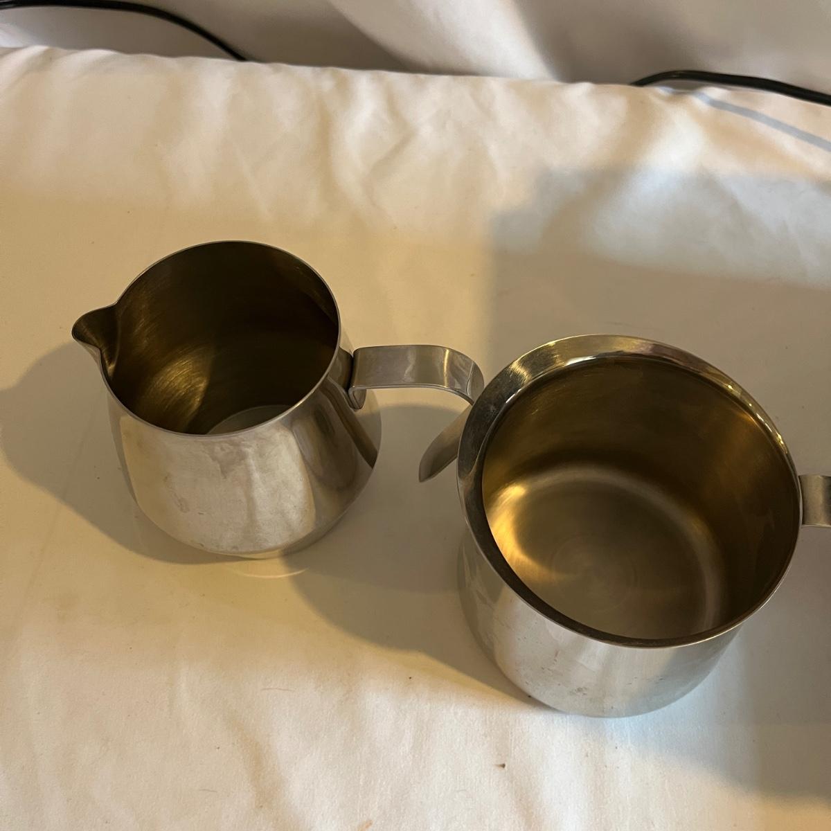 Lot includes a Krups espresso machine that powered on when plugged in. Machine measures 8” x 10” x 11”H. Also includes two stainless steel creamer pitchers.