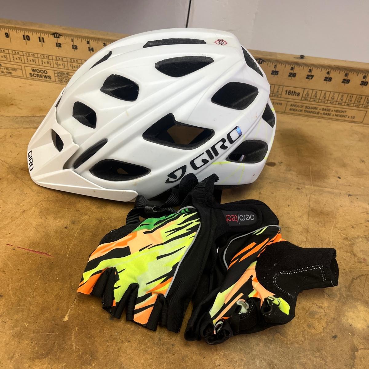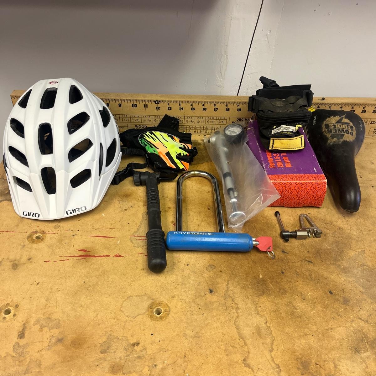 Lot includes a Kryptonite bike lock with key, Fox aluminum air pump, seat Giro bike helmet, gloves, chain breaker and more.