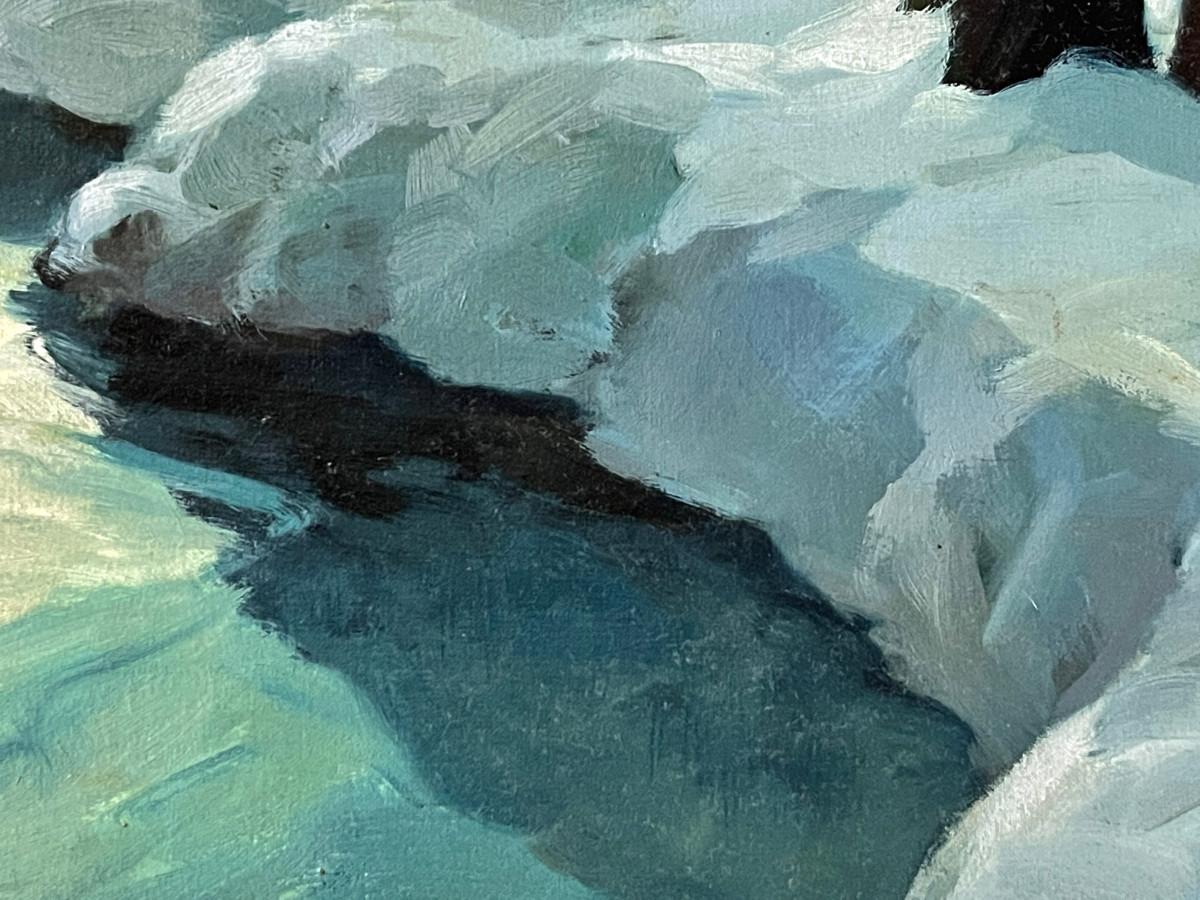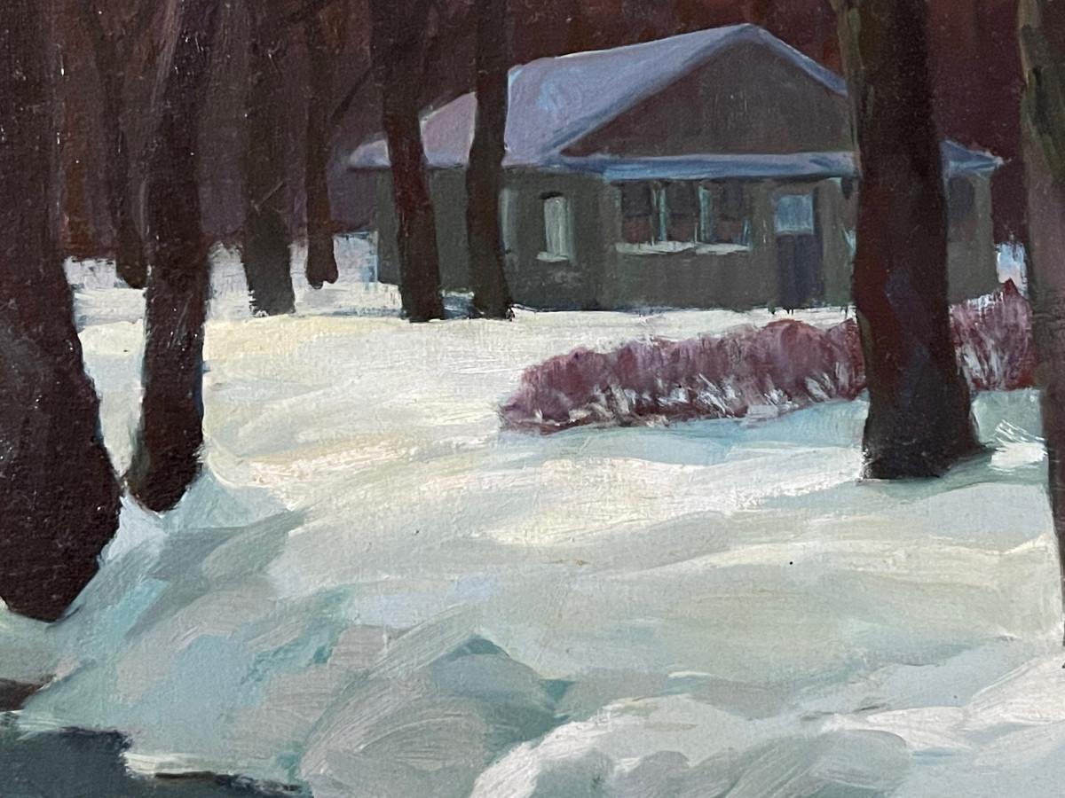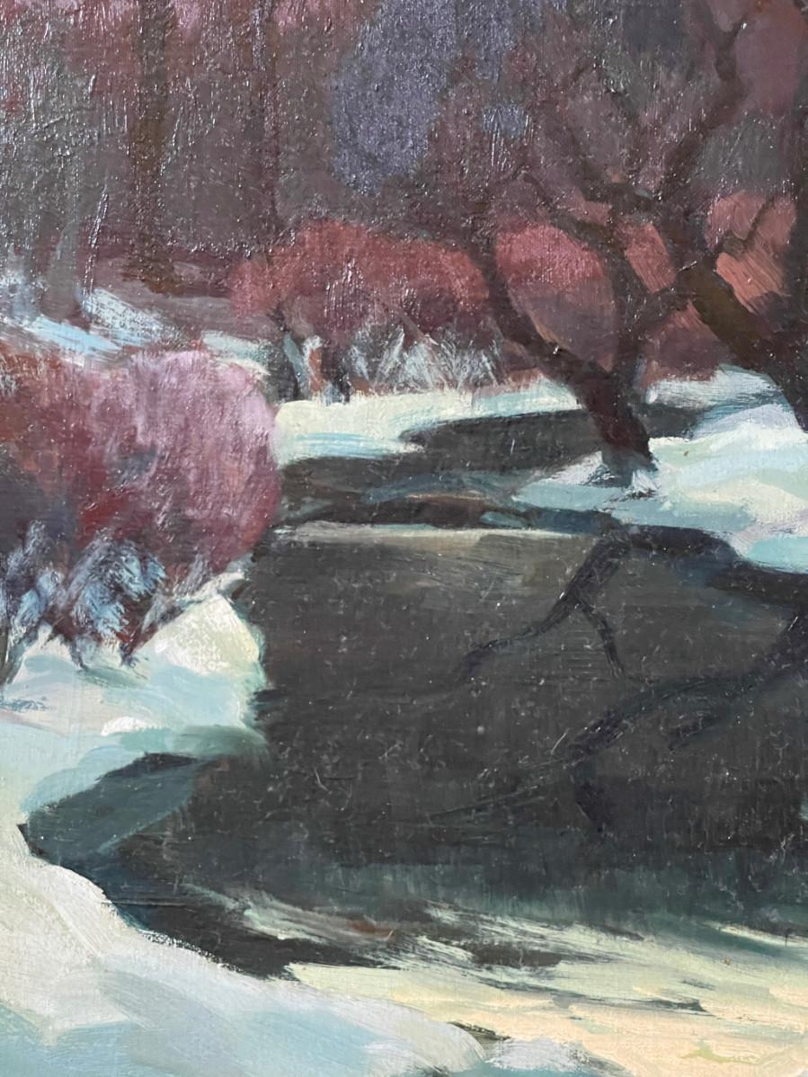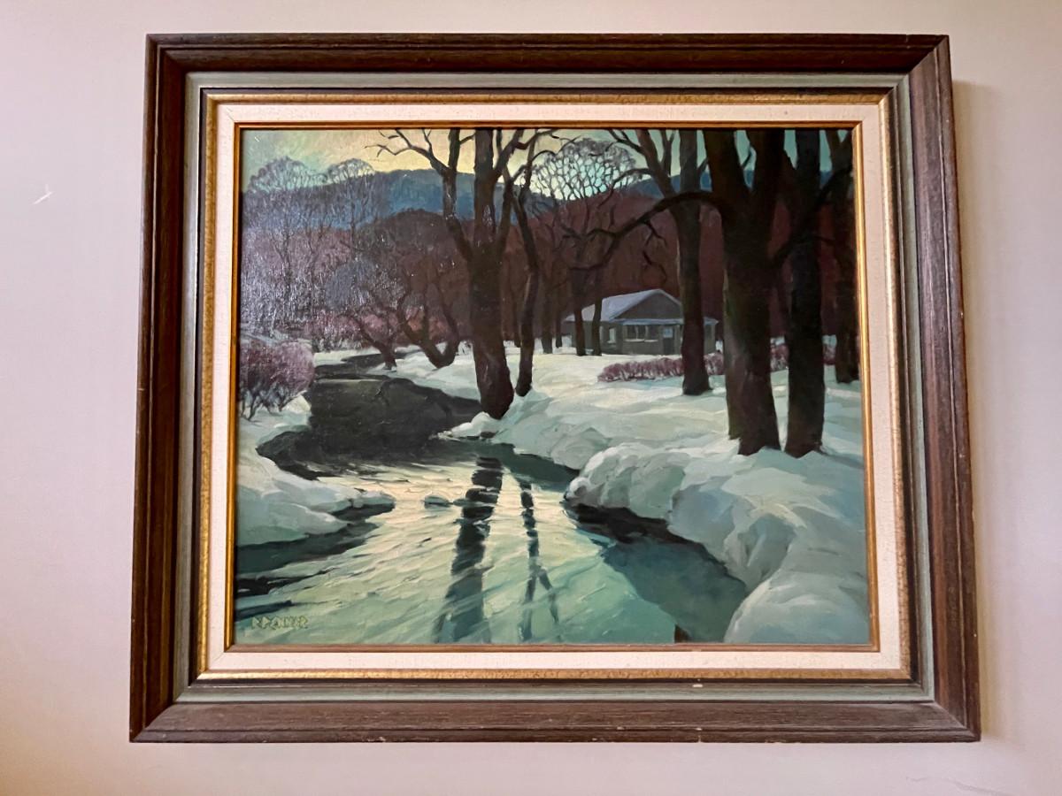 DESCRIPTION: This is a rare original oil painting by noted and listed Kansas Regionalist artist, Randy Penner. Known for his watercoloros, the artist has instead, rendered this scene in oil. A quiet, snow covered landscape with a farmhouse posed beside an icy creek with large mature trees standing by, reflect in the water. The painting has been boldly signed at the bottom left corner of the image.