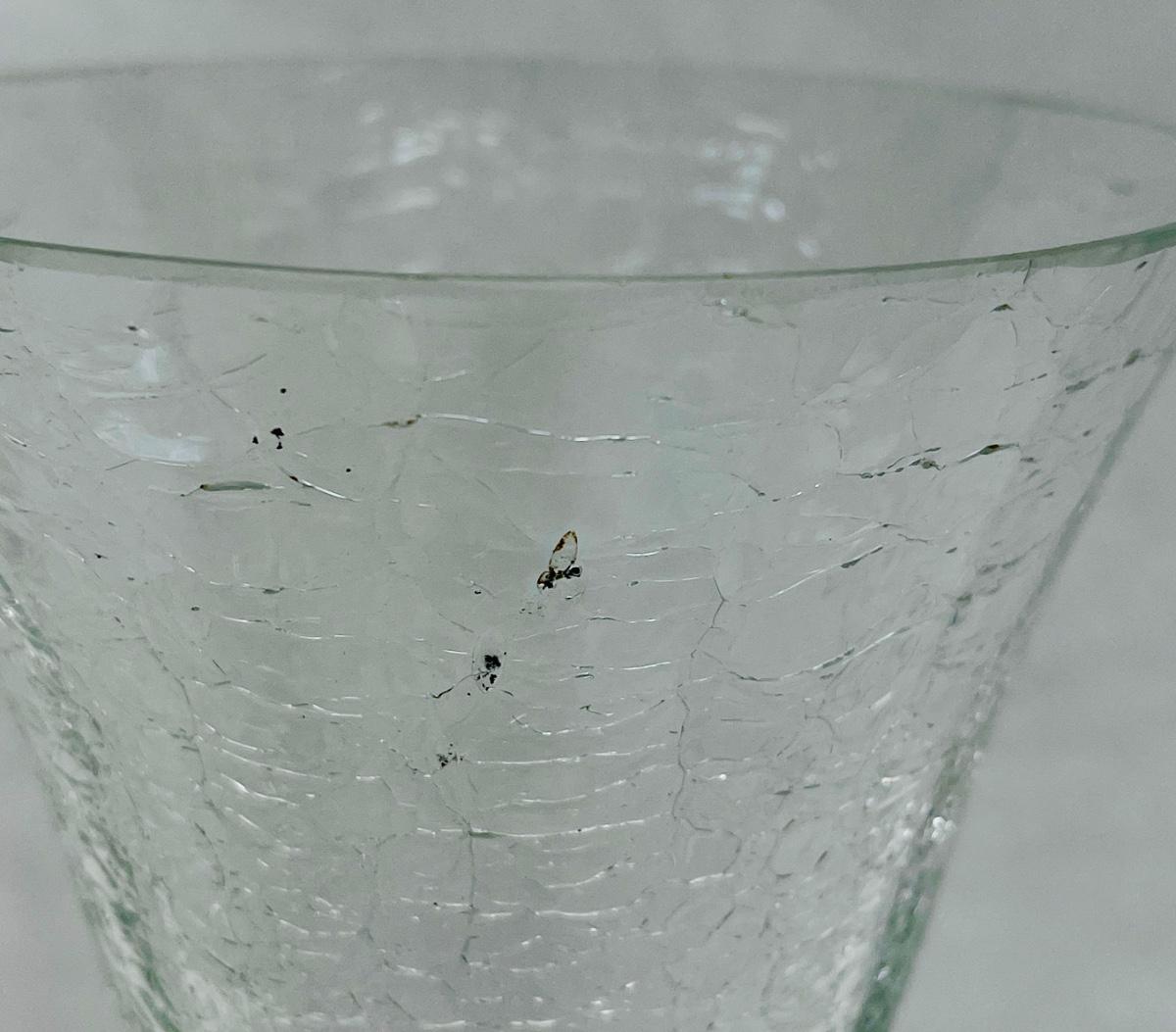 In good condition, there are mild manufacturing imperfections that are common in crackle glass.