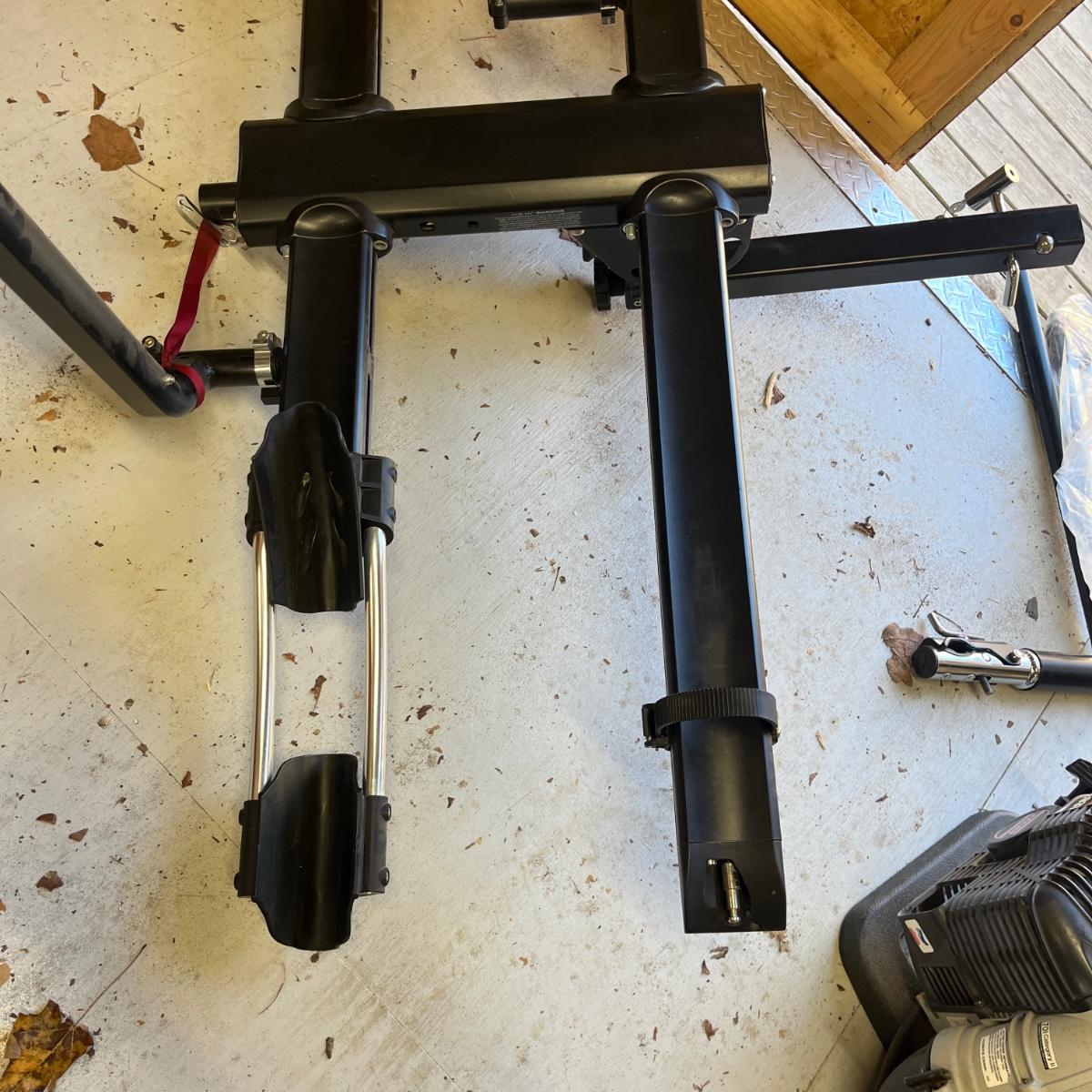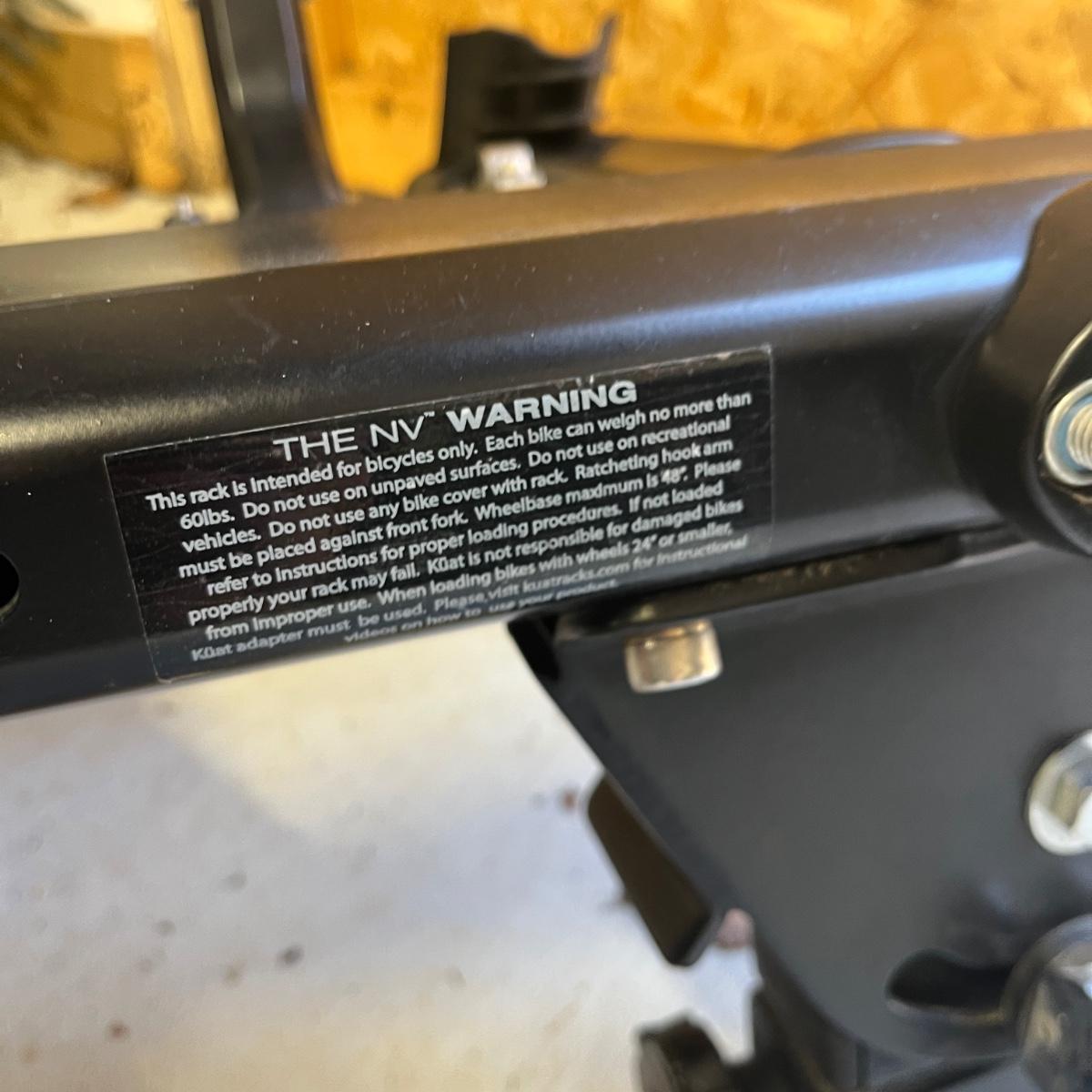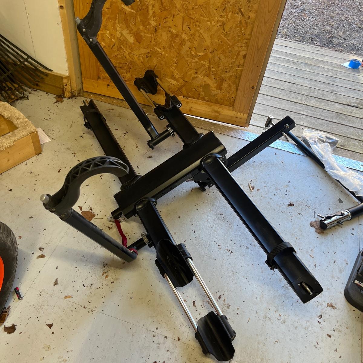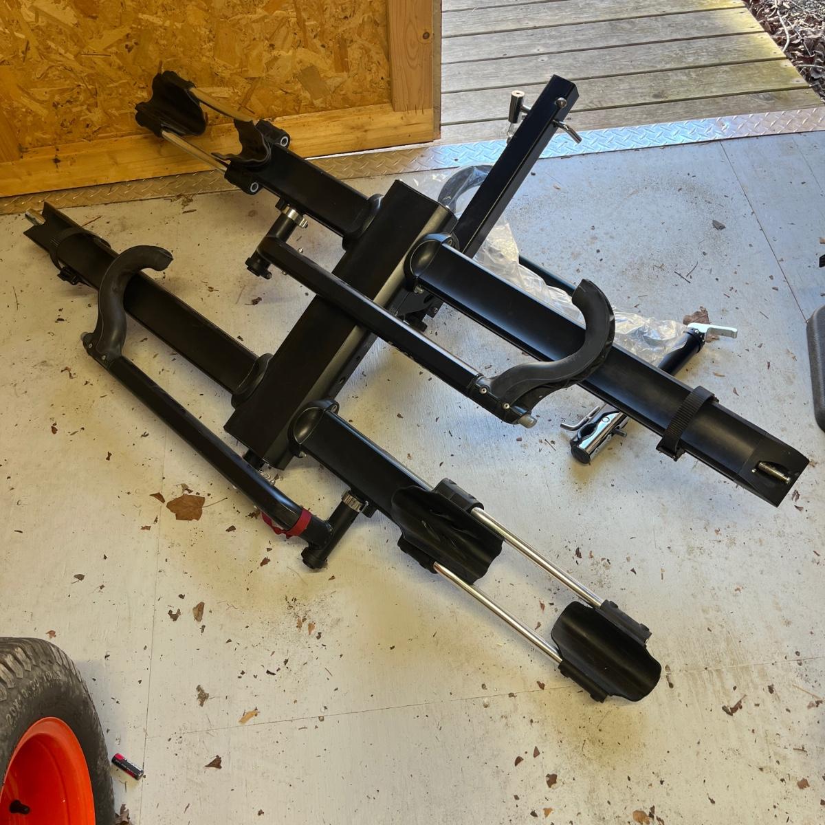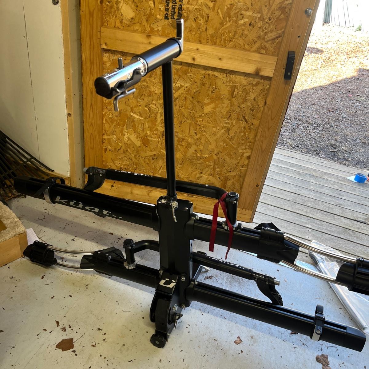 Lot includes a Kuat 2” receiver hitch bicycle rack for two bicycles. Includes a lock for receiver hitch. Rack measures 56” x 29” x 44”H when folded up.