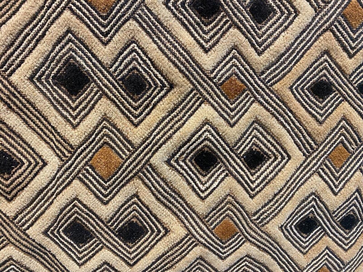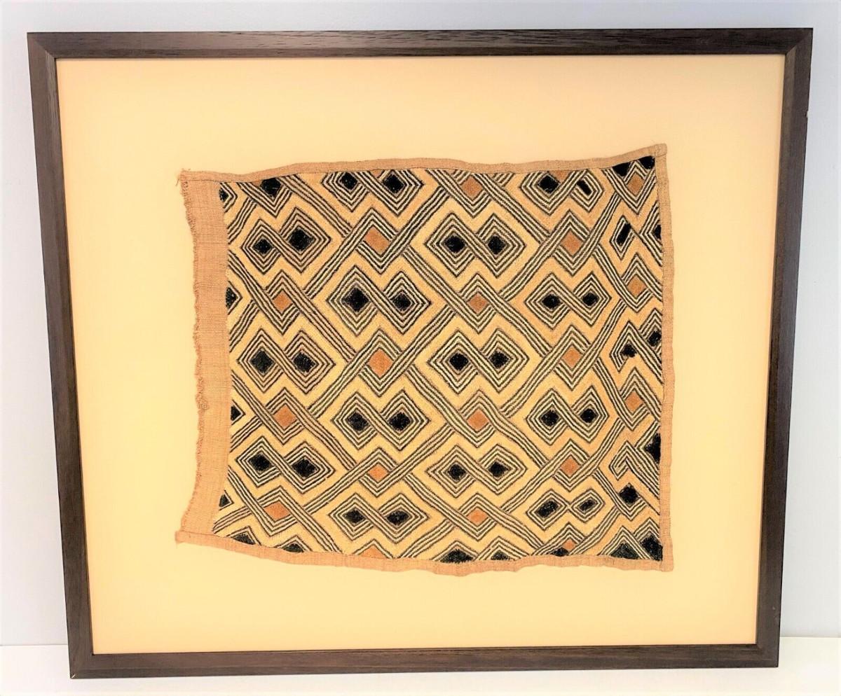 This handwoven raffia square is from the Shoowa people I believe..part of the Kuba kingdon, featuring their distinctive cut-pile velvet style...Under an art glass frame this handwoven Congo textile panel measures approx. 23 x 21"..the wooden frame is 36.5 x 32"...Shipping can be greatly reduced if we ship without the frame, your option...Excellent condition on this authentic African art...circa early 20th century.