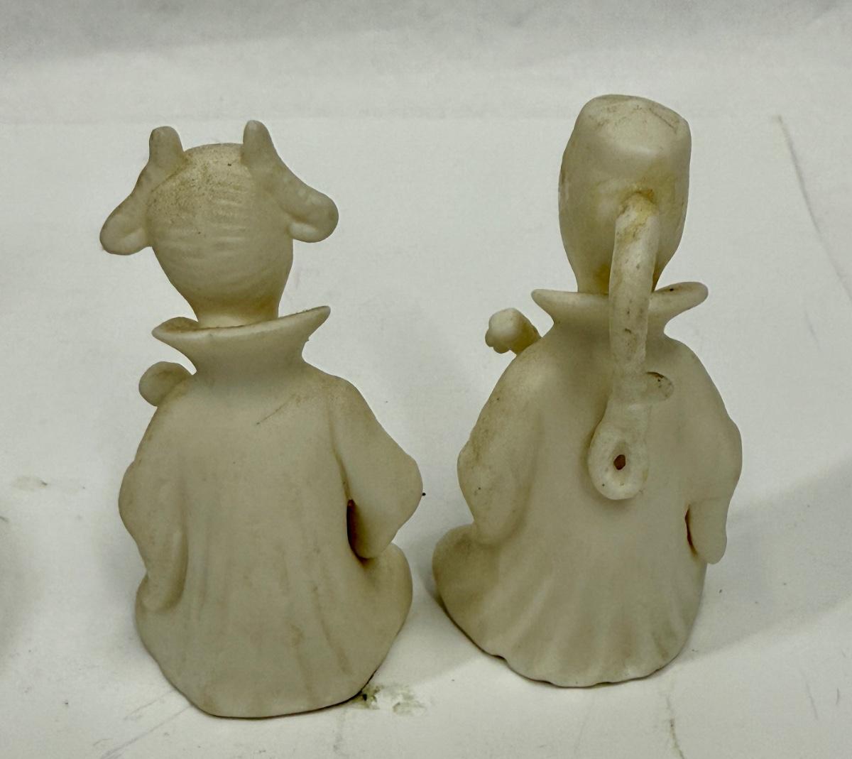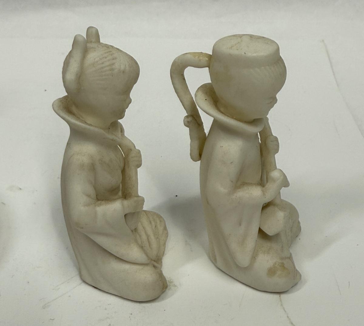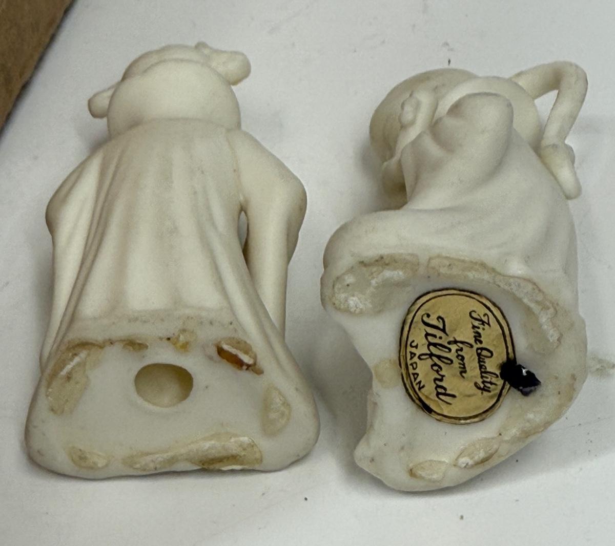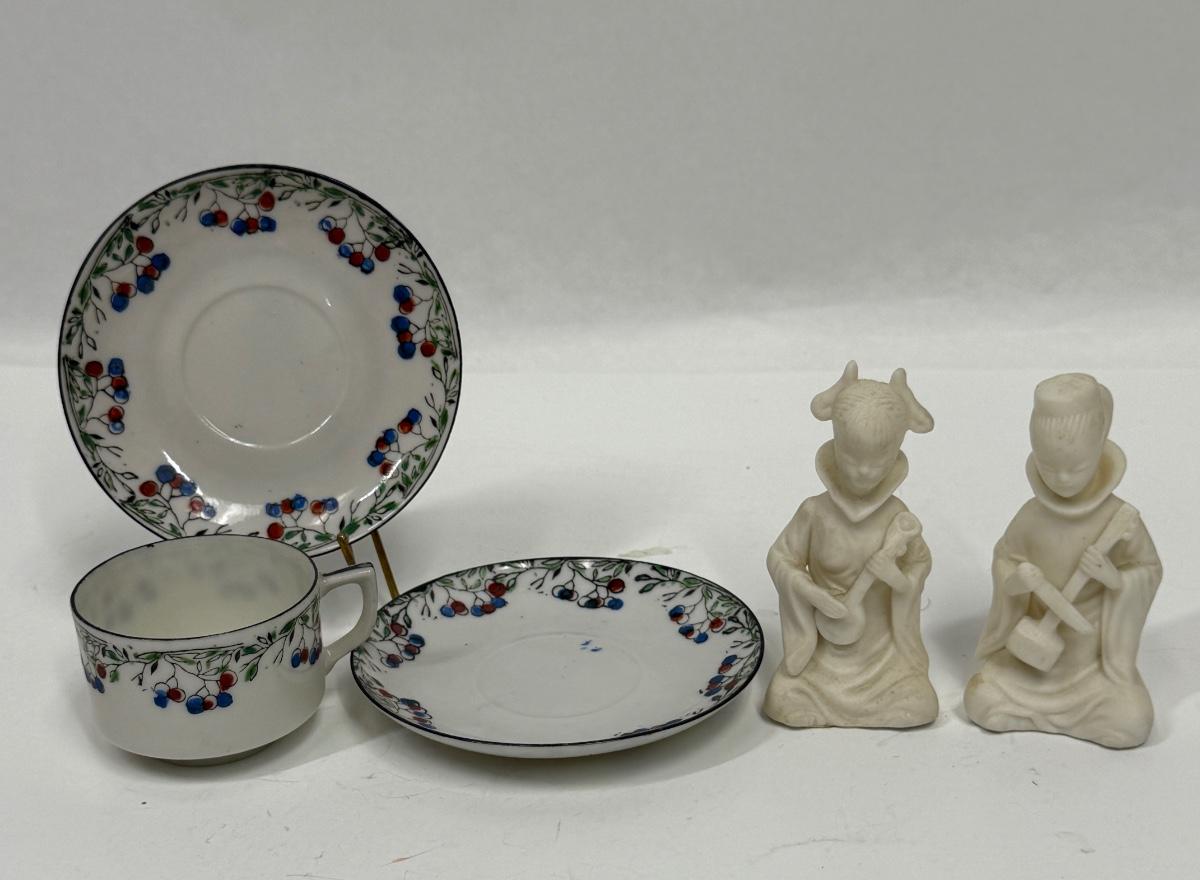 In fair to good used condition. One of the figurines has been reglued on the back of head. And one saucer has small chip.