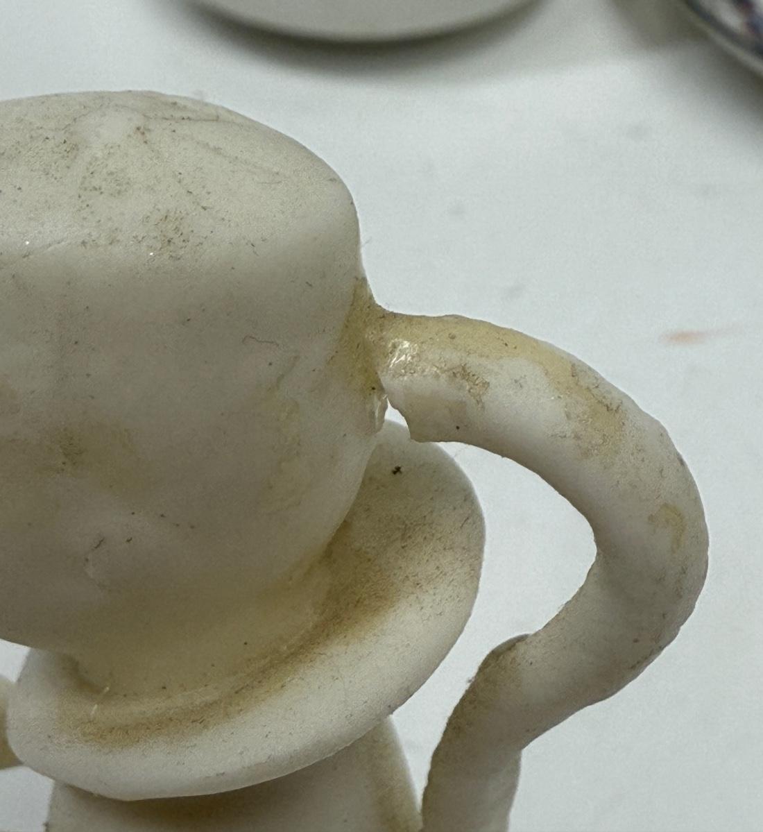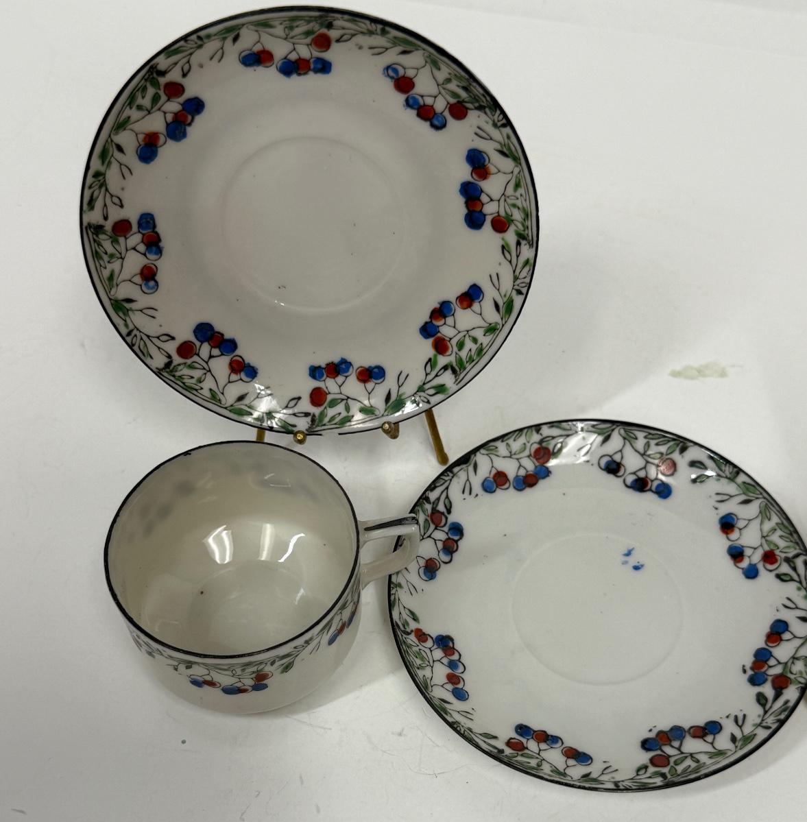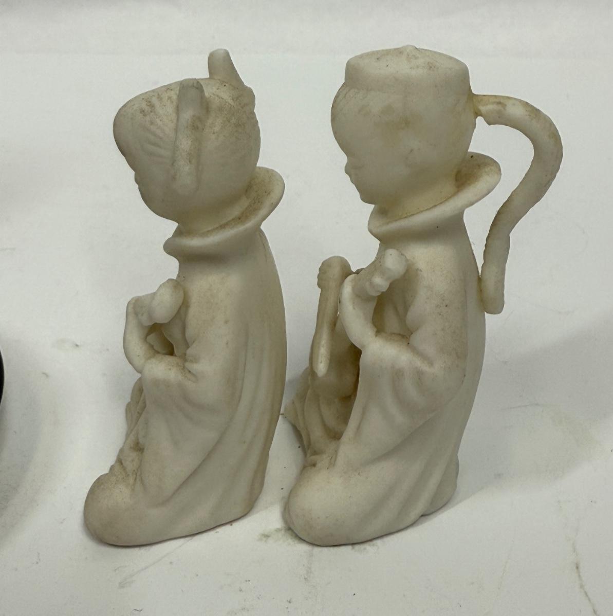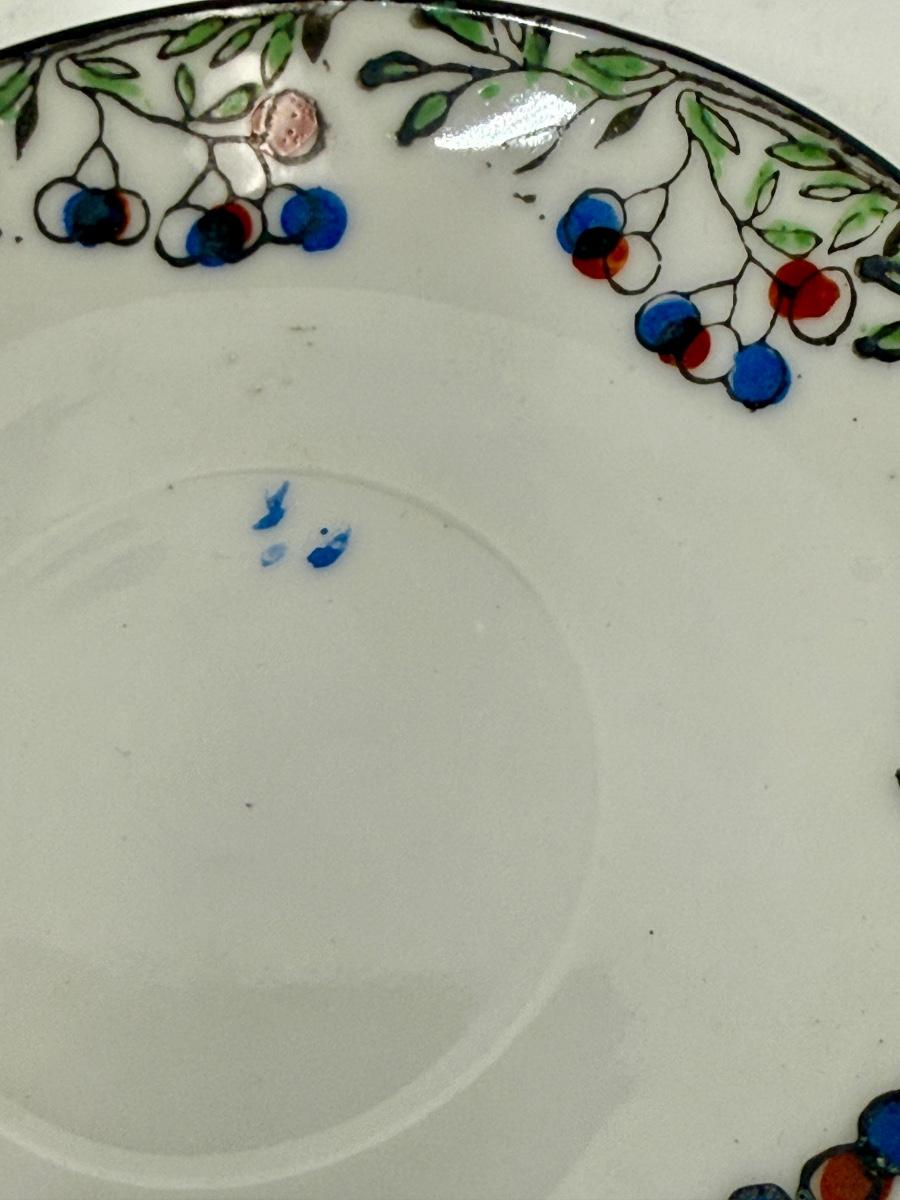 In fair to good used condition. One of the figurines has been reglued on the back of head. And one saucer has small chip.