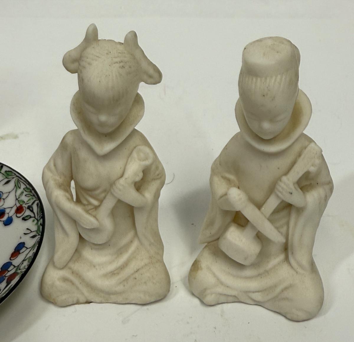 Misc Asian BricBrac Lot - figurines, saucers and cup, mini display stand
