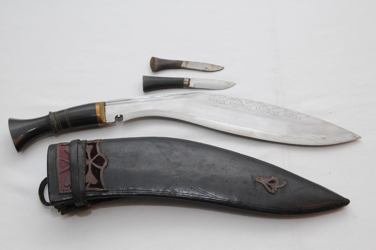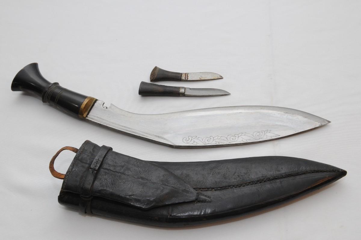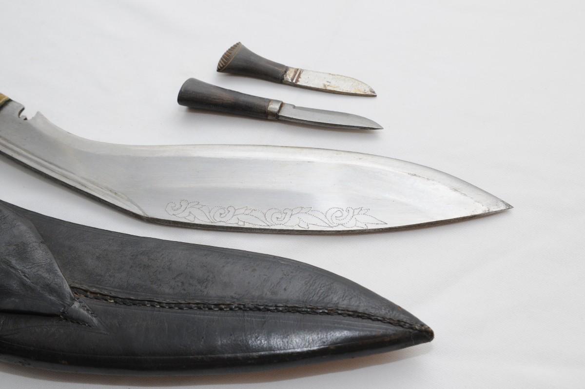Kukri - Khukuri Sword - VERY SHARP - with steel bade, wood handle, rosewood docorative sheath - very good condition. Has 2 small knives and holders in the back of the sheath. 40 cm x 5 cm