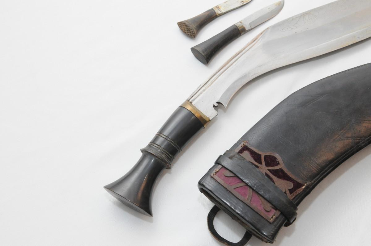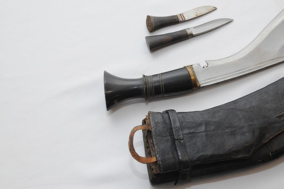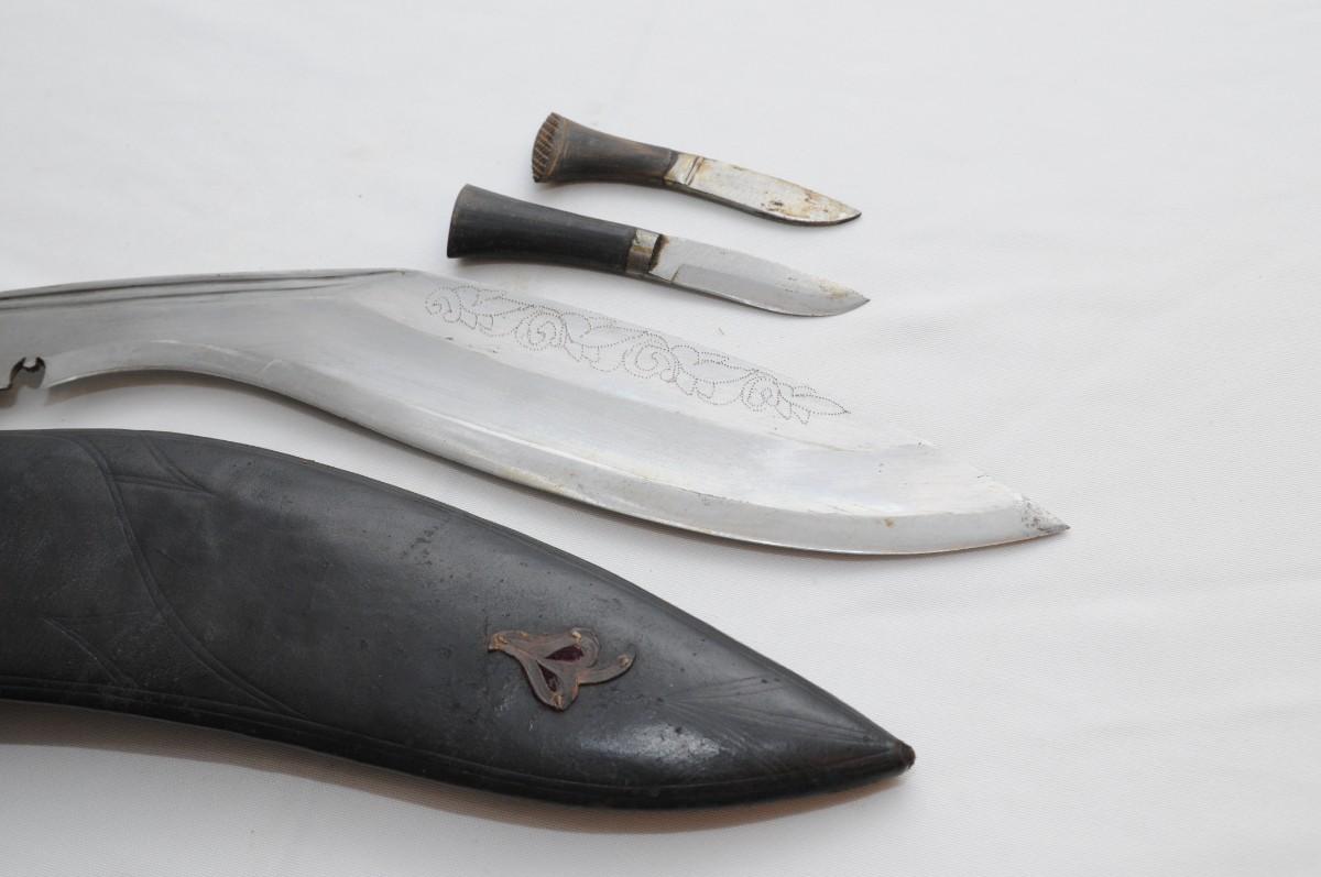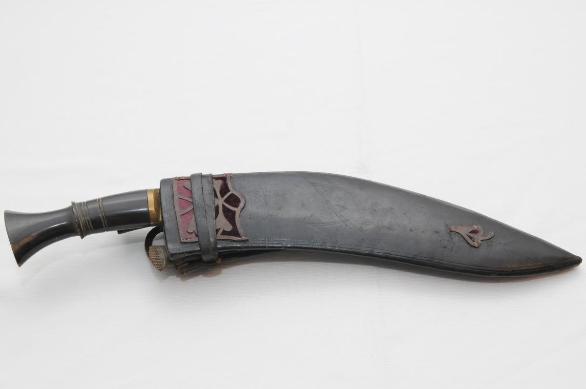 Kukri - Khukuri Sword - VERY SHARP - with steel bade, wood handle, rosewood docorative sheath - very good condition. Has 2 small knives and holders in the back of the sheath. 40 cm x 5 cm