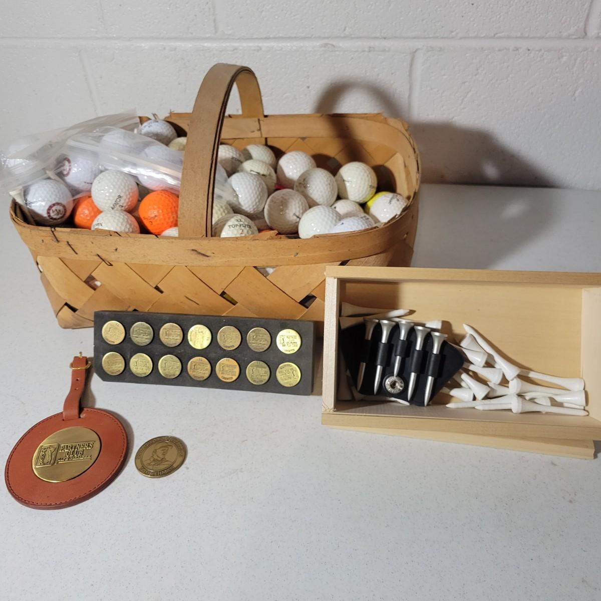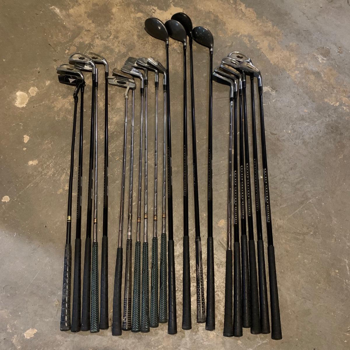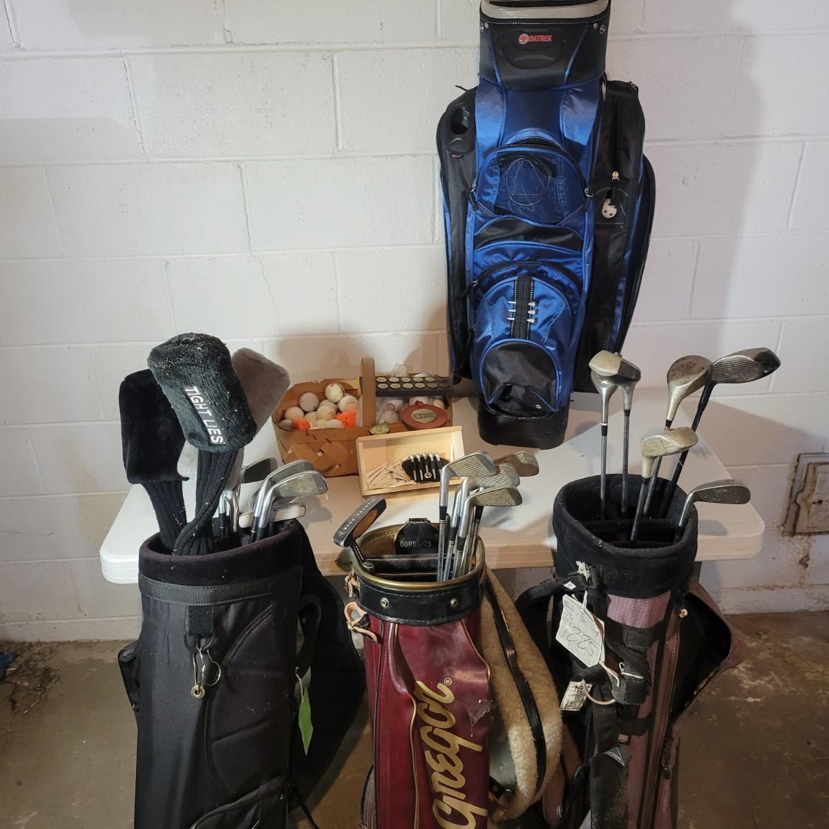 Four Golf bags and one full set of Kunnan clubs and assorted NorthWestern and Dunlop clubs in good condition, but used. The clubs range in length from about 35” to 45”. Includes four golf bags made by Datrek, McGregor, an unamed bag and an unused Datrex bag. A full set of Kunnan Alliance clubs and an assortment of Northwestern and Dunlop clubs. Also icludes a large assortment of golf balls that includes tees, PGA ball markers, a bag identifier and medallion. A basket full of various balls. Local pickup only