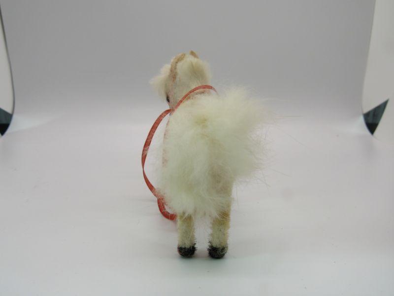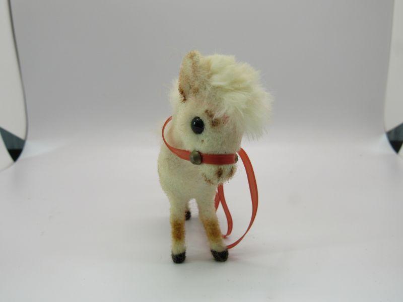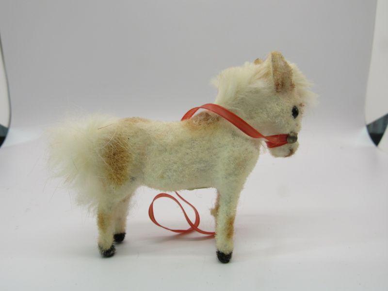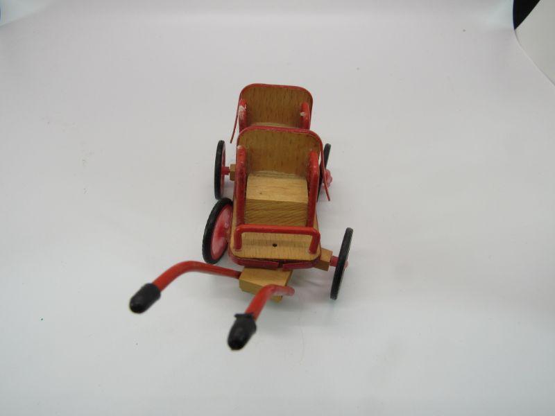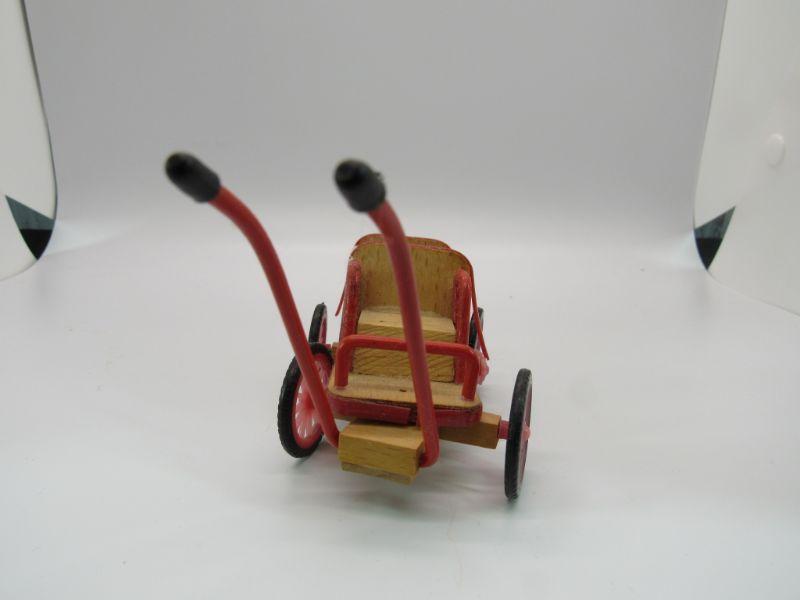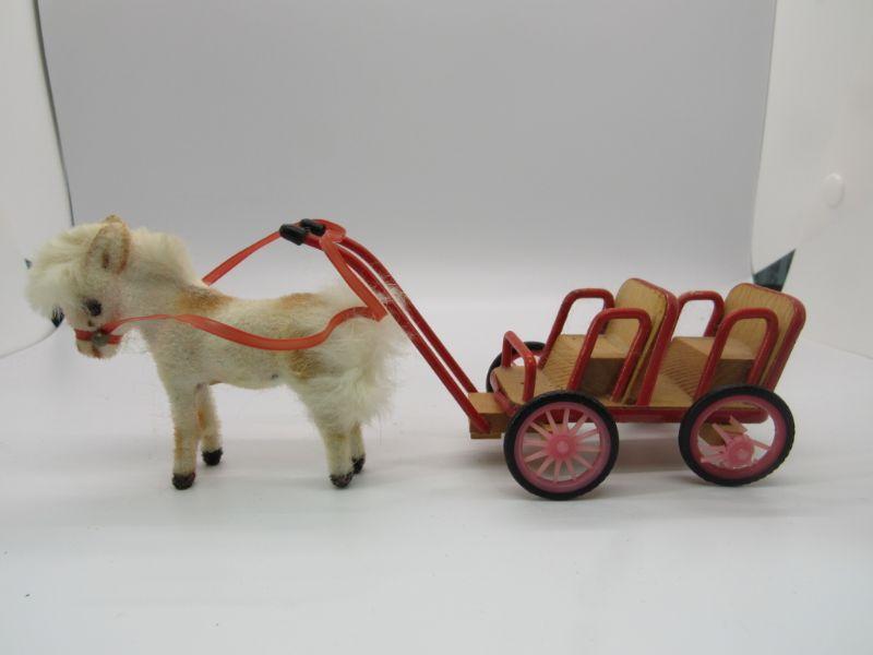 Small cart pulled by a small horse. One wheel is damaged. Cute cart made from wood. Kunstlerschutz West Germany on horse. #020-499a8