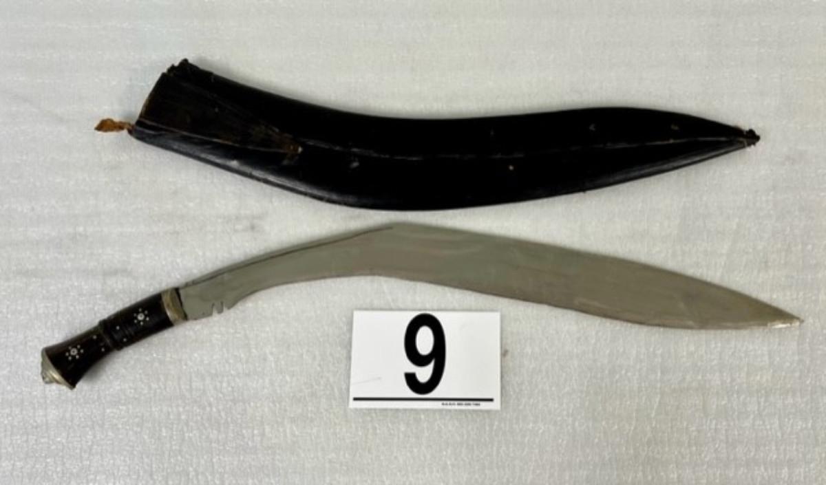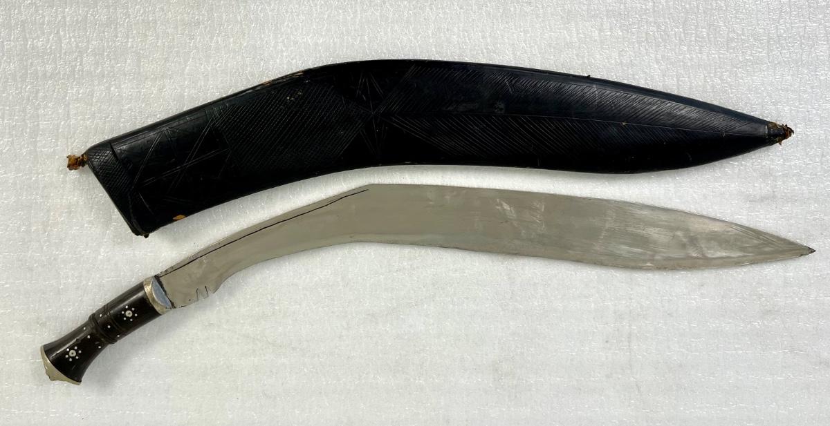 Made in India. Includes leather sheath. 24"L (blade). SOLD AS IS.