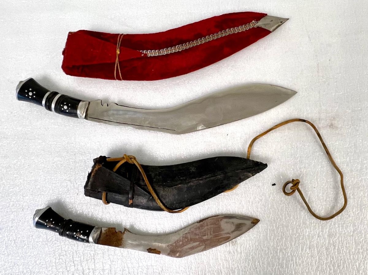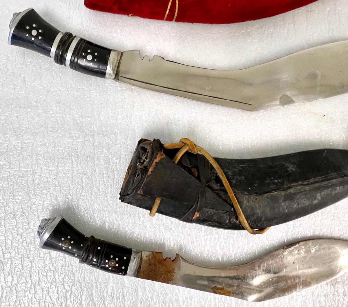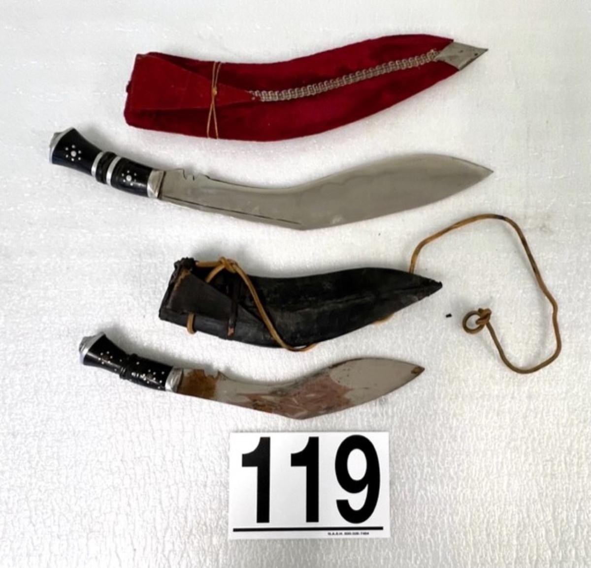 Made in India. Includes leather sheaths. Total of 2 pieces. There is some rust on the smaller knife (pictured). Longest blade length is 12". SOLD AS IS.