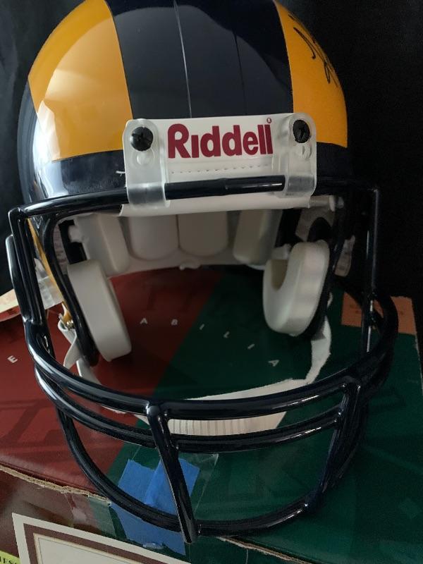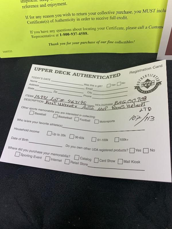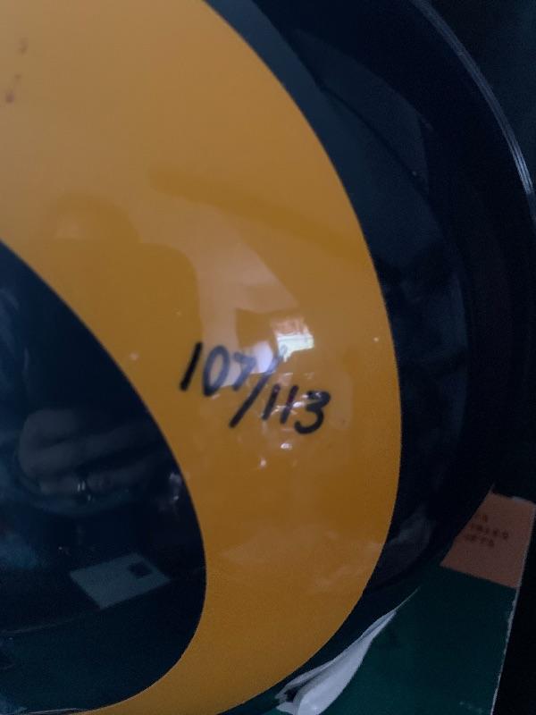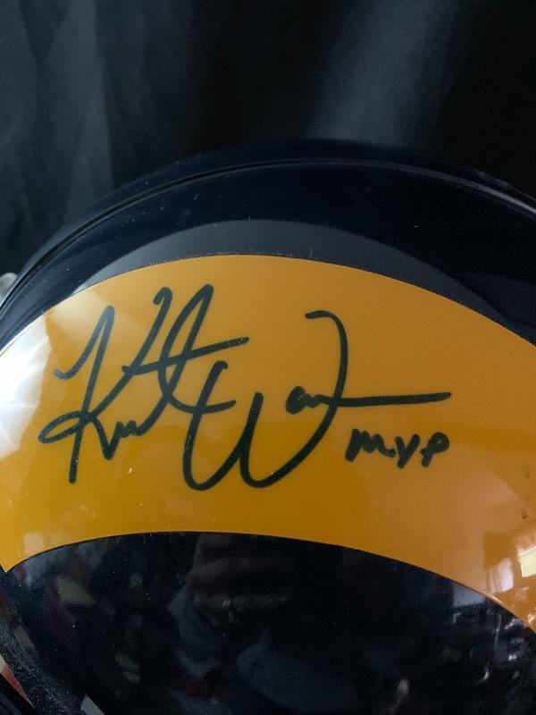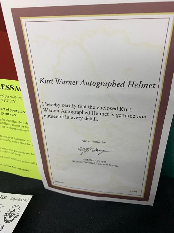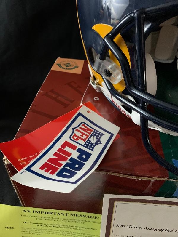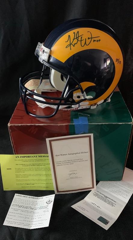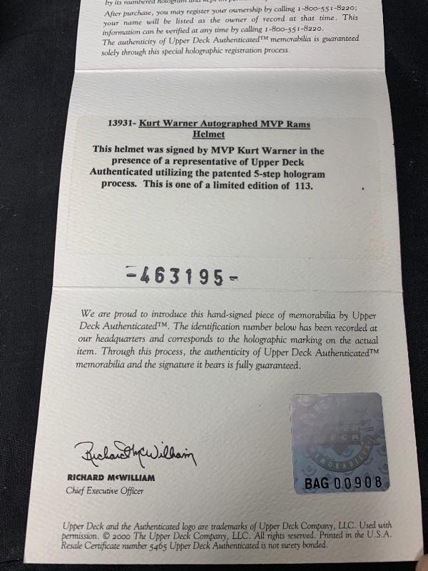 EARLY 2000'S AUTHENTIC PRO LINE ST. LOUIS RAMS HELMET THAT HAS BEEN SIGNED BY HALL OF FAMER AND 2 TIME LEAGUE MVP KURT WARNER.THIS WAS SIGNED FOR UPPER DECK AUTHENTICATED AFTER HIS MVP AND SUPER BOWL WINNING SEASON. IT IS A LIMITED EDITION OF 113 AND INCLUDES THE 'MVP' INSCRIPTION.IT HAS THE UDA HOLOGRAM. THE ORIGINAL COA & BOX ARE INCLUDED.