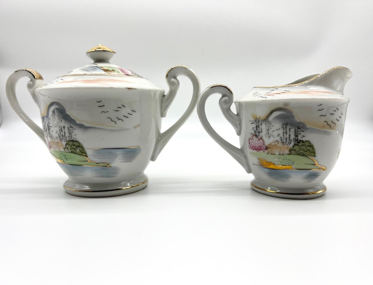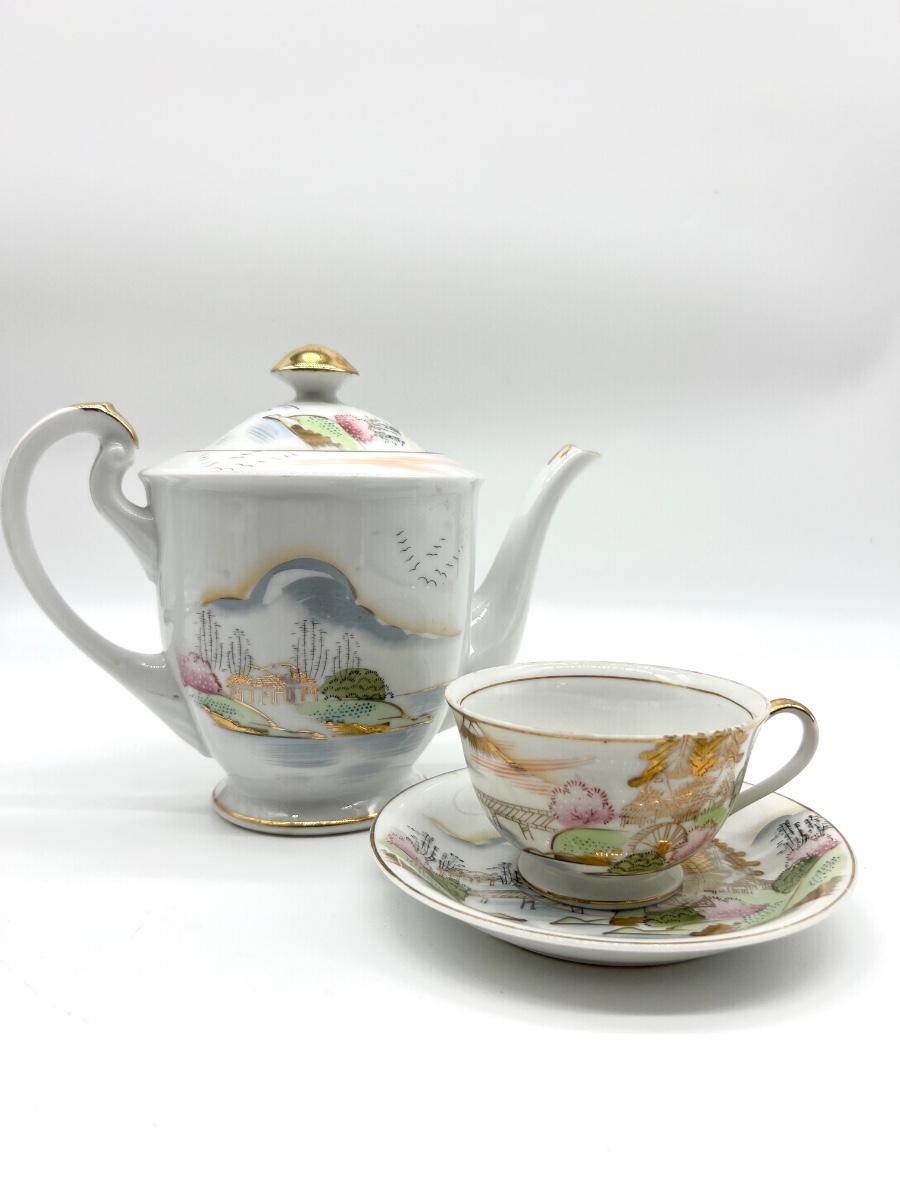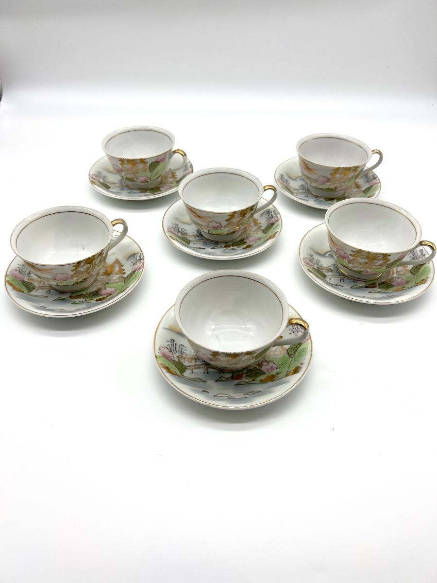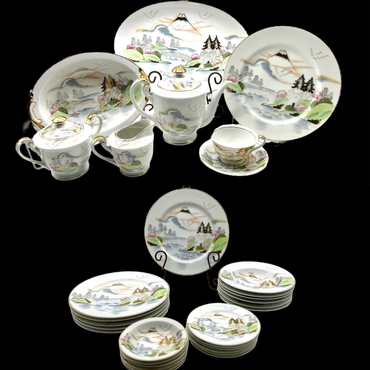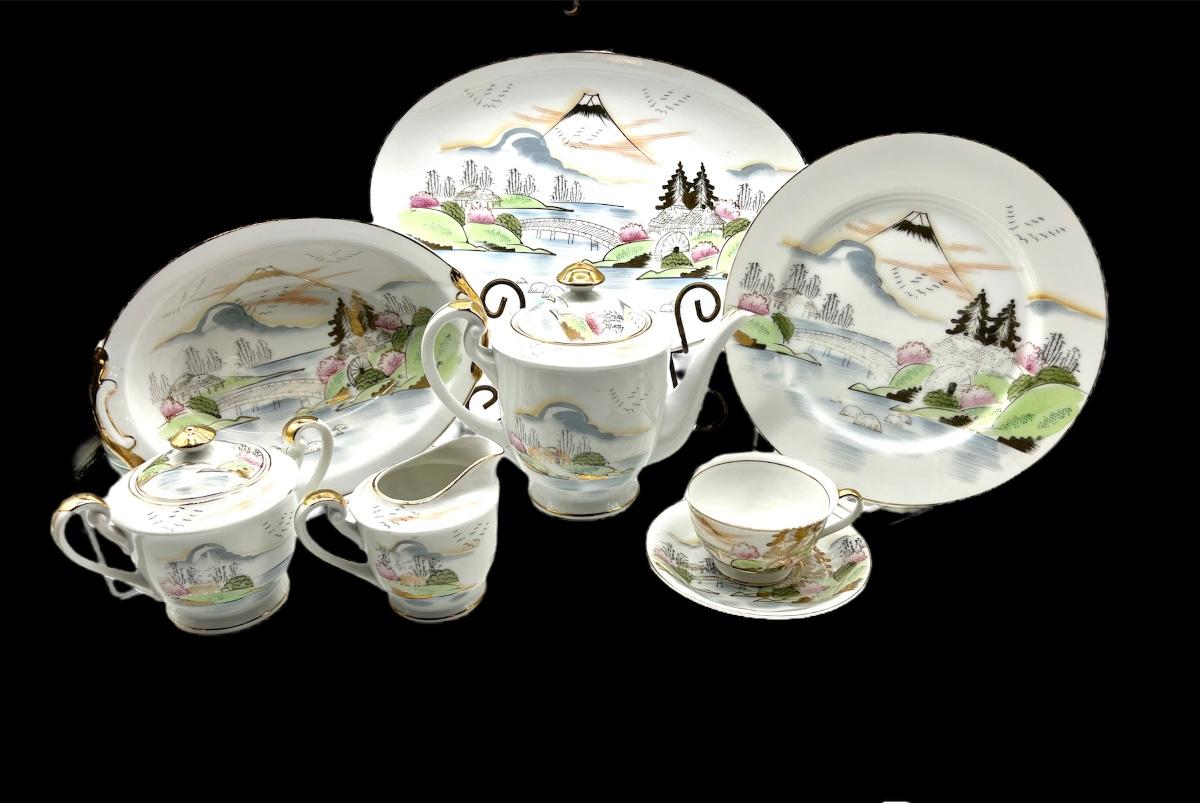 Kutani Japan Porcelain Hand Painted Large Gold Trimmed serving for 6. Includes one Oval Serving Platter, one serving gold trim bowl, one cream and sugar set, one tea pot,.six tea cups with saucers, six dinner plates, six salad bowls, six small bowls, and six dessert plates. Stand not included.