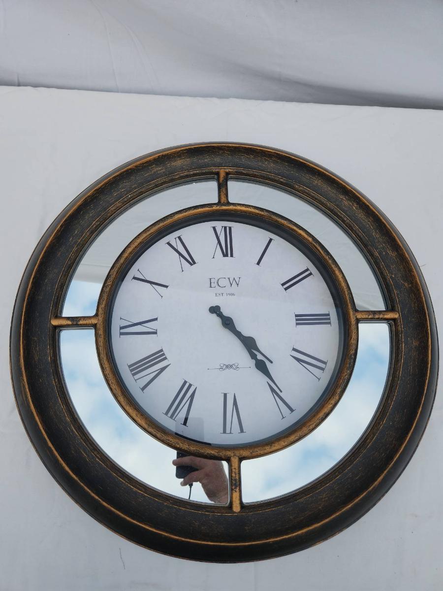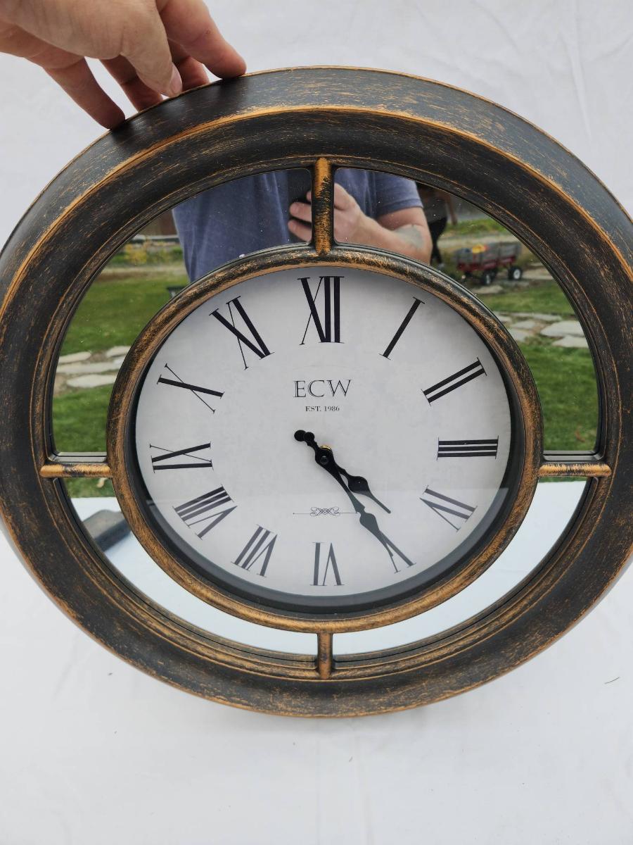 K&W wall clock featuring a distressed metallic frame with an antique-style finish. The clock face displays large Roman numerals and black spade hands for easy readability. Ideal for wall mounting, the clock is battery-operated (batteries not included). Notable design detail includes a visually segmented frame with glass inserts.