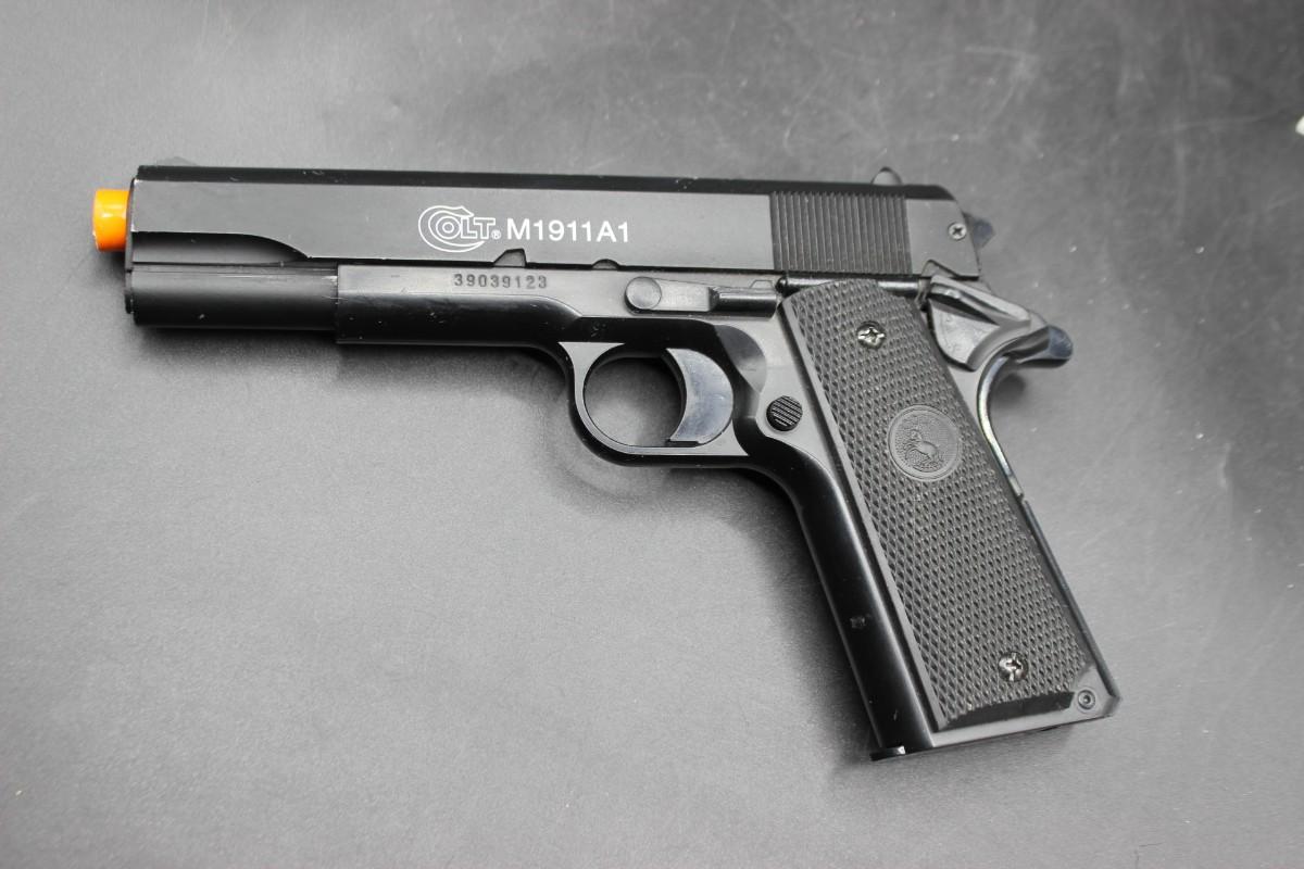 KWC Colt air soft handgun with paper target sheets. CO2 fire. Model #M1911 A1. NOT FOR CHILDREN. NOT A TOY. FOR USE BY ADULTS OVER THE AGE OF 18.