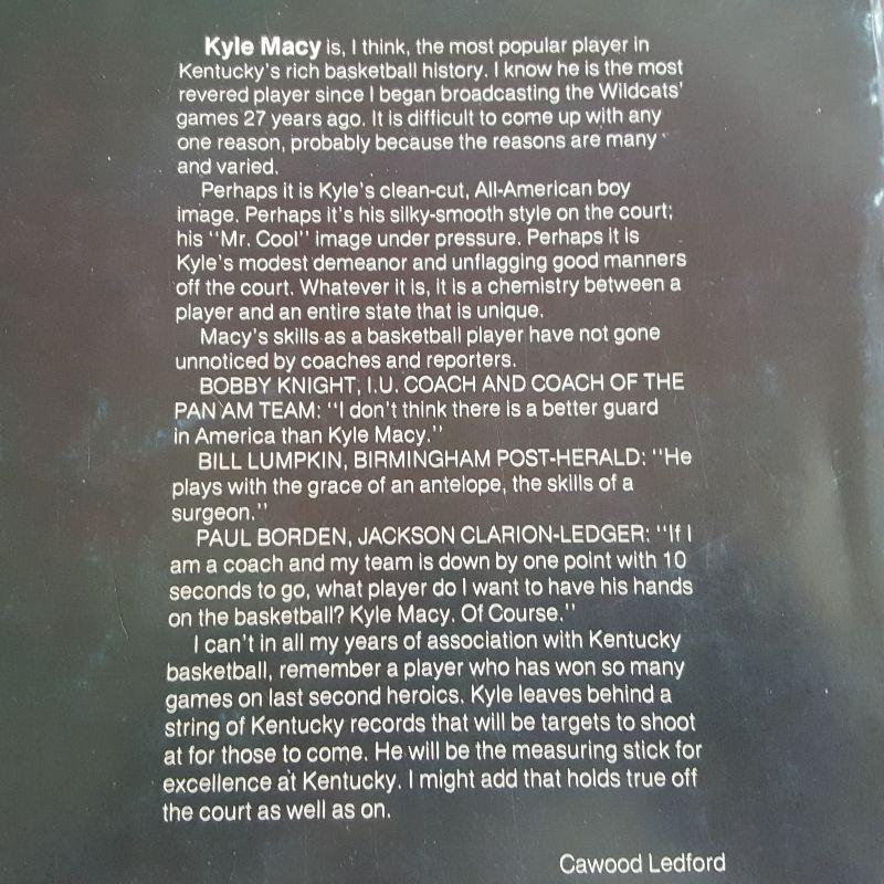 This auction lot is for a pristine copy of the Macy Book - the Kyle Macy - UK Basketball Star - Autographed Autobiography. This paperback book written in 1980 is the story of one of the University of Kentucky's GOATs. Co-written by Cawood Ledford. Book measures about 7-inches X 10-inches and has 128 pages filled with b/w photos and information about Kyle. Authentically signed.