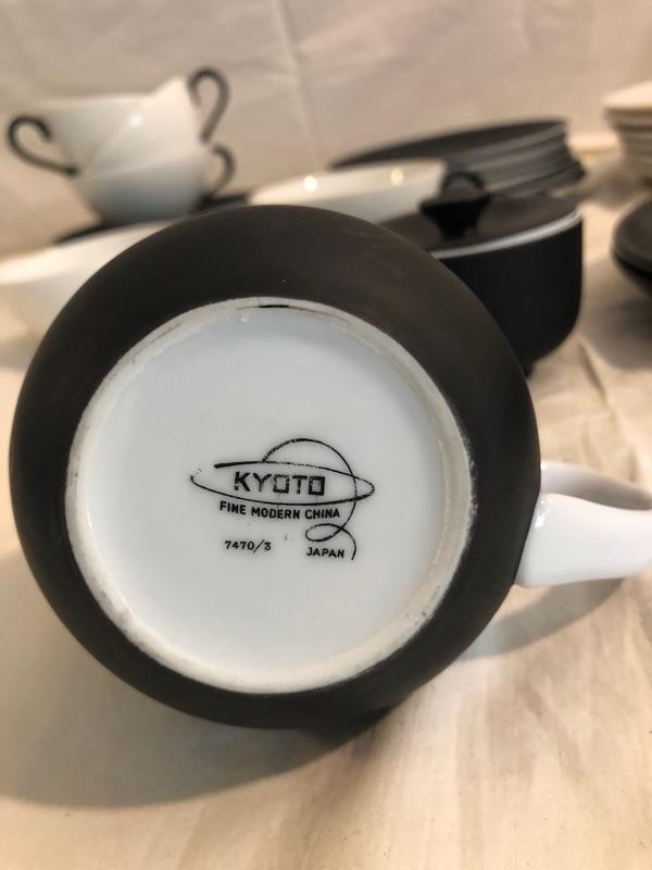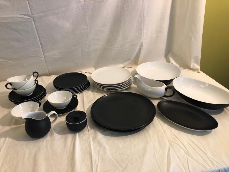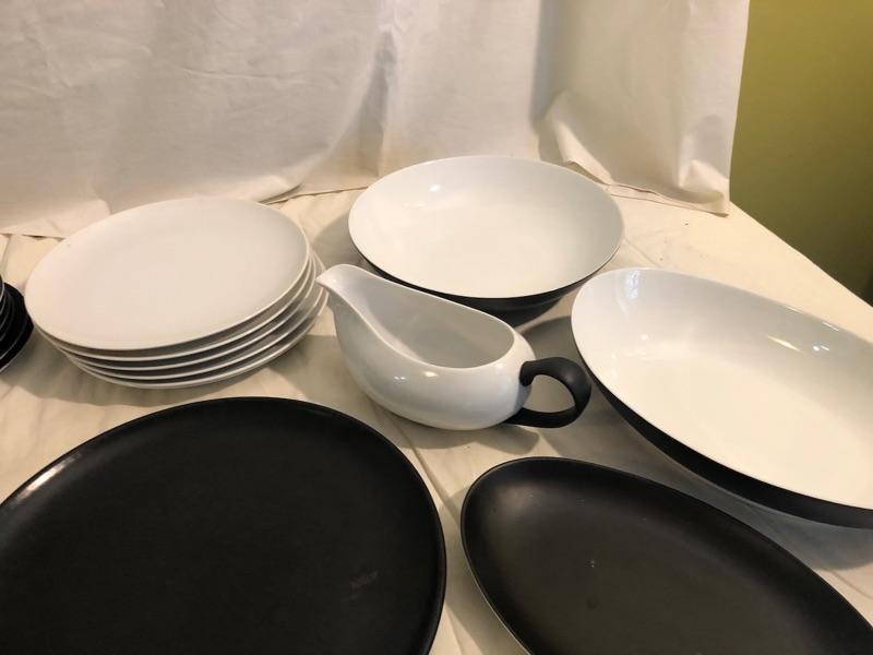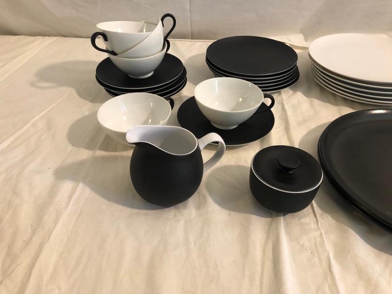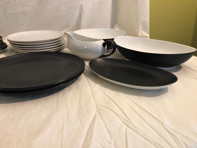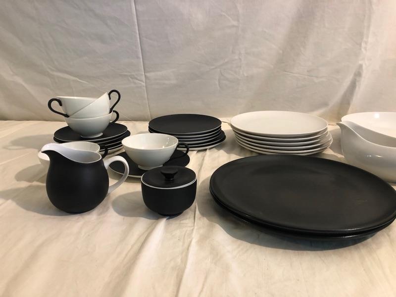 Set of six white dinner place, with 6 black salad plates, 2 large black serving platters a black and white oval serving dish with gravy pitcher, 6 black and white tea cups with matching black and white saucers, 2 serving black and white serving bowls and matching creamer and sugar Kyoto
