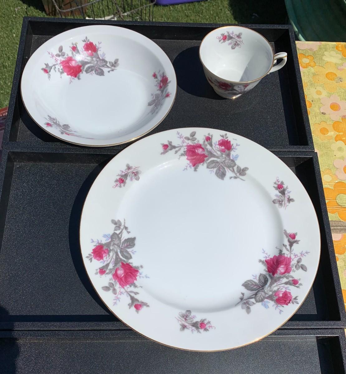 Kyoto China: Grey Rose. 2 boxes with 8 settings plus serving pieces. Not checked for chips.