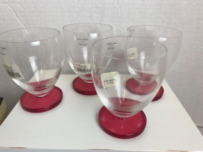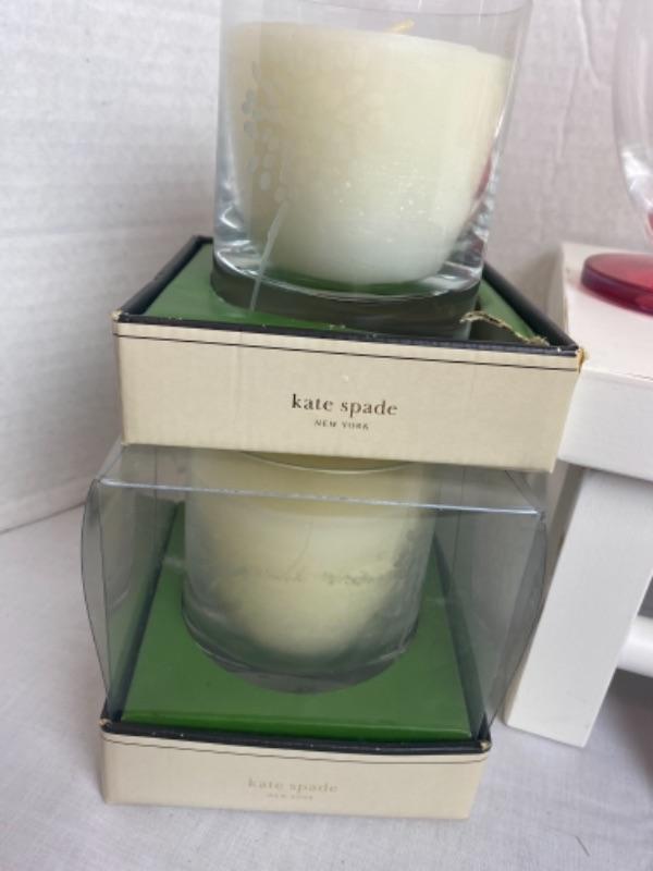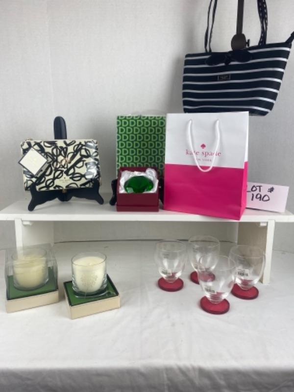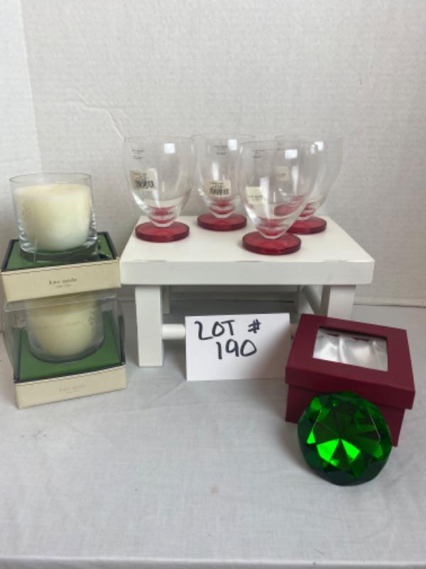 Kate Spade Lot of Glasses Gramercy Park Pink , 2 Kate spade candles, with emerald colored diamond shaped paper weight