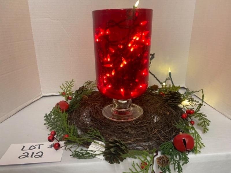 Red lighted Hurricane globe with decor